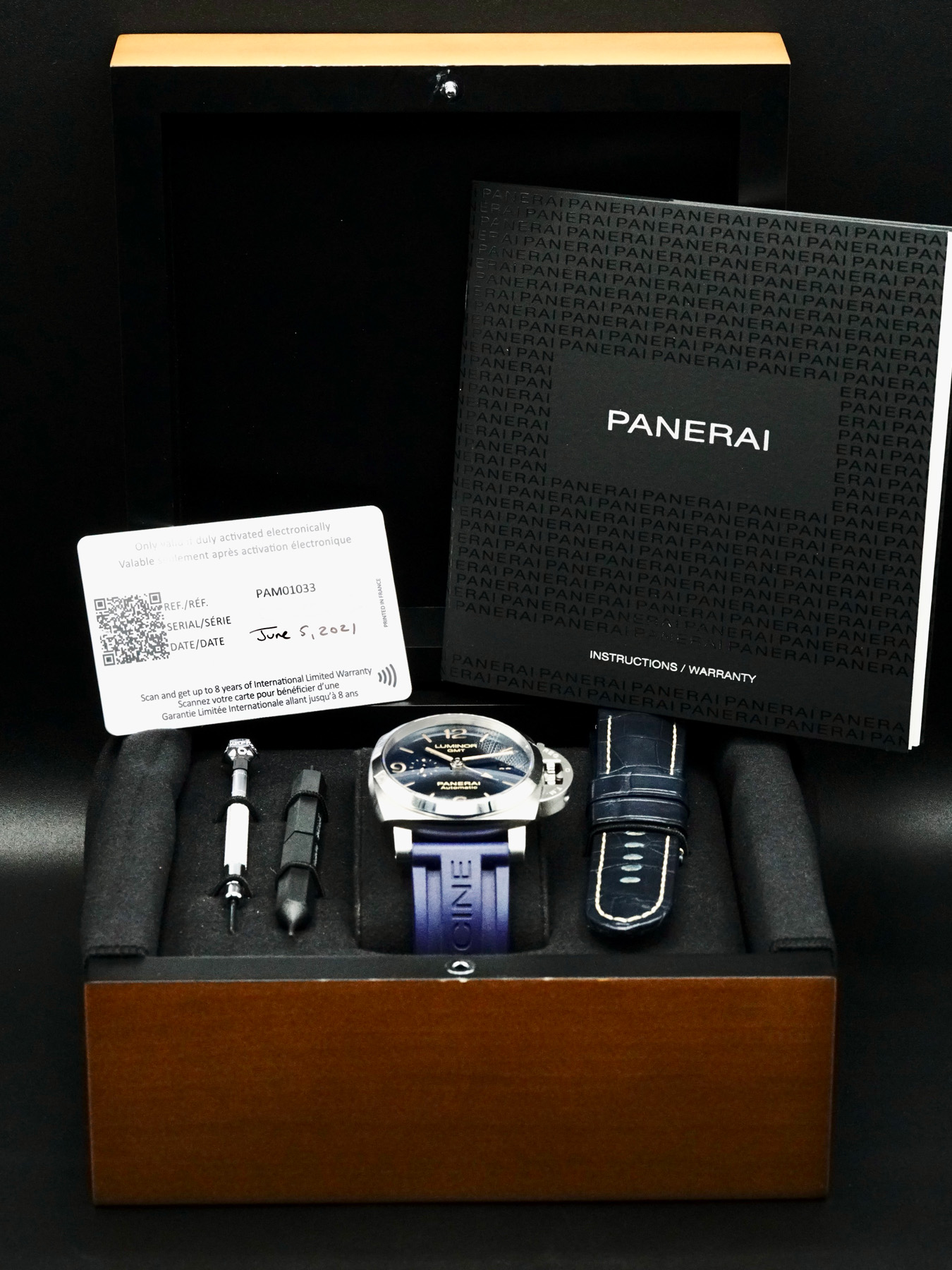 This Panerai PAM01033 Luminor GMT 1950s is in EXCELLENT condition. This watch includes its Original Box, Original Papers and Warranty Card Dated 2021. Extra blue leather strap. This watch has been fully authenticated and certified by Exquisite Timepieces.