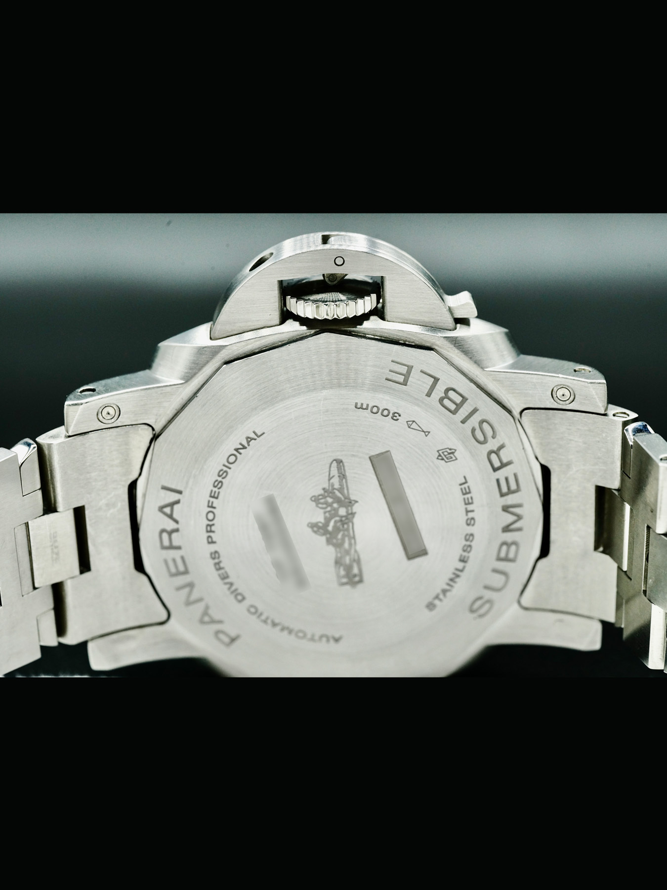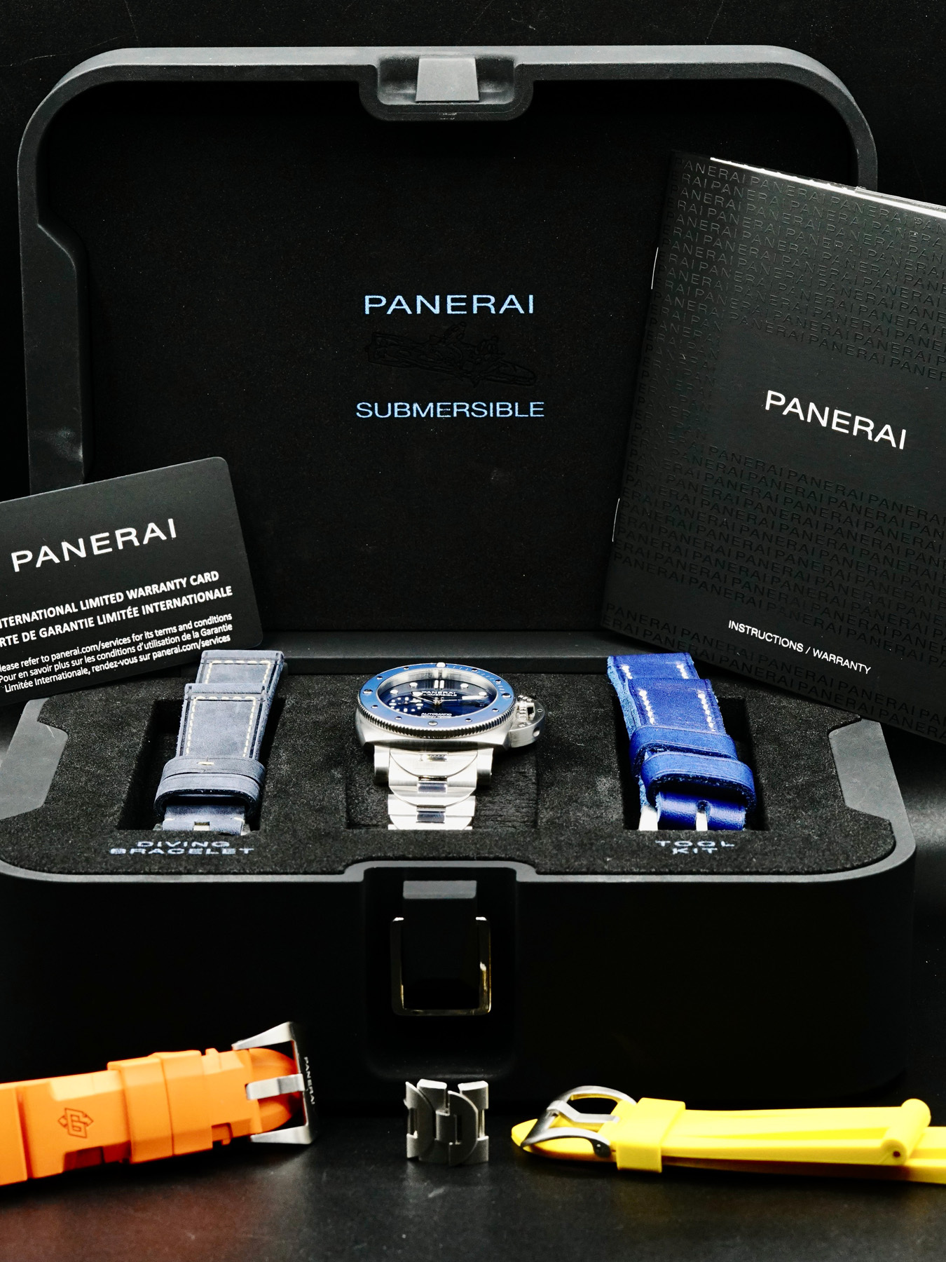 This Panerai Submersible Blue Notte PAM01068 is in EXCELLENT condition. it has boxes and papers. International limited warranty card dated for June 2021. Extra orange rubber strap, yellow rubber strap, blue leather strap, navy blue leather strap, and stainless steel bracelet links