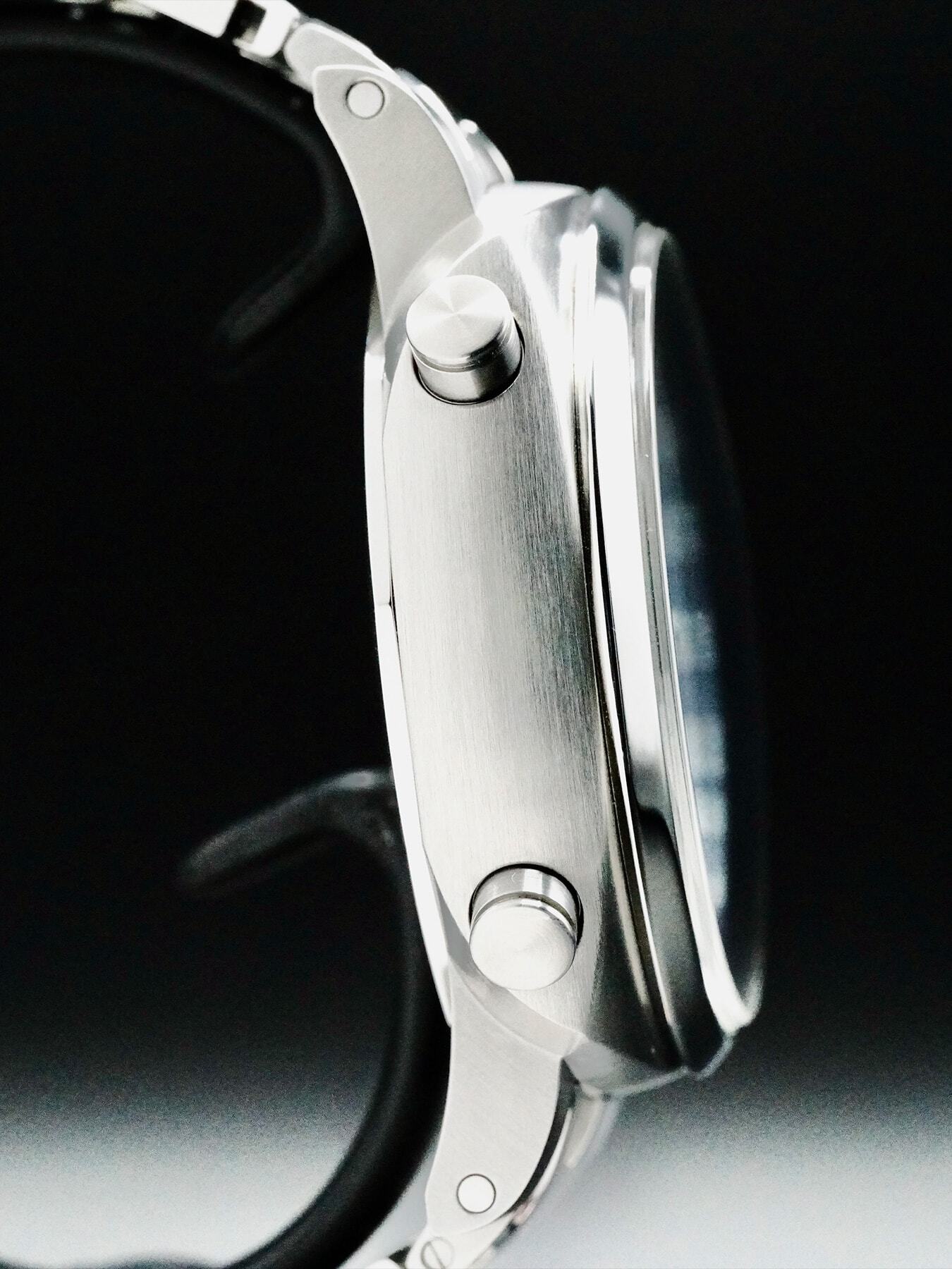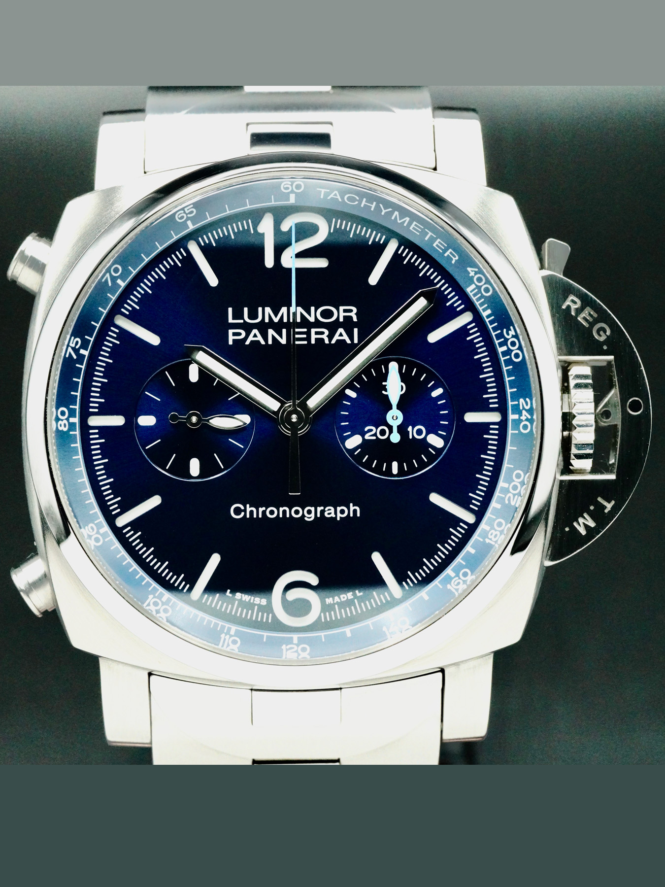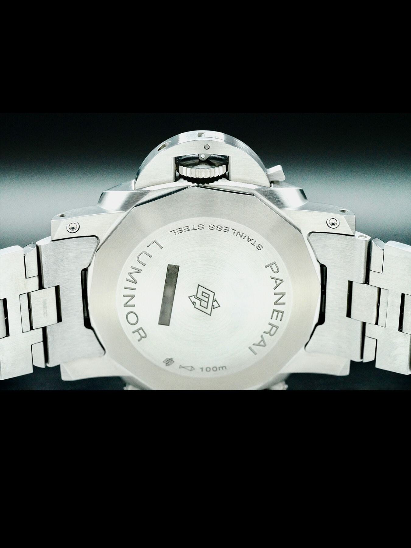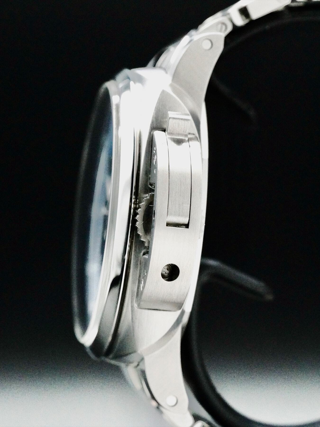 This Panerai Luminor Chrono features a 44mm stainless steel case with a solid case back on a stainless steel bracelet. This watch also sports a blue sun-brushed dial with luminous hands and index dial markers covered by scratch resistant sapphire crystal.