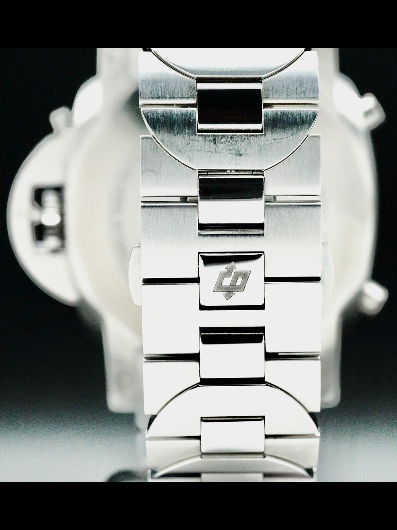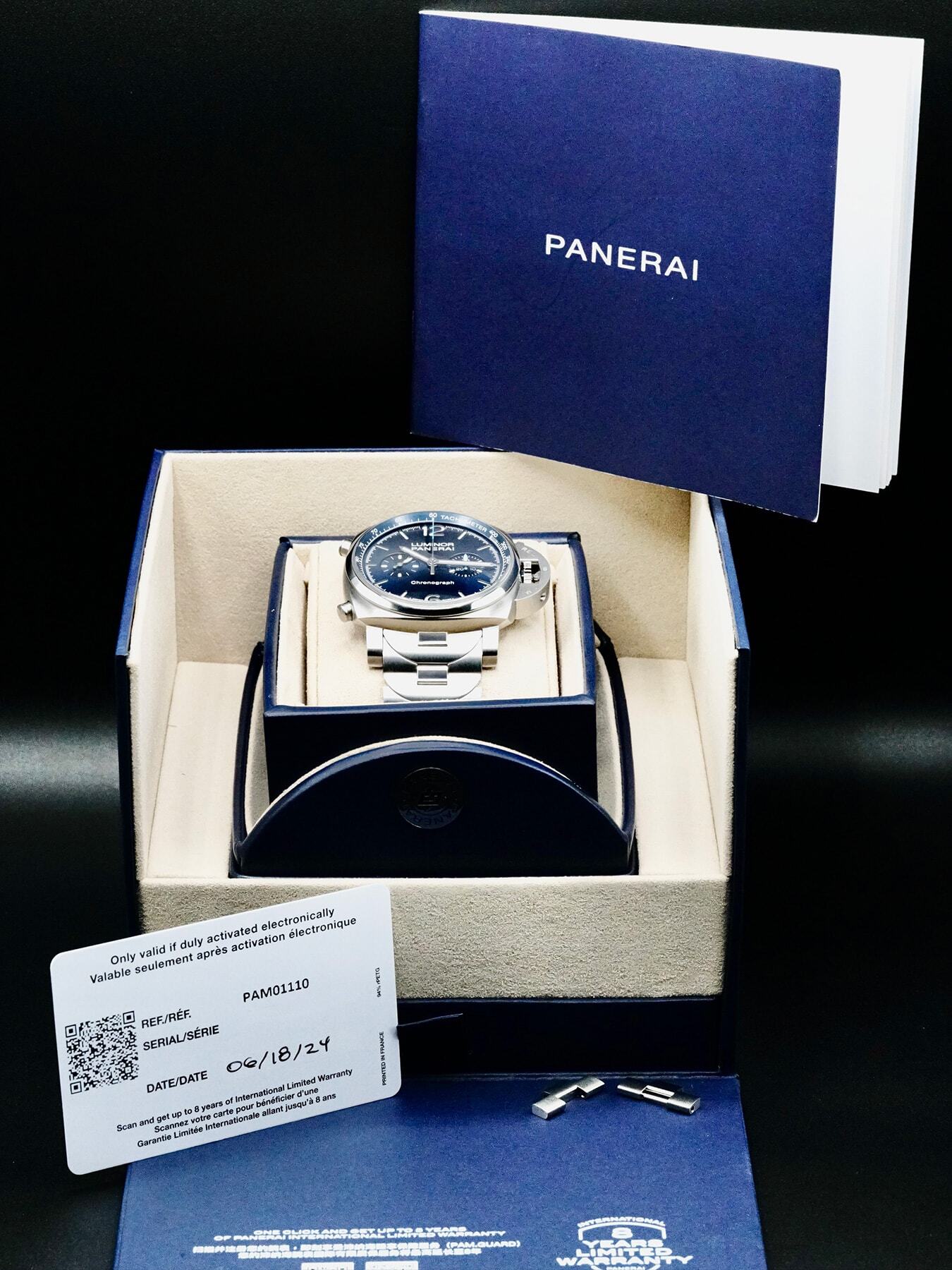 This Panerai Luminor Chrono PAM0110 is in EXCELLENT condition. This watch includes its original box, instructions, and warranty card dated for 2024. Extra stainless steel bracelet links. This watch has been fully authenticated and certified by Exquisite Timepieces.