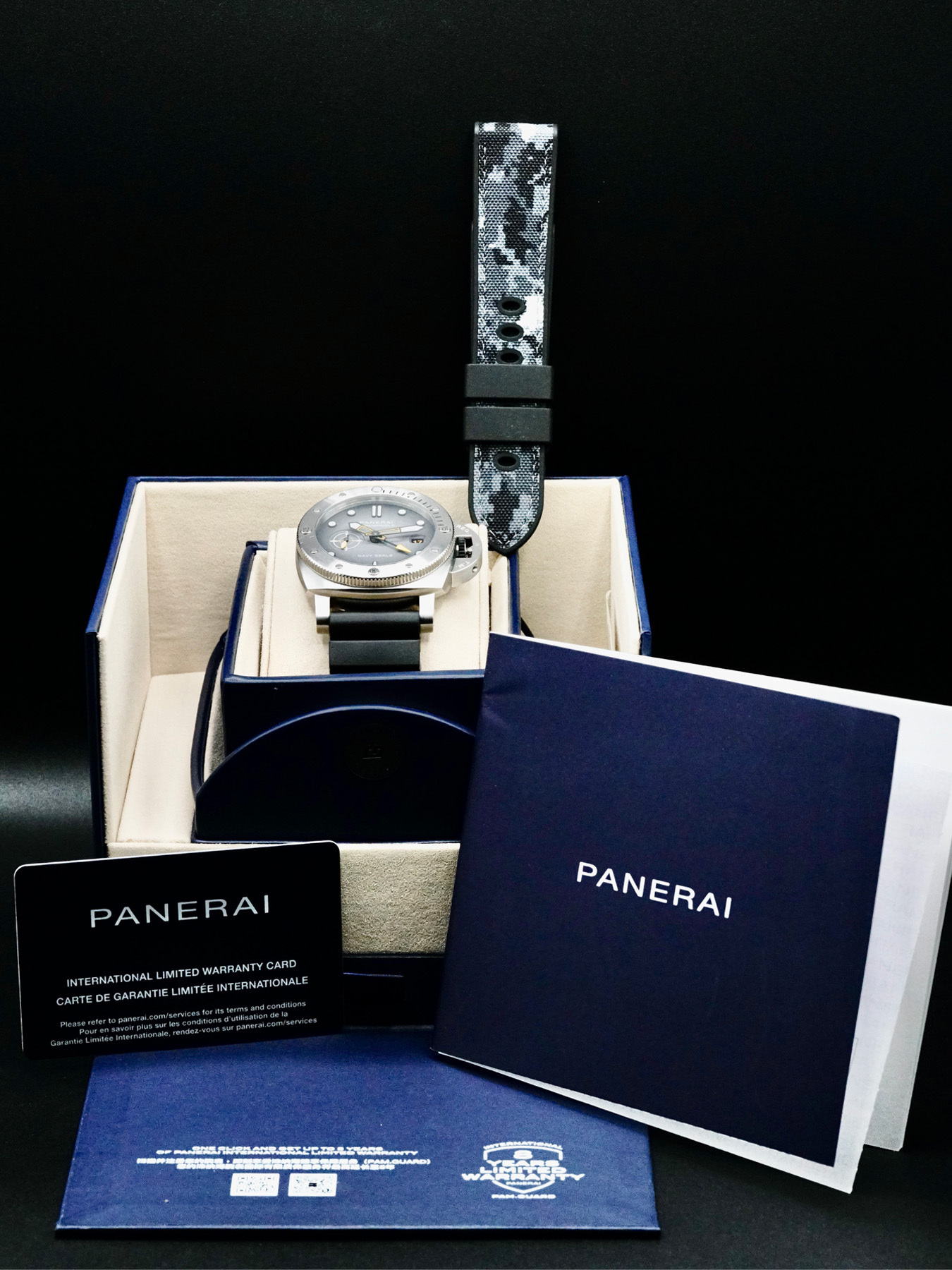 This Panerai PAM01323 Navy Seals is in GREAT condition. This watch includes original box, instructions booklet, warranty card dated 2023. Extra blue camouflage rubber strap. This watch has been fully authenticated and certified by Exquisite Timepieces.