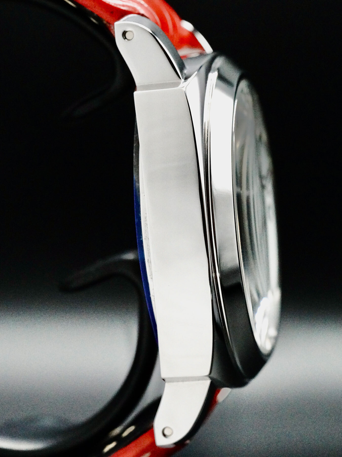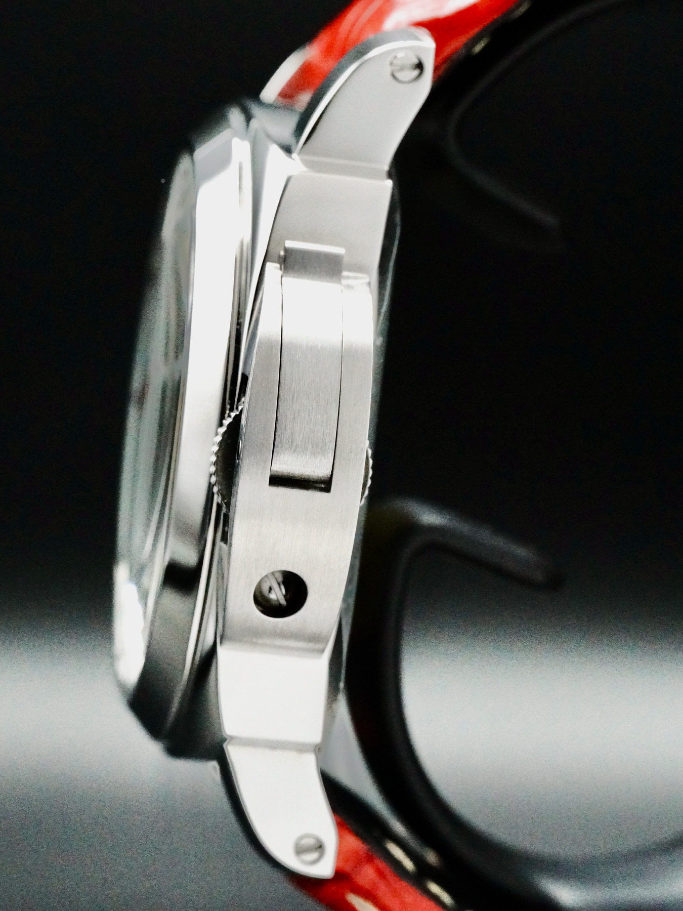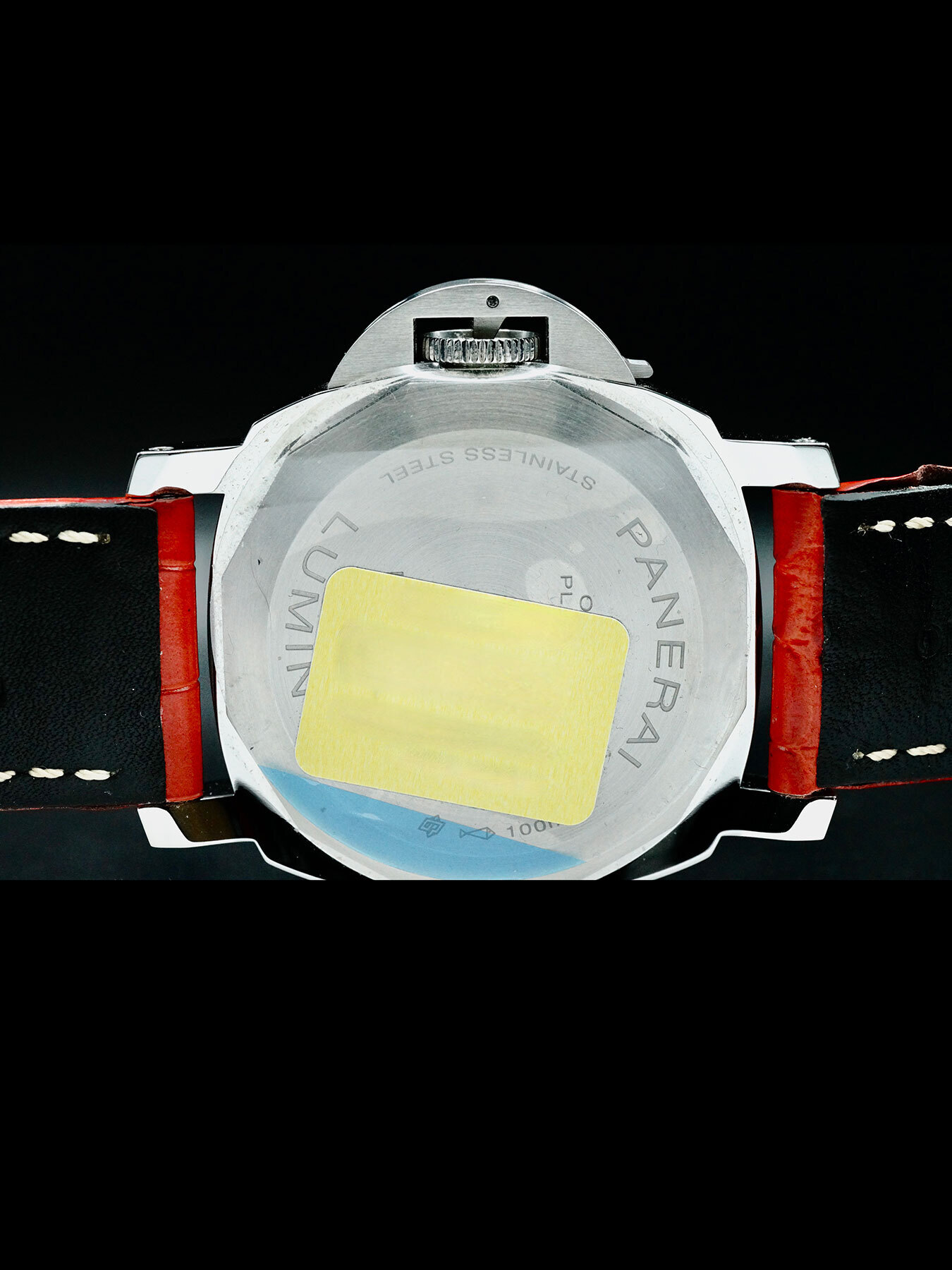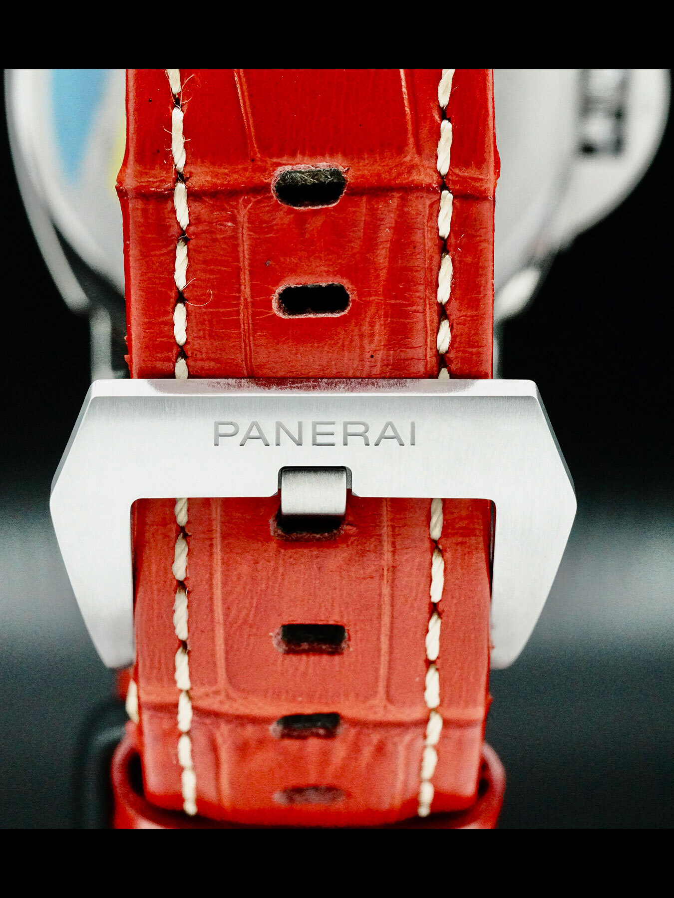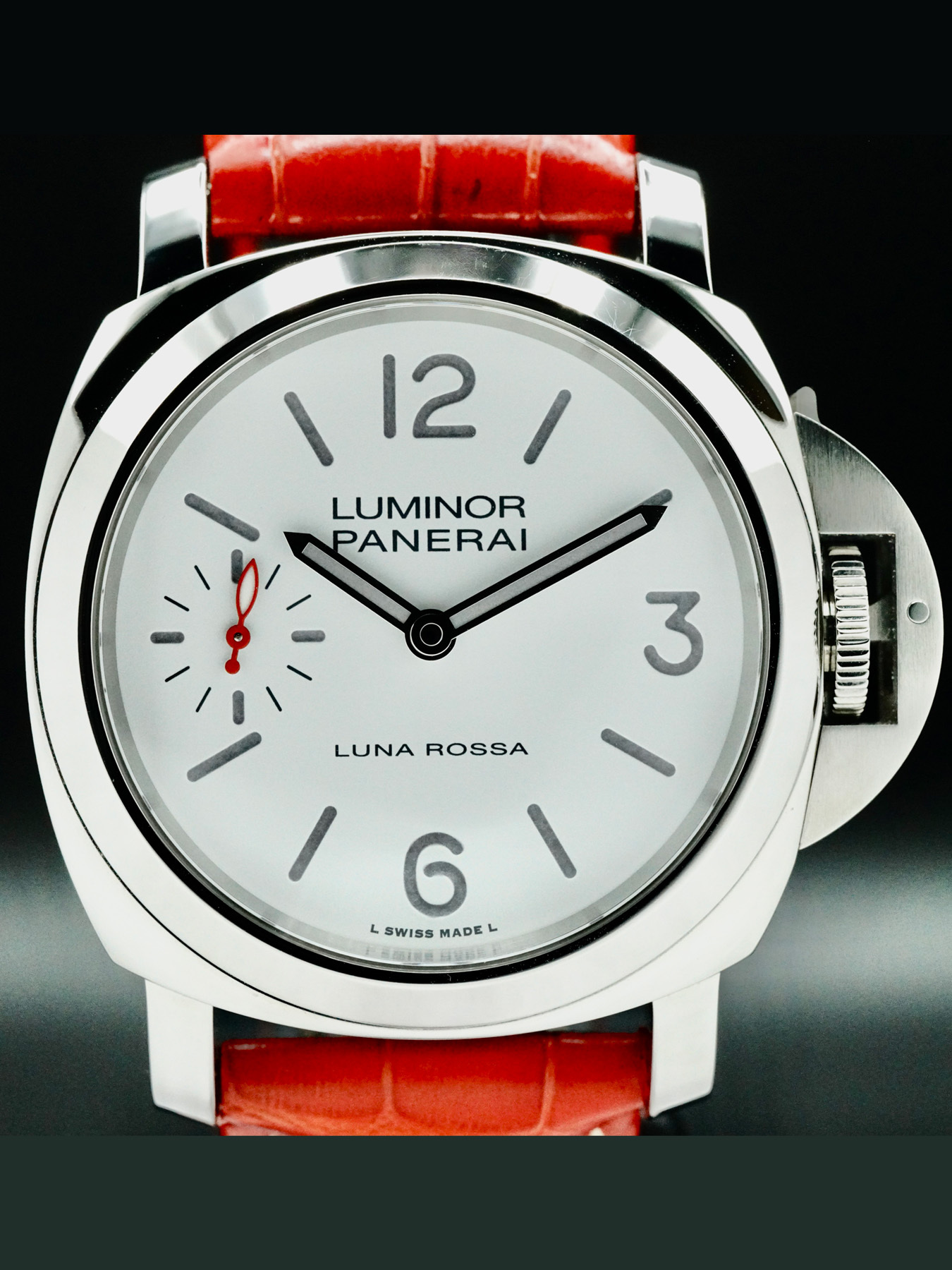 This Panerai Luminor Luna Rossa features a 44mm polished stainless steel case with a solid case back on a red leather strap. This watch also sports a white dial with luminous hands and index dial markers covered by scratch resistant sapphire crystal.