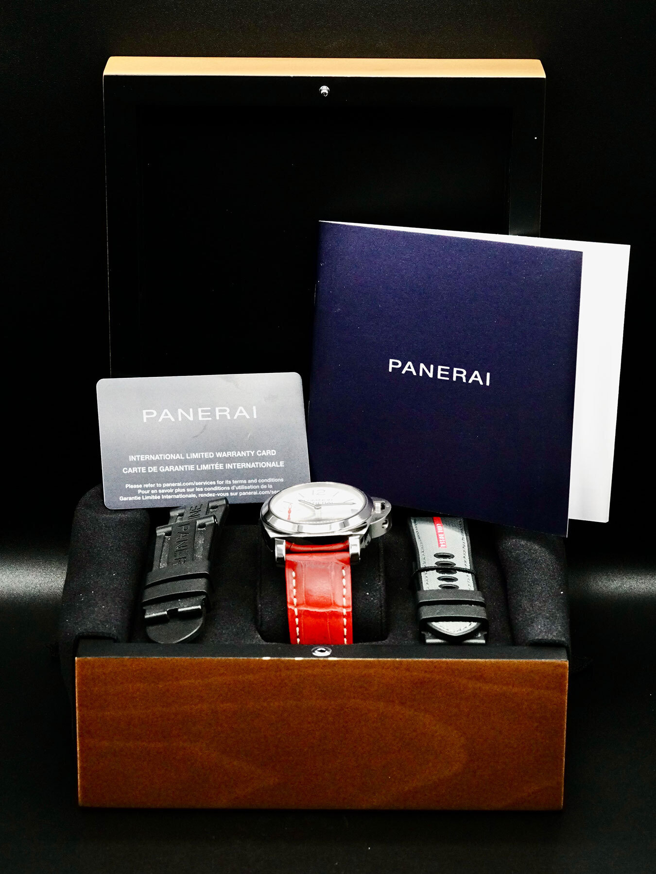 This Panerai Luminor Luna Rossa PAM01342 is in GREAT condition. This watch includes its original box, instructions, and international limited warranty card dated for December 2022. Extra black rubber strap and grey rubber strap. This watch has been fully authenticated and certified by Exquisite Timepieces.