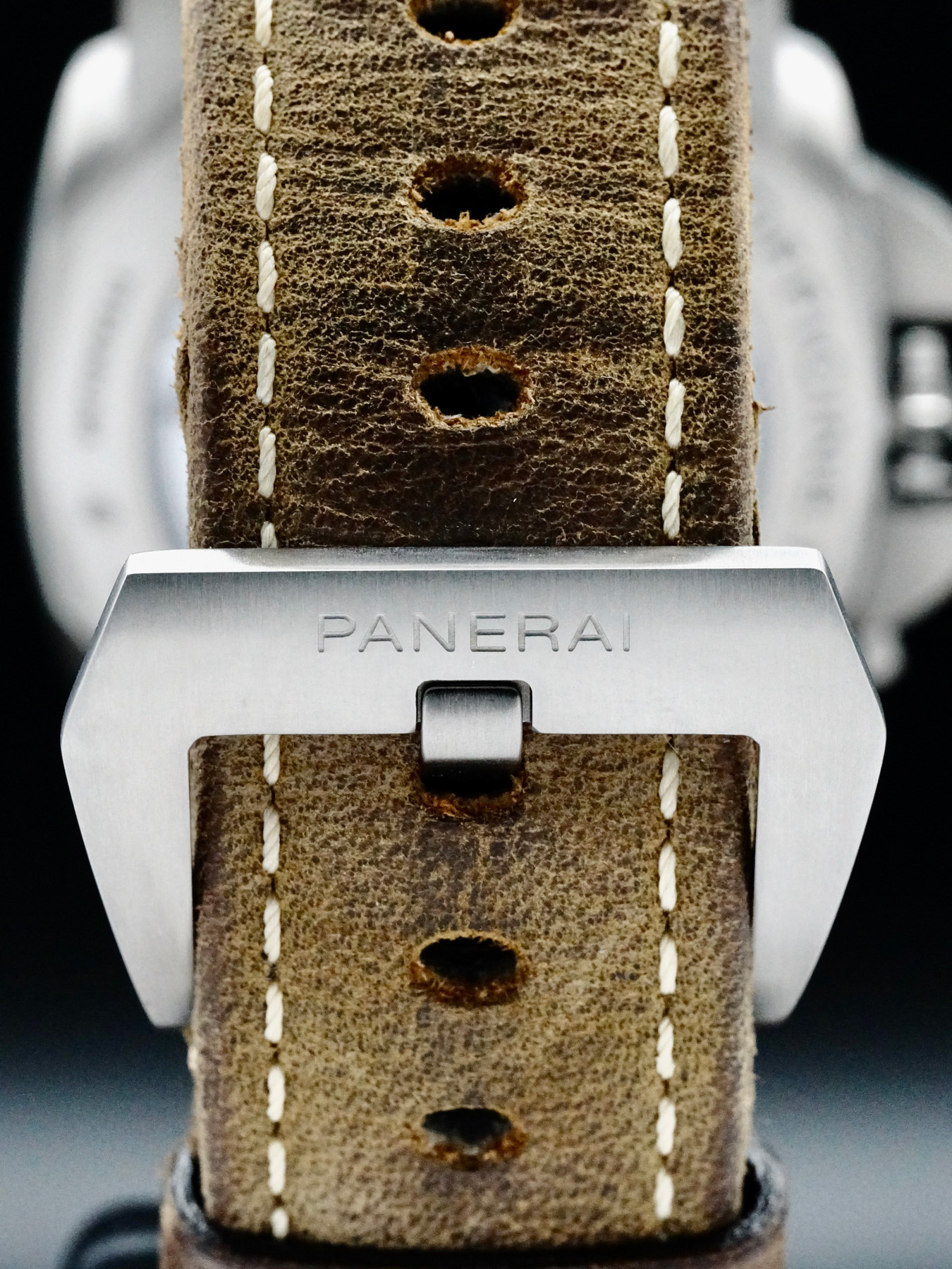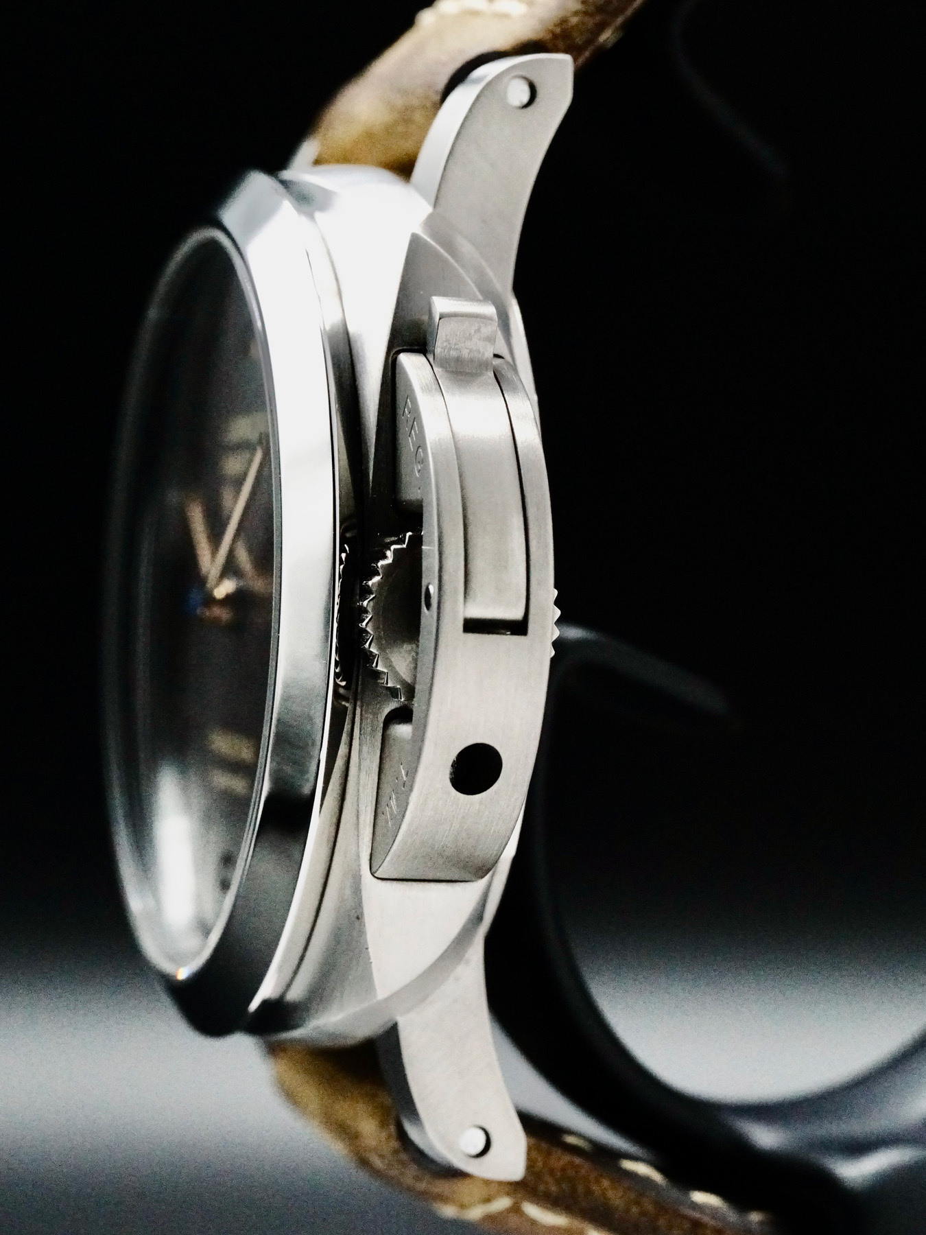 This Panerai Luminor Marina features a 44mm brushed titanium case with an exhibition case back on a brown leather strap. This watch also sports a brown dial with luminous hands and index dial markers covered by scratch resistant sapphire crystal.