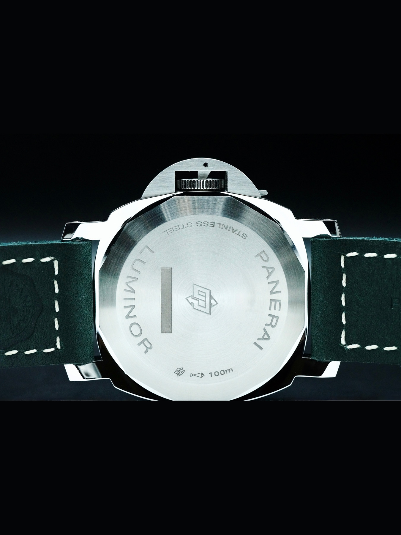Hand-wound Mechanical movement powered by Panerai Caliber P.6000 with a power reserve of approximately 3 days. Water resistance up to 100 meters.