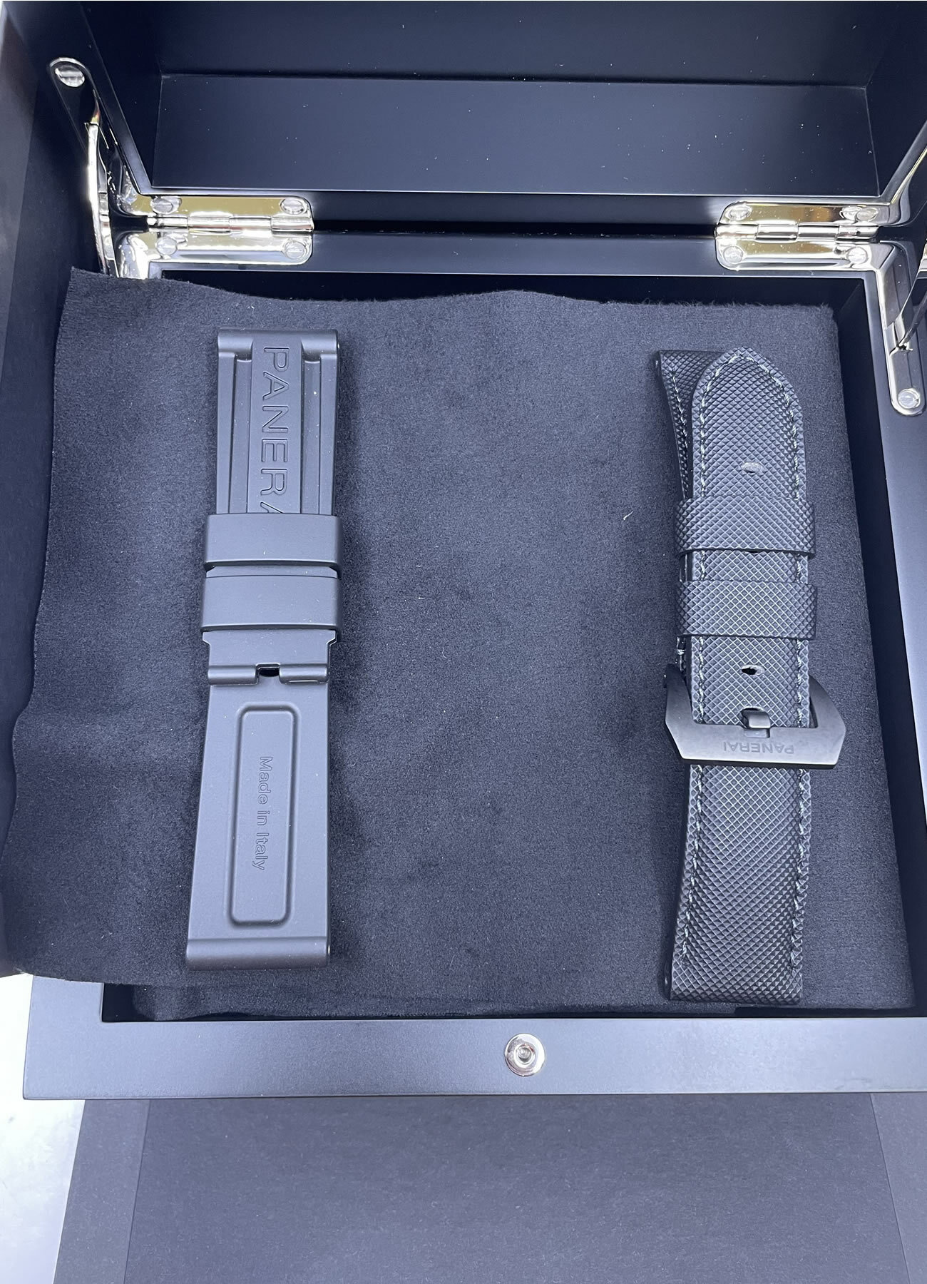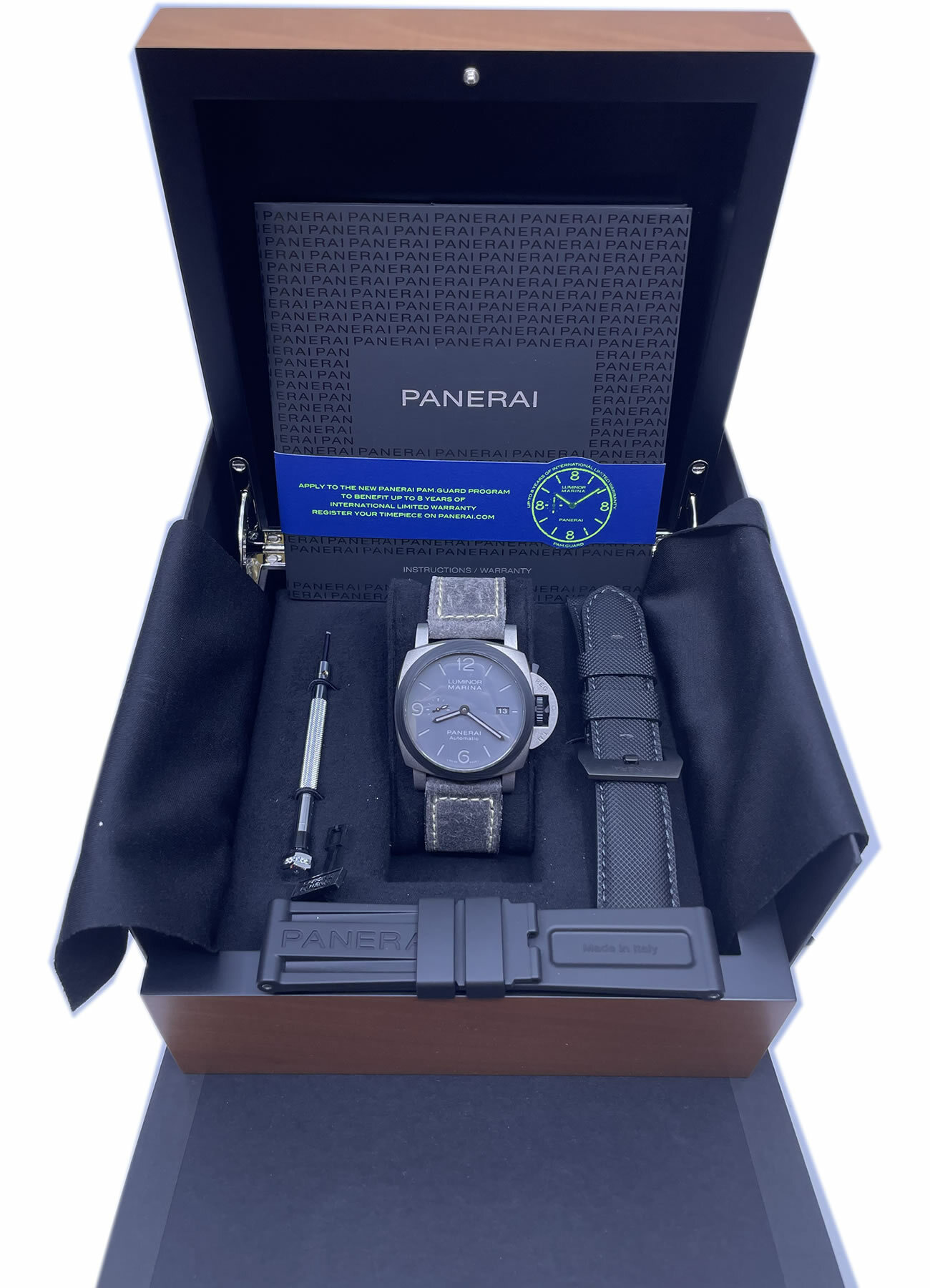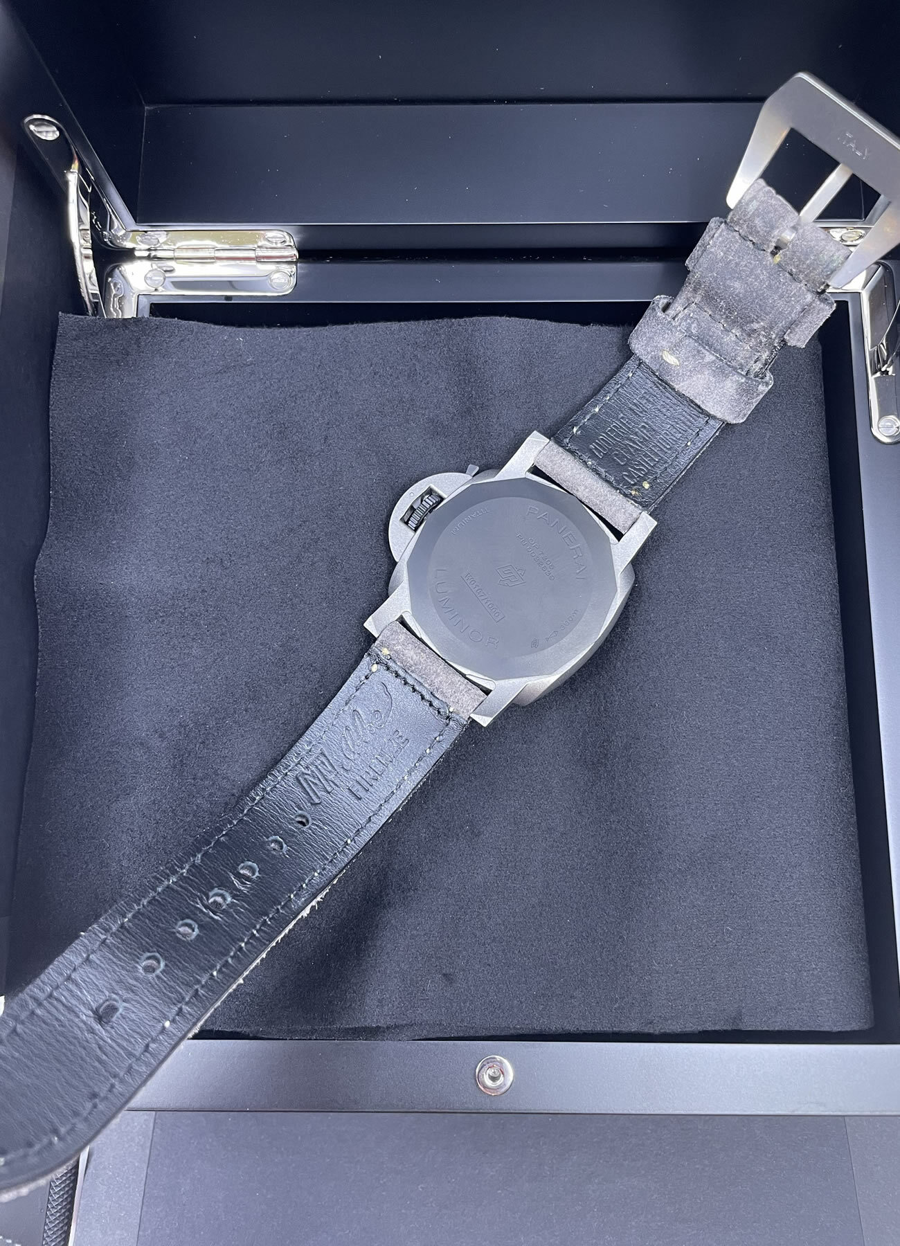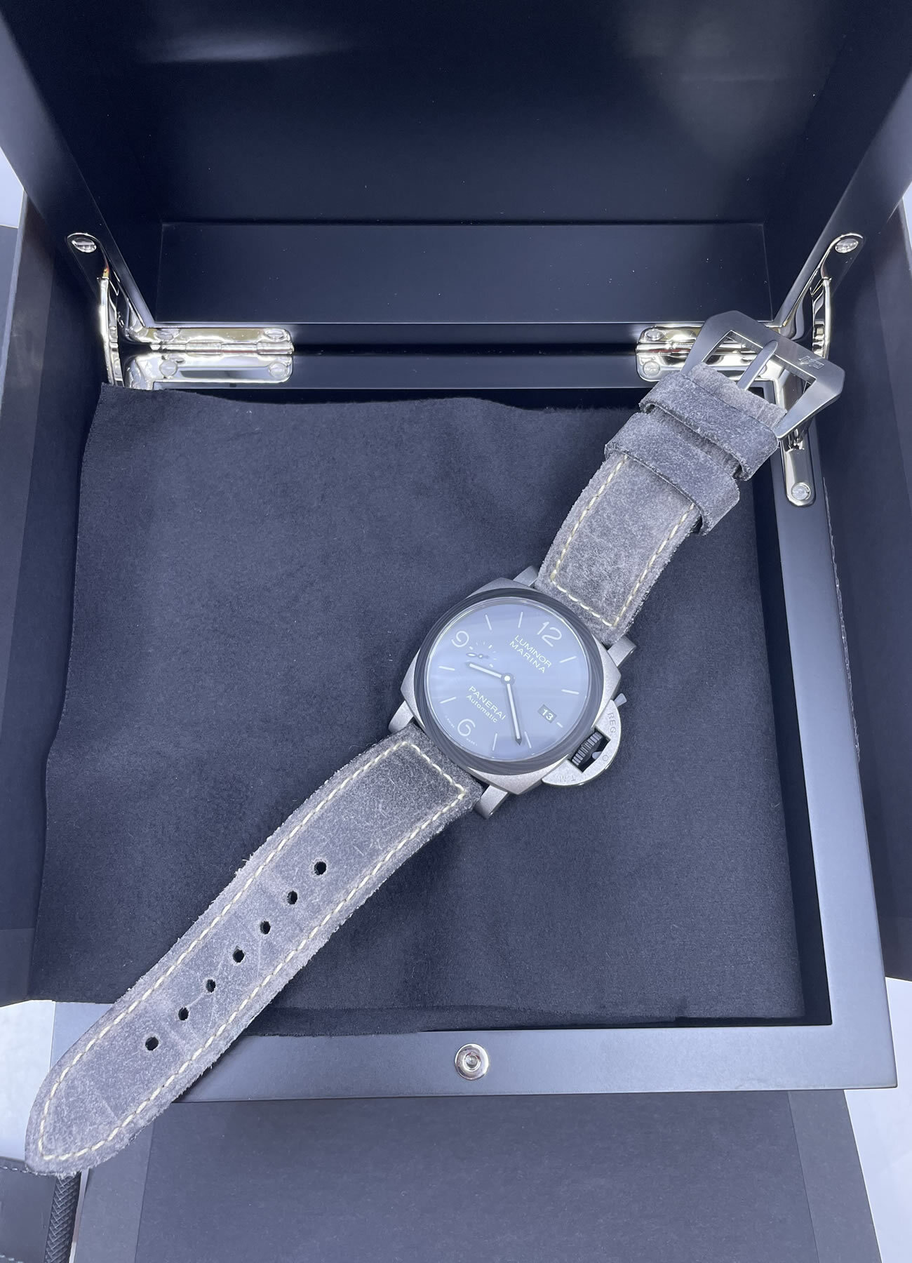 - This timepiece features a 44mm titanium case paired with a high quality leather strap. It showcases a distinctive grey dial and is powered by a precise automatic winding movement. The watch is designed with a water resistance of up to 300m.