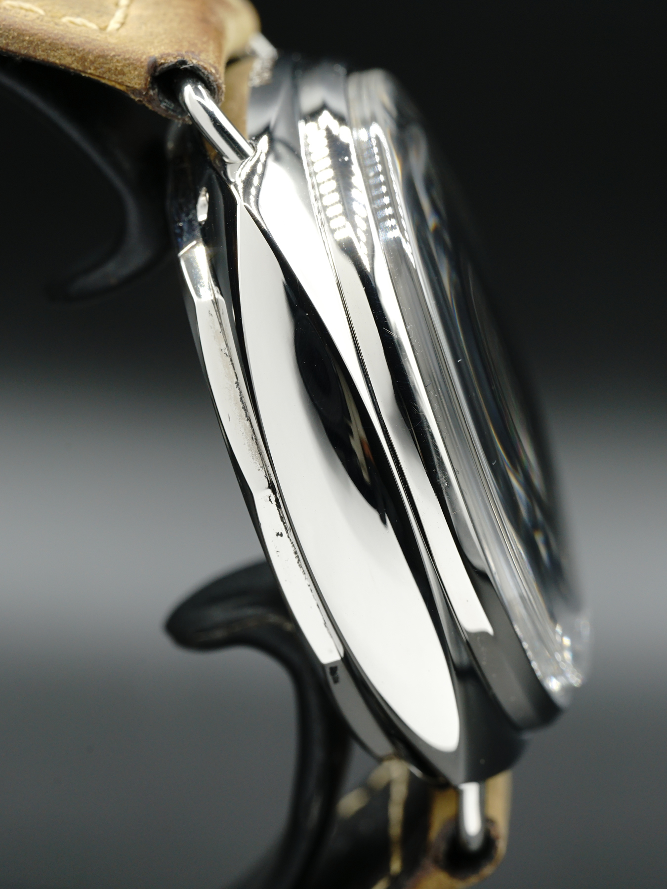 - This timepiece features a 47mm steel case paired with a high quality leather strap. It showcases a distinctive black dial and is powered by a precise manual winding movement. The watch is designed with a water resistance of up to 100M.