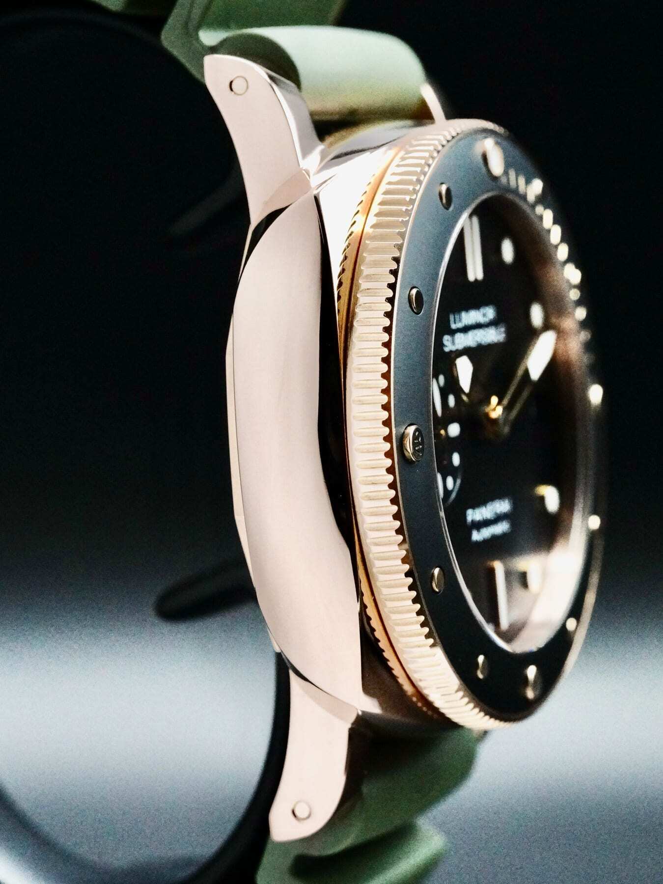 This Panerai Submersible features a 42mm 18k rose gold case with a display case back on a green rubber strap. This watch also sports a black dial with luminous hands and index dial markers covered by scratch resistant sapphire crystal.