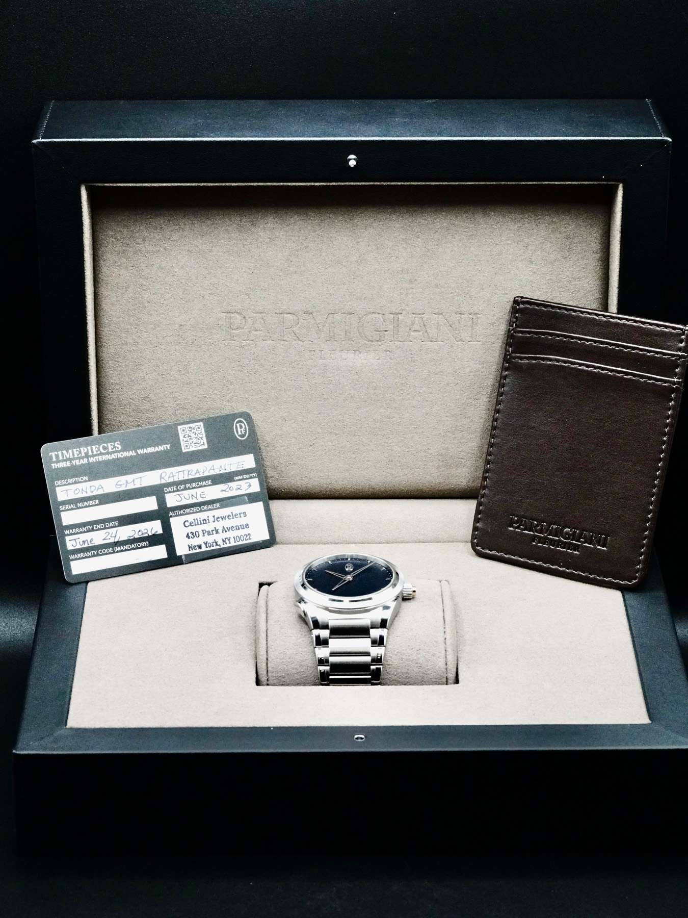 This Parmigiani Fleuirer PFC905-1020001-100182 Tonda PF GMT Rattrapante is in EXCELLENT condition. This watch includes its Original Box, Original Papers and Warranty Card dated 2023. This watch has been fully authenticated and certified by Exquisite Timepieces.