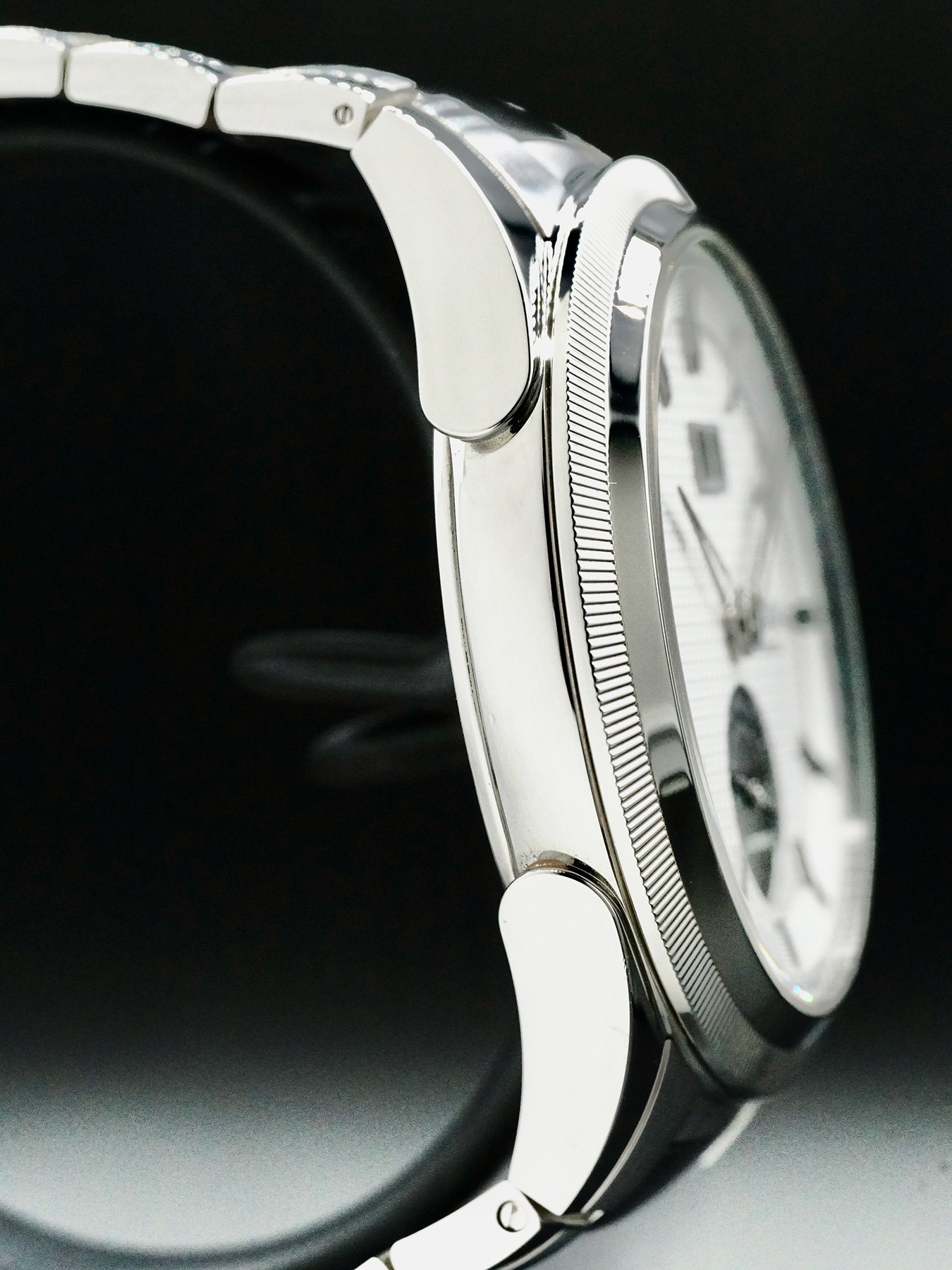 This Parmigiani Fleurier Tonda GT features a 42mm stainless steel case with a display case back on a stainless steel bracelet. This watch also sports a silver & black dial with luminous hands and index dial markers covered by scratch resistant sapphire crystal.