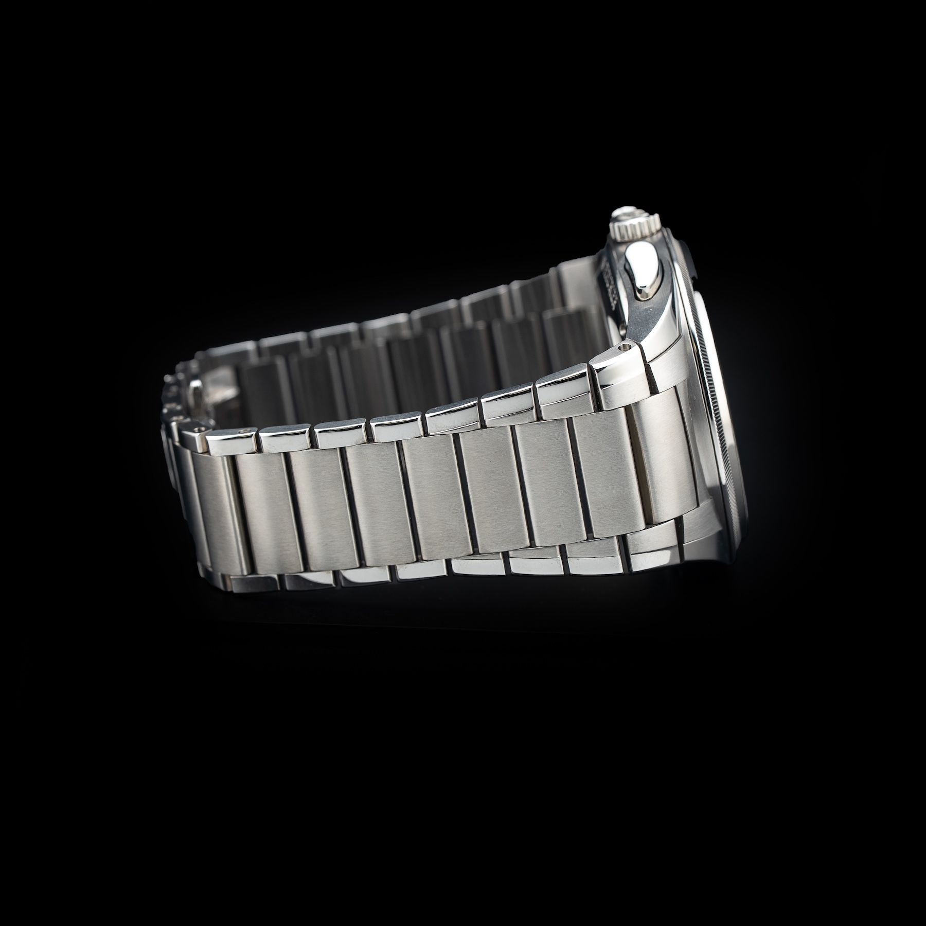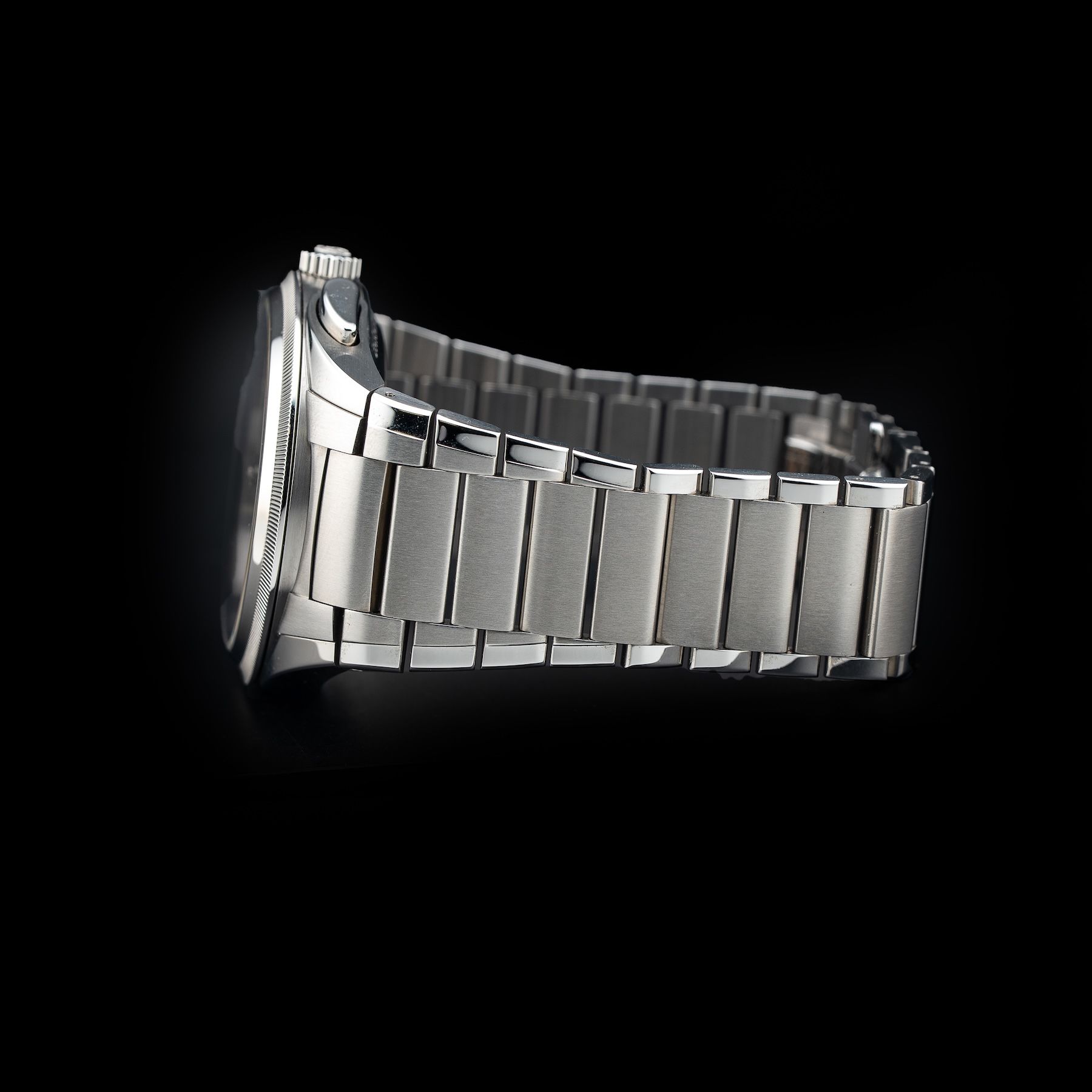This watch features a 42mm stainless steel case on stainless steel bracelet. This watch also sports a blue dial. Powered by a mechanical automatic movement. Water resistance up to 100 meters.