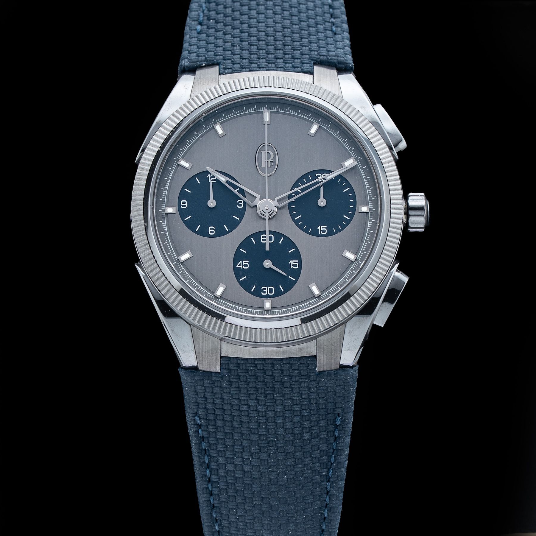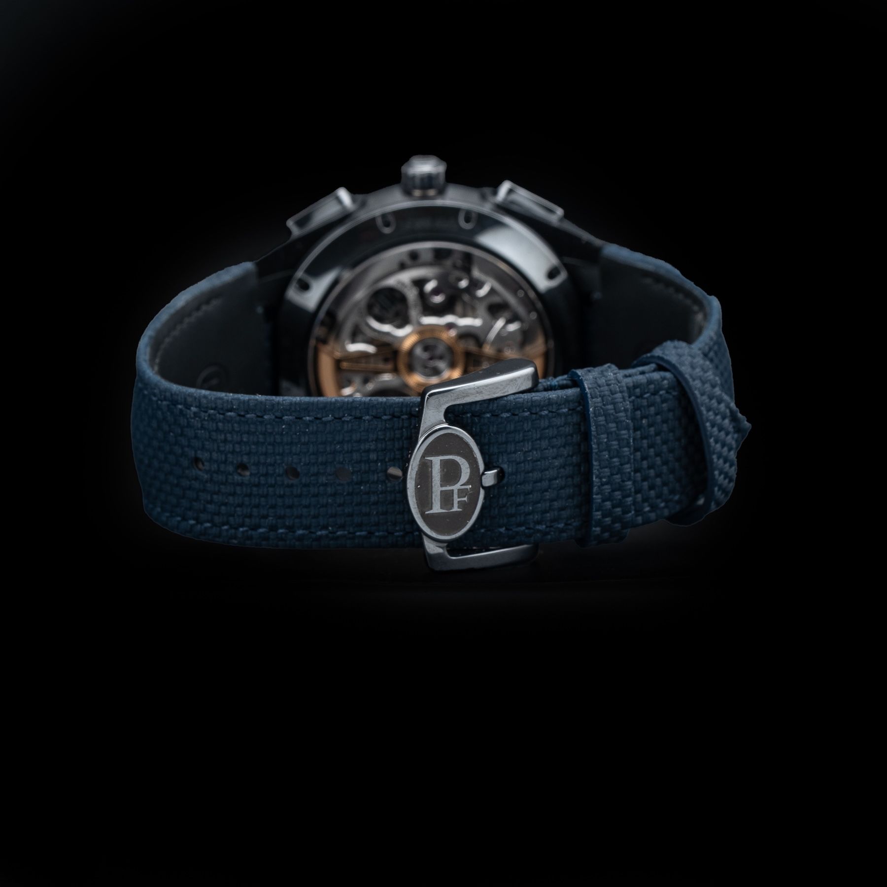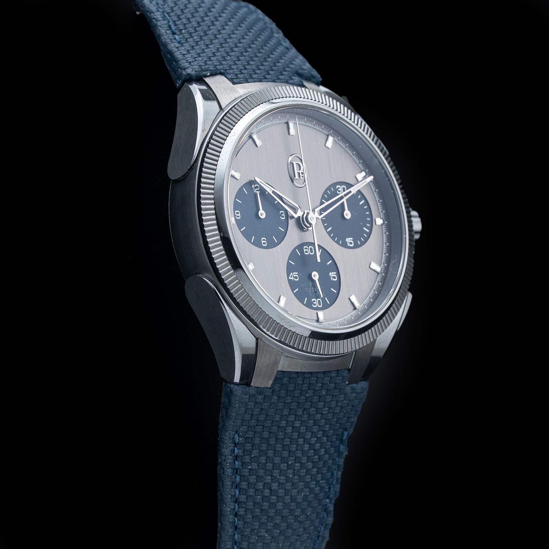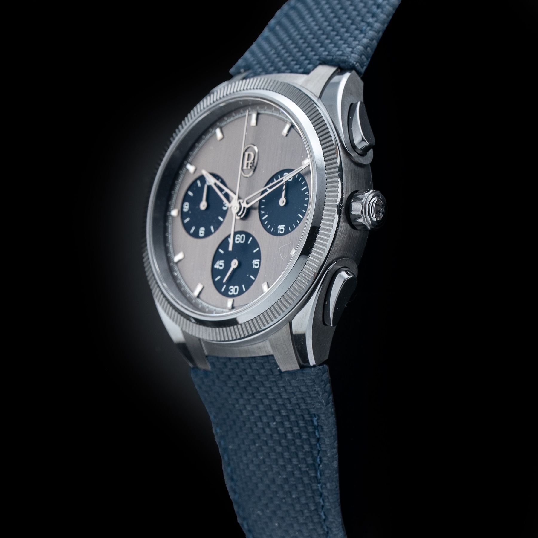 TONDA PF SPORT CHRONOGRAPH IN ULTRA-CERMET - MILANO BLUEParmigiani Fleurier is the first watchmaker to craft a complete case in Cermet. From the case middle to the pushers, every detail has been designed with extreme precision, requiring a full day of assembly and 72 distinct components. Its satin-polished anthracite case subtly captures light, enhancing its modern aesthetic. Cermet’s properties allow it to reflect light uniquely, providing metallic reflections while maintaining minimalist elegance. The dial, treated in Blackor (9-carat gold-nickel deposit), sports a distinctive grey-black hue, enhancing the metallic elegance of the timepiece.