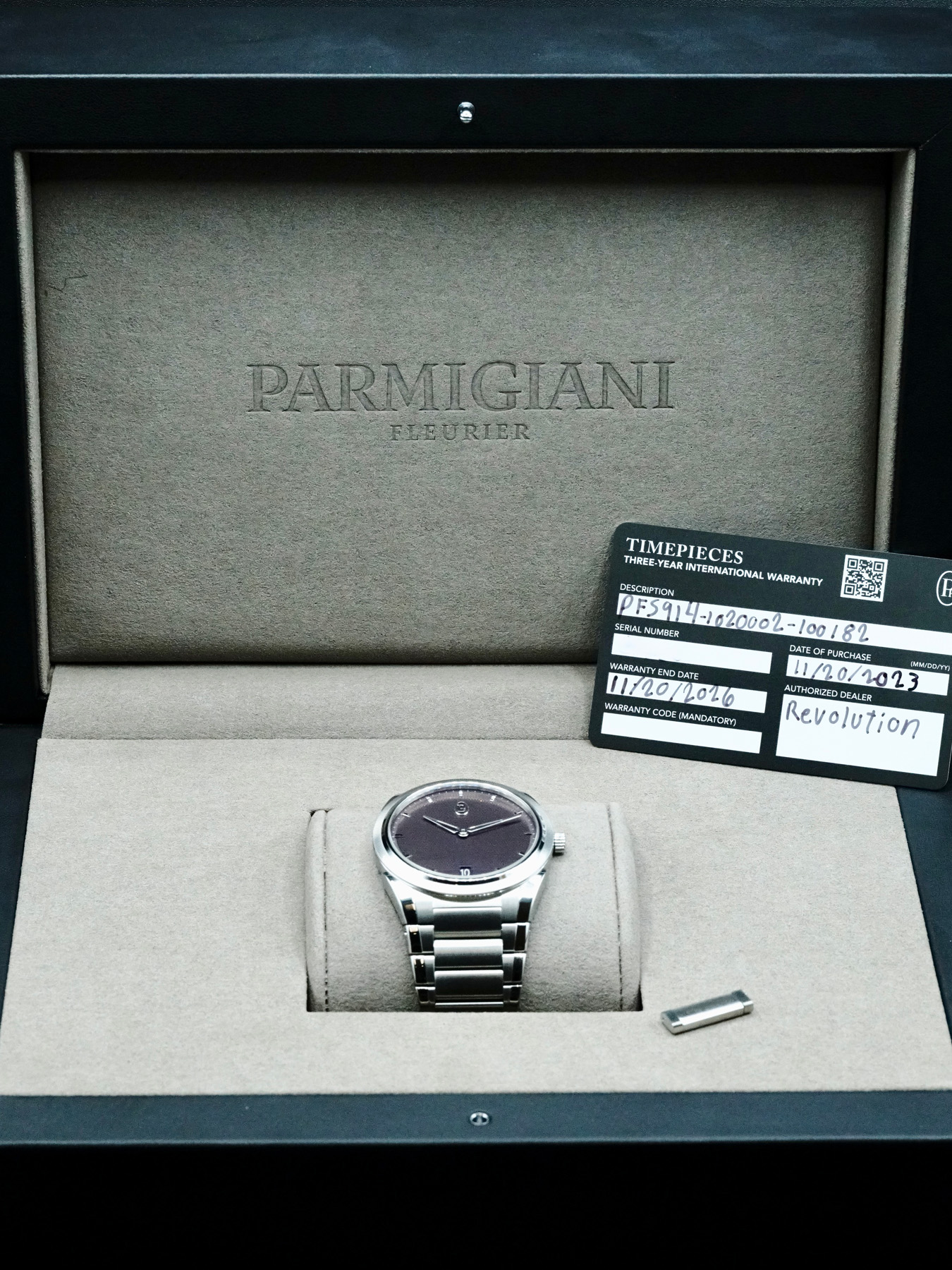 This Parmigiani Fleurier X Revolution Tonda PF Micro Rotor "Purple Reign" PFS914-1020002-100182 is in EXCELLENT condition. This watch includes its original box and warranty card dated for 11/20/2023. Extra bracelet link. This watch has been fully authenticated and certified by Exquisite Timepieces.