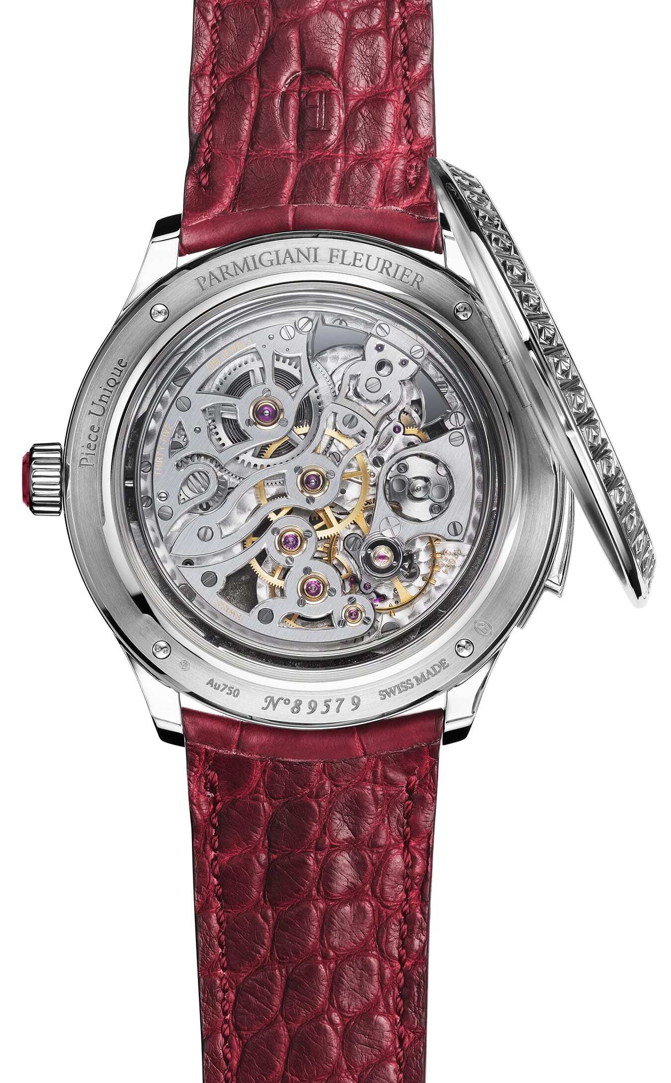 The watch case, cut from white gold blocks, has been hand-engraved with the La Rose Carrée motif, which requires extreme precision and an impressive investment of time. The hinge at 2 o'clock on the reverse side of these unique pieces articulates the hunter caseback, while the outer face bears a large square fractal rose, also hand-engraved and covered with multiple layers of colored enamel. The gongs, spanning one and a half trips around the movement, are cathedral gongs, which brings a deeper, richer sound, a more sustained vibration, and a more palpable intensity. The case has been carefully designed to optimize the sound of the movement, and the caseback and case middle have been redesigned to create resonance pockets and to lighten the white gold mass. A final quality criterion is that the chiming sequence automatically skips dead time, making it an indispensable characteristic for Parmigiani Fleurier.