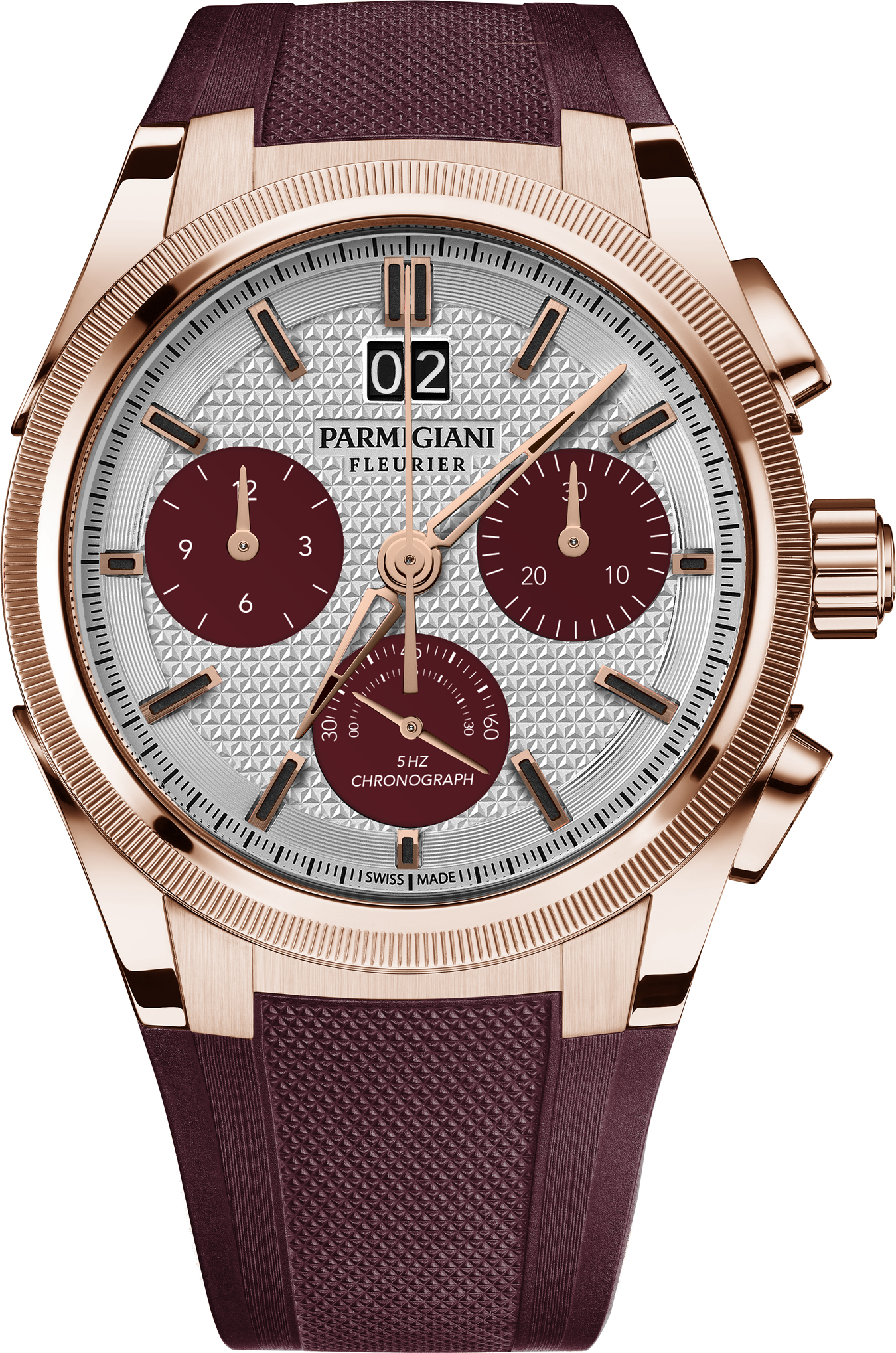The same "Quantum Grey" and "Granata" colour scheme between the counters and the rubber strap also applies to the Tonda GT Chronograph in stainless steel featuring an annual calendar, with a knurled bezel framing the silver-toned guilloché dial in a "triangular hobnail" pattern. This 42 mm diameter chronograph is water-resistant to 100 m and features modern lines with subdials in one or the other of the colours, classically arranged along the 3 o'clock to 9 o'clock axis and topped by the double date window at 12 o'clock. It is equipped with an in-house self-winding chronograph calibre operating at a frequency of 4 Hertz (28,800 vibrations per hour).