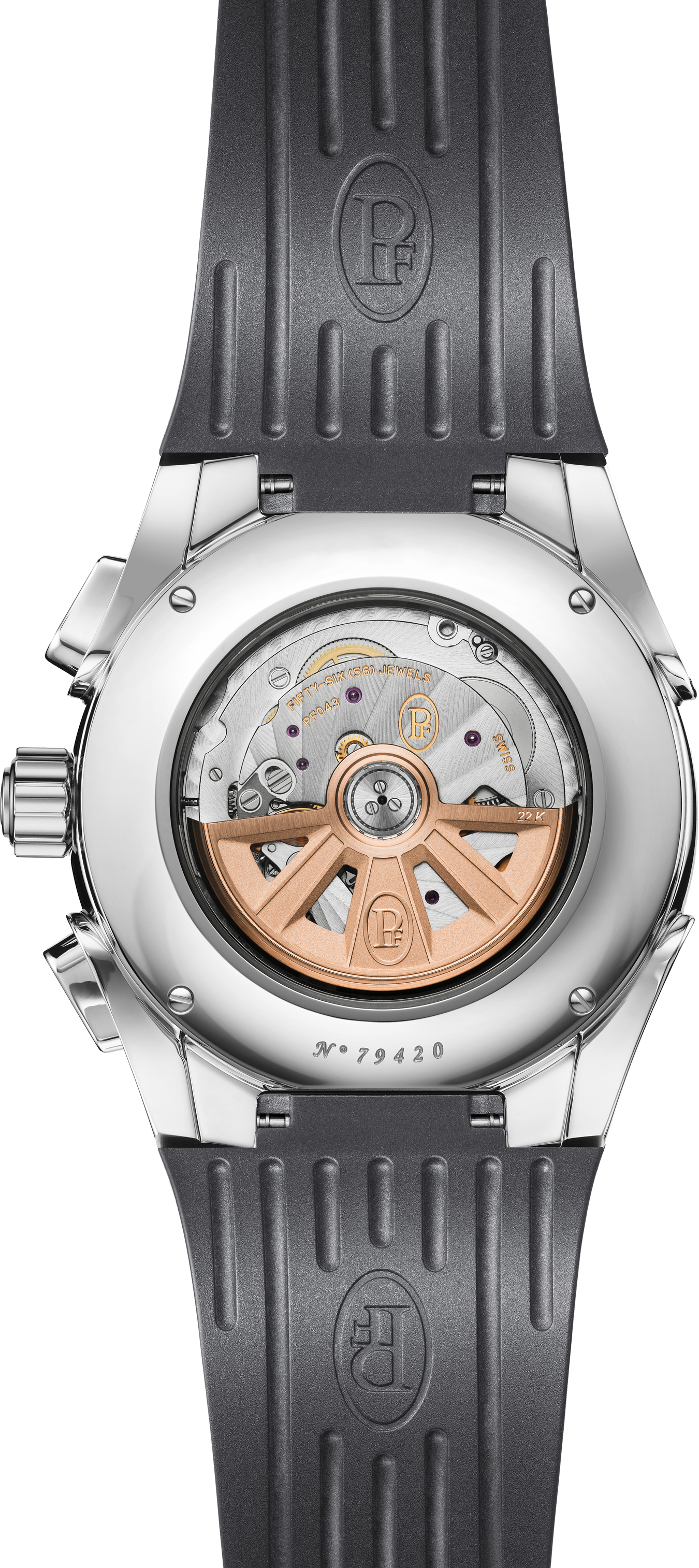 This extremely accomplished chronograph, water-resistant to 100 metres and equipped with the distinctive finely knurled and polished bezel, is fitted with a deep red or grey rubber strap matching the colour of the subdials and secured by an 18ct rose gold folding clasp.