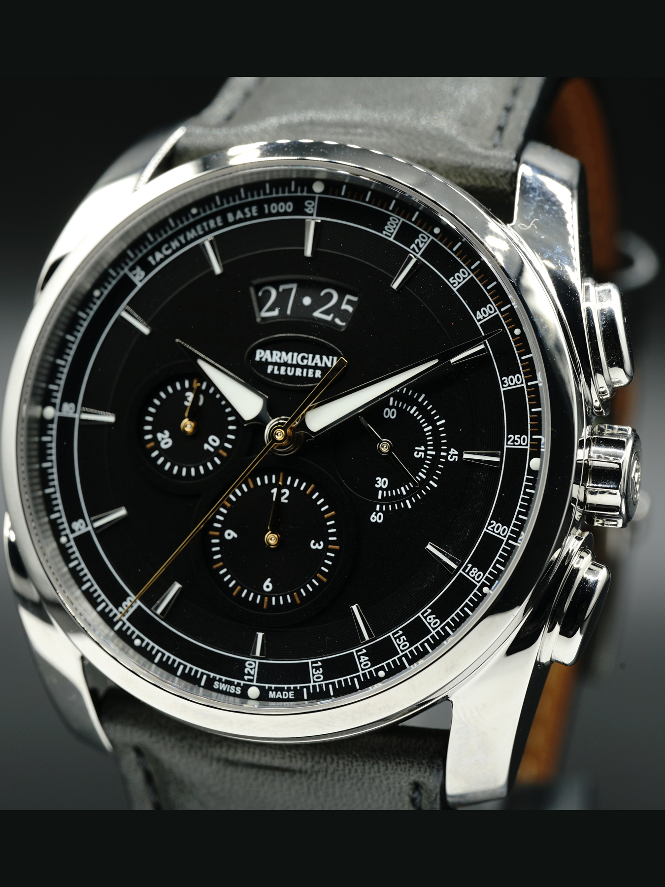 Volume work and attention to almost imperceptible detail add to the personality of this piece. One such example is the red number "1" on the date, a subtle yet effective touch which Parmigiani Fleurier has reinstated on the Métrographe. The tachometer scale calls for high-speed action and adds another dynamic to the design.