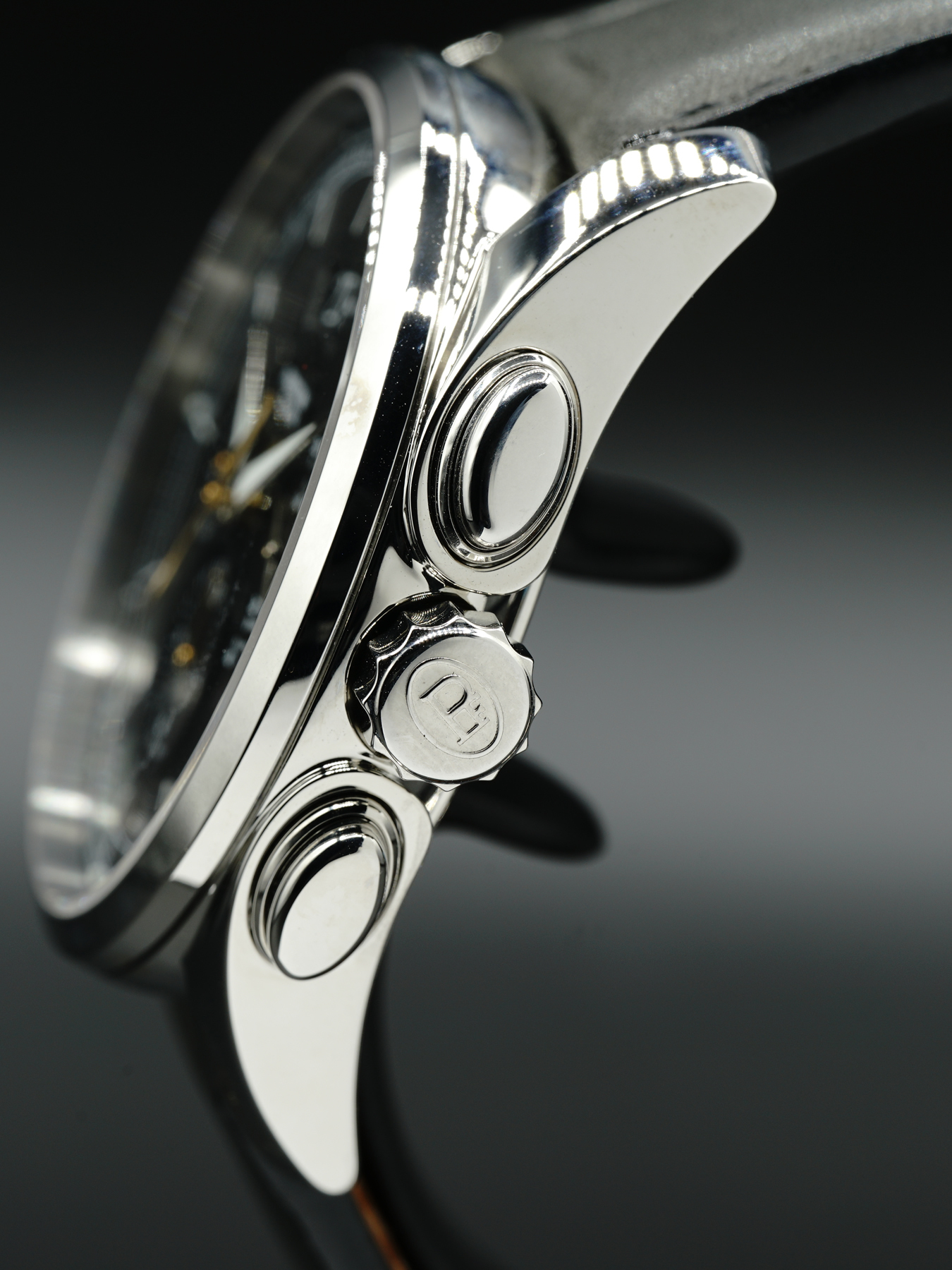 The Métrographe is powered by the PF315 self-winding movement with an additional chronograph module. The bridges are decorated with "Côtes de Genève". It is available with a choice of two different straps: an elegant and lightweight leather option and a steel version that exudes sport chic.