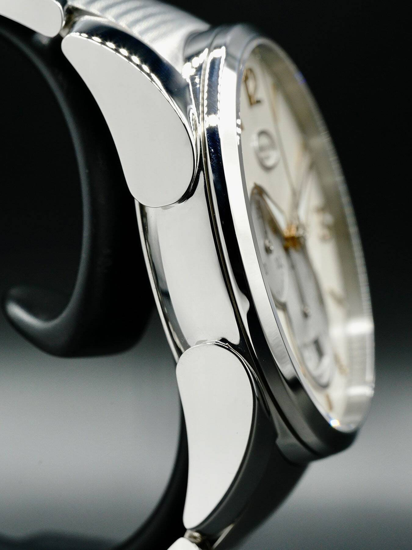 This Parmigiani Fleurier Tonda Metrographe features a 40mm stainless steel case with a transparent sapphire case back on a brushed & polished stainless steel bracelet. This watch also sports a white dial with rose gold-tone hands and Arabic numeral/index dial markers covered by scratch resistant sapphire crystal.