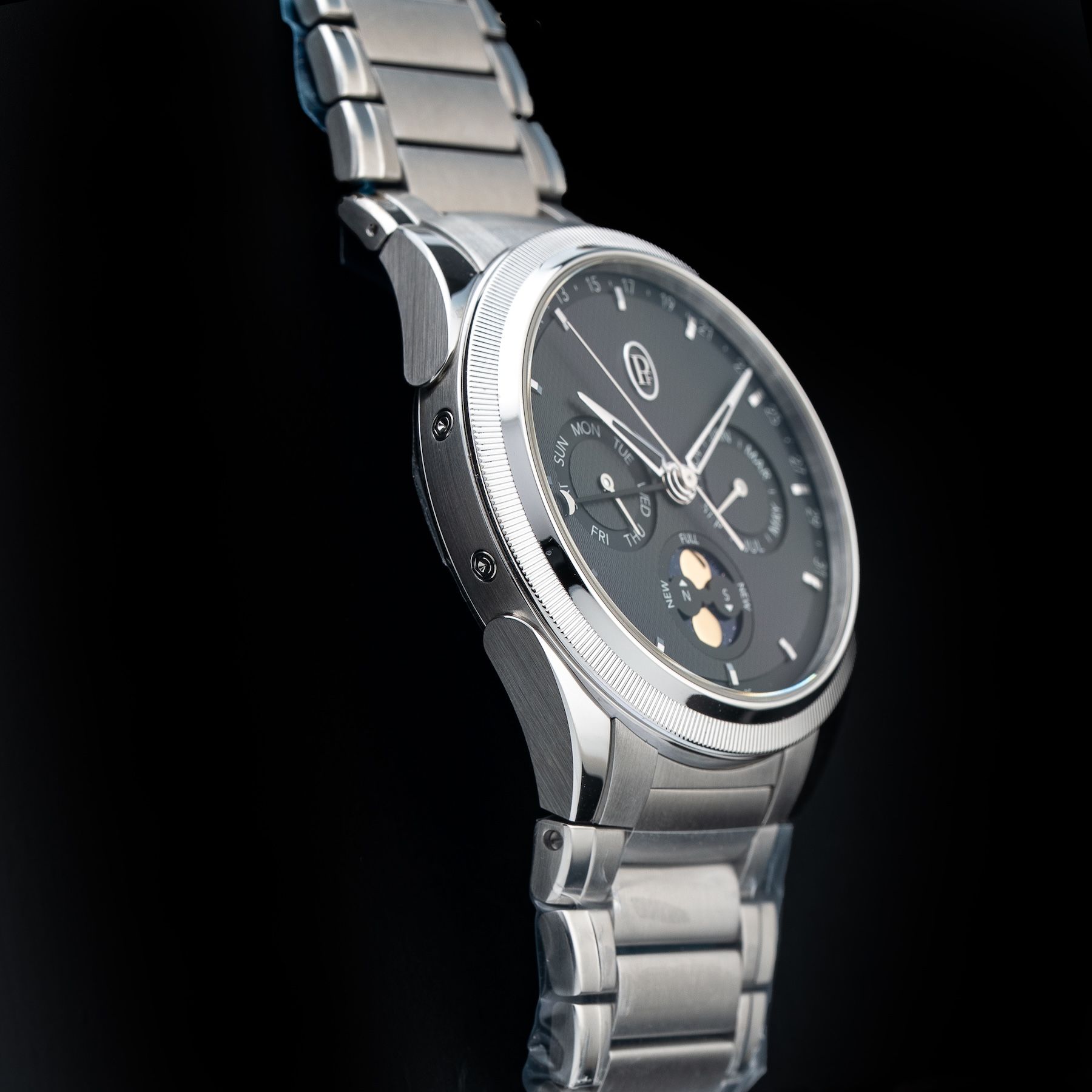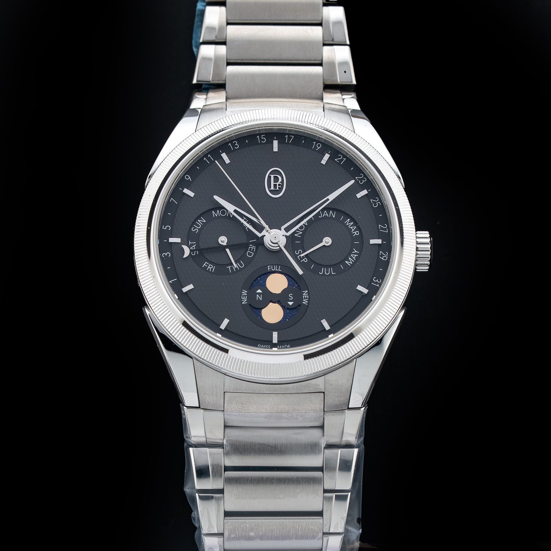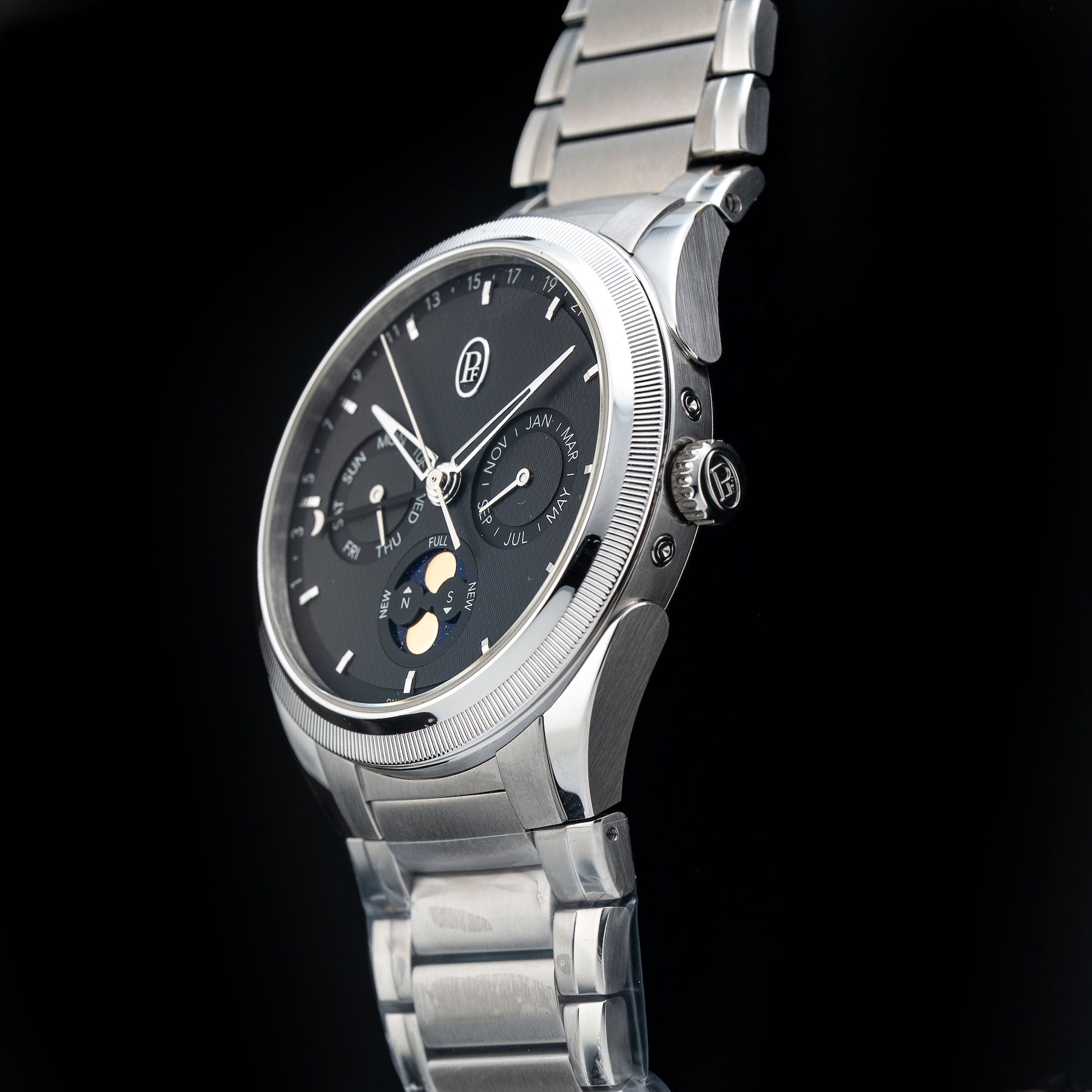 The 42 mm Tonda PF Annual Calendar transcends the aesthetics that had thus far been associated with Parmigiani Fleurier's annual calendar movement. Caliber PF339 presents a retrograde date, day, month and 122-year moonphase as visible in both hemispheres. As they come on top of the three usual time-telling hands, the very nature of the general design of the collection was at stake.