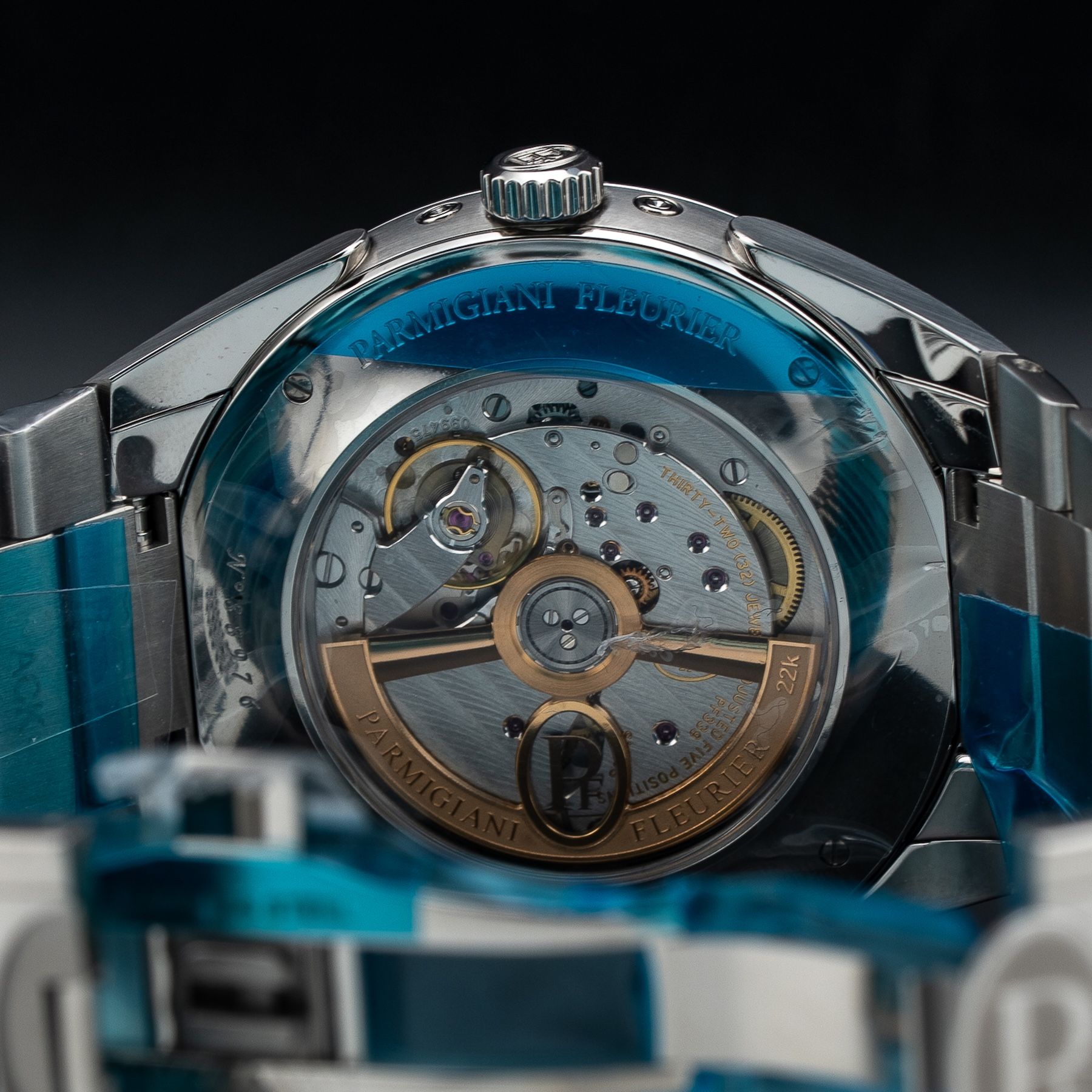 By pushing the date outwards onto the minute track and using discretely outlined counters on the warm grey guilloché dial, Parmigiani Fleurier has managed to balance the pared-down equilibrium of the collection's design language and an elaborate layout.