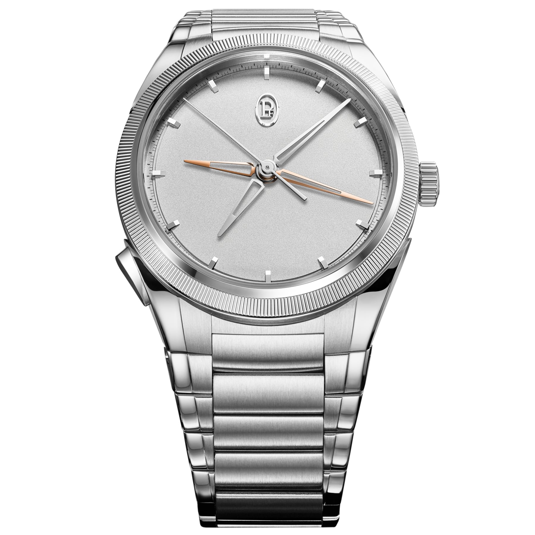 A chronograph conceived as an exercise in disappearance. At rest, the dial remains almost untouched. Activated by the monopusher, central chronograph indications for seconds, minutes and hours appear — with hour and minute hands in rose gold — for the duration of the measurement, then retract to restore visual silence.