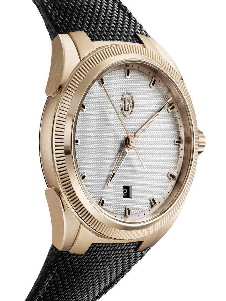 Introducing the Parmigiani Fleurier Tonda PF Sport Gold - a masterpiece of casual sporting-chic design. Available in polished and satin-finished 18k rose gold, this timepiece features a 41mm case diameter, offering a highly wearable and versatile style. The knurled bezel and hand-guilloché triangular nail pattern on the dial create a bold play of light and reflection. With black SuperLuminova-coated hour markers, legibility is exceptional. The Cordura-treated rubber strap adds texture and durability, seamlessly integrated into the case. Water-resistant up to 100 meters, this watch combines discretion and functionality. Powered by the Caliber PF770 movement with a 60-hour power reserve. Elevate your style with the Tonda PF Sport Gold.