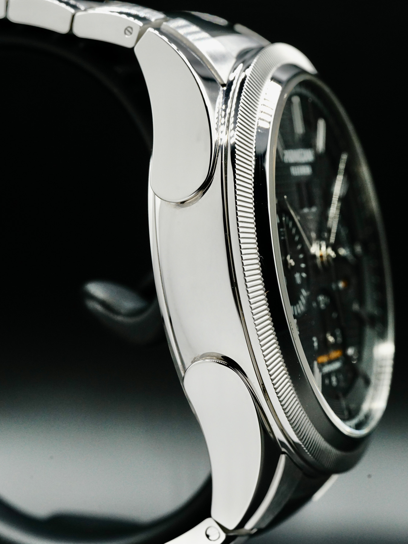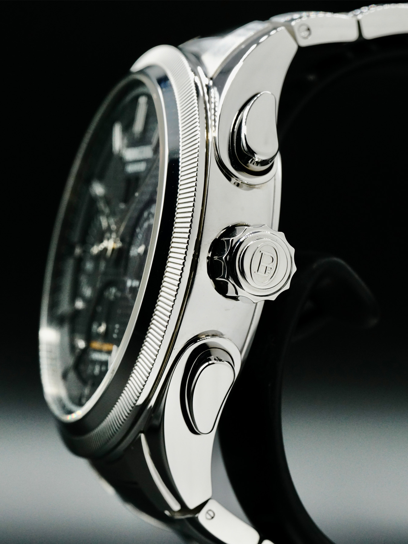 This Parmigiani Fleurier Tondagraph GT Acier features a 42mm stainless steel case with a display case back on a stainless steel bracelet. This watch also sports a black dial with luminous delta-shaped hands and index dial markers covered by scratch resistant sapphire crystal.