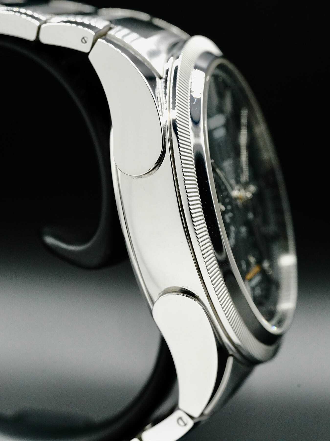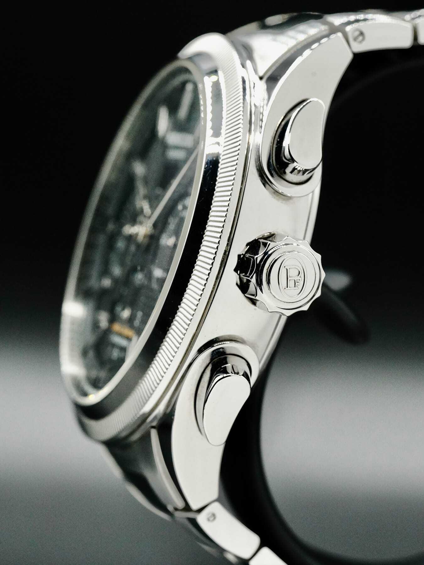 This Parmigiani Fleurier Tondagraph GT Acier features a 42mm stainless steel case with a display case back on a stainless steel bracelet. This watch also sports a black dial with luminous delta-shaped hands and index dial markers covered by scratch resistant sapphire crystal.