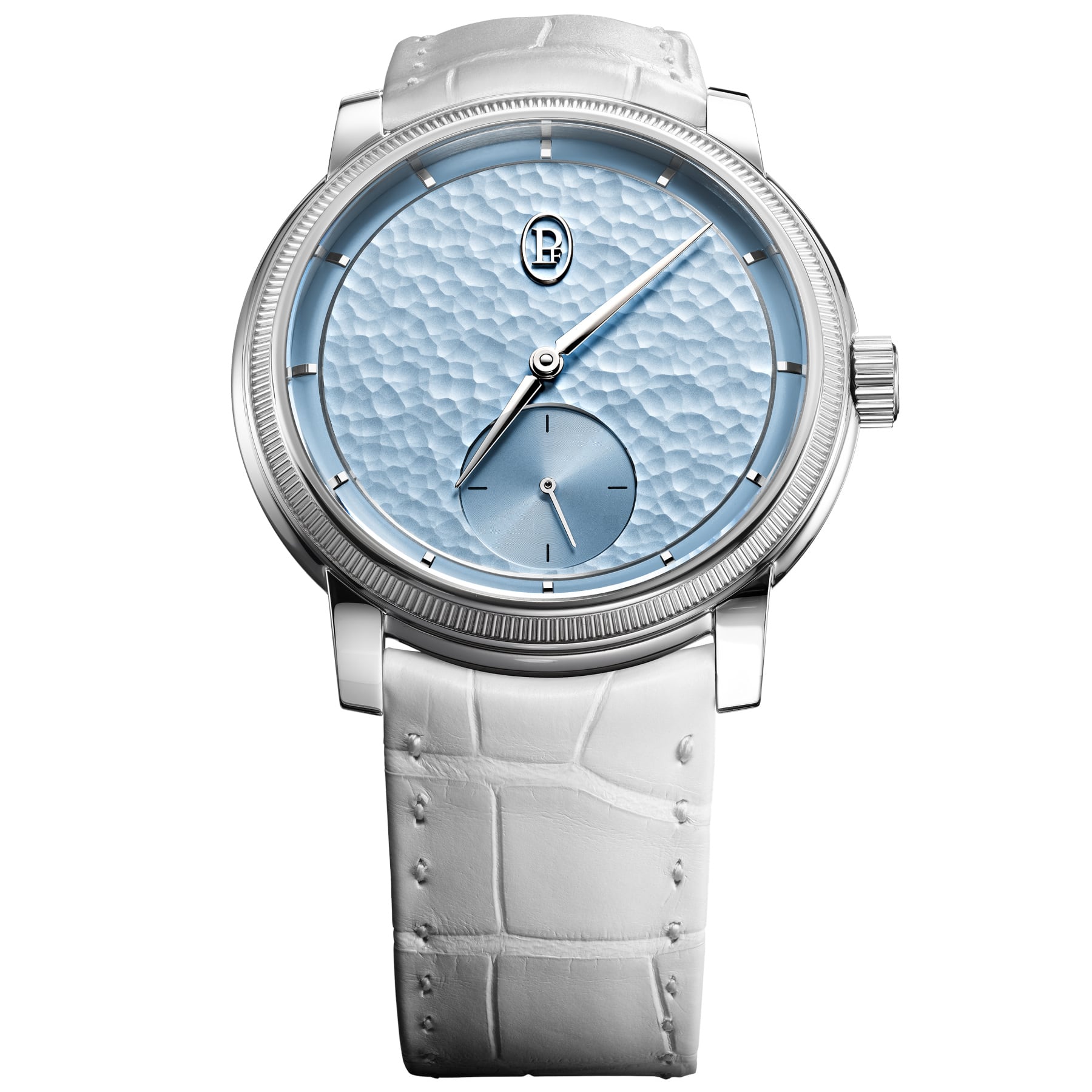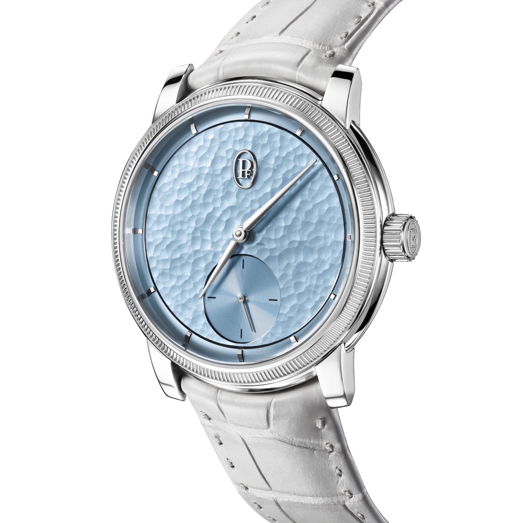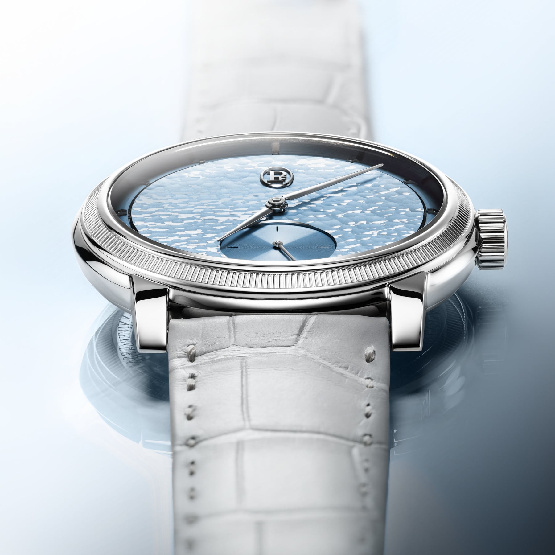 A distilled expression of Parmigiani Fleurier watchmaking. The Morning Blue dial, crafted in hand-hammered 18-carat white gold, reveals a living, tactile surface, where light is caught, softened and continuously transformed by the rhythm of each artisan’s gesture. The timepiece is housed in a platinum case with a finely knurled bezel, echoed by a similarly knurled case back, one of the most distinctive architectural signatures of the TORIC collection.