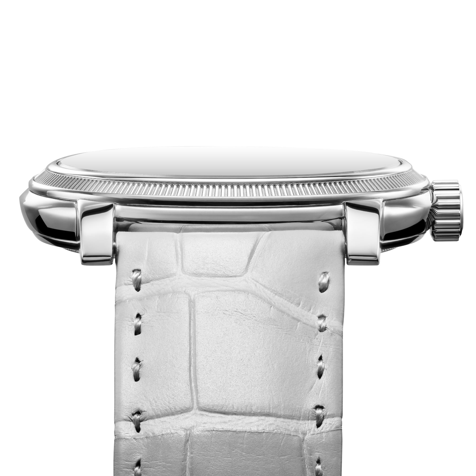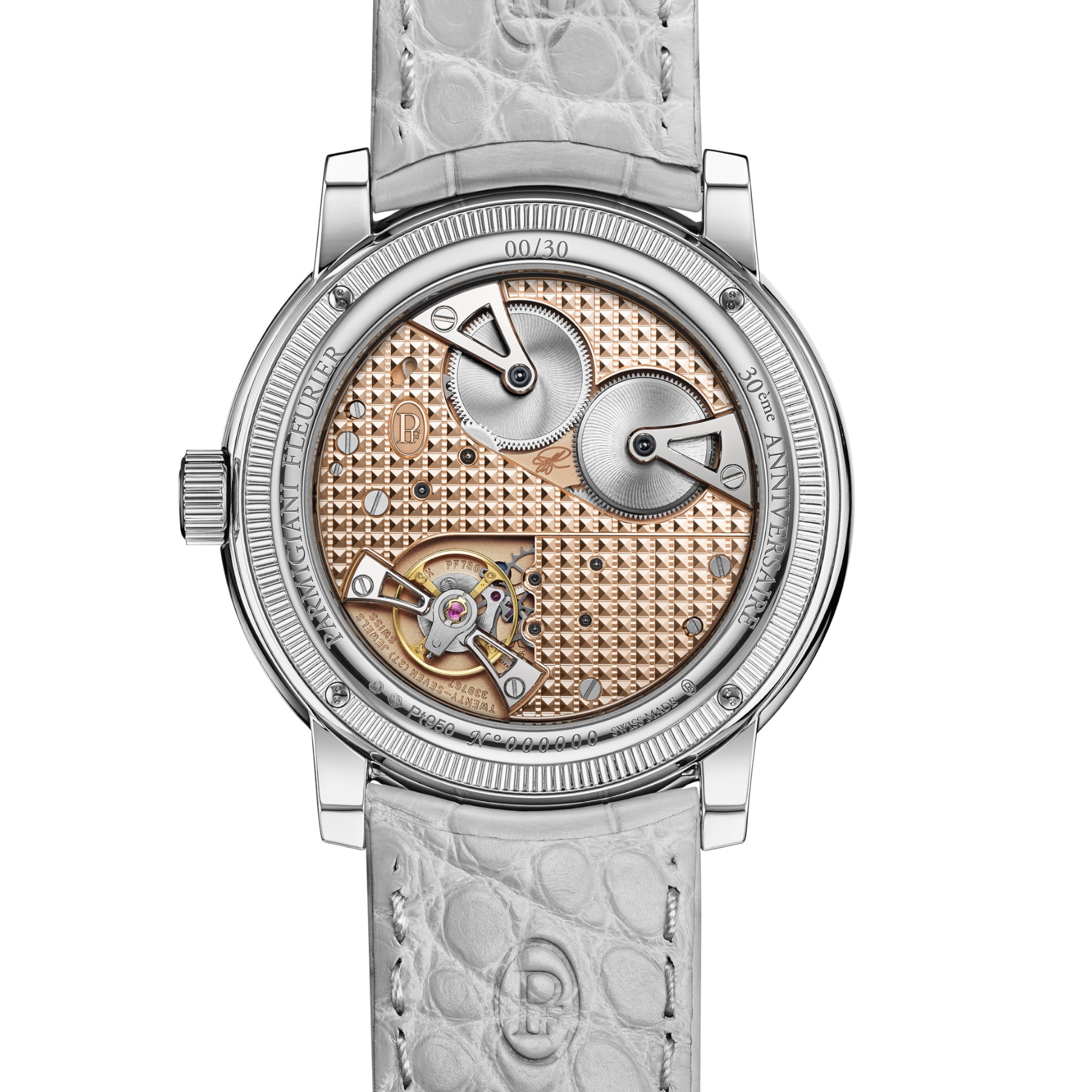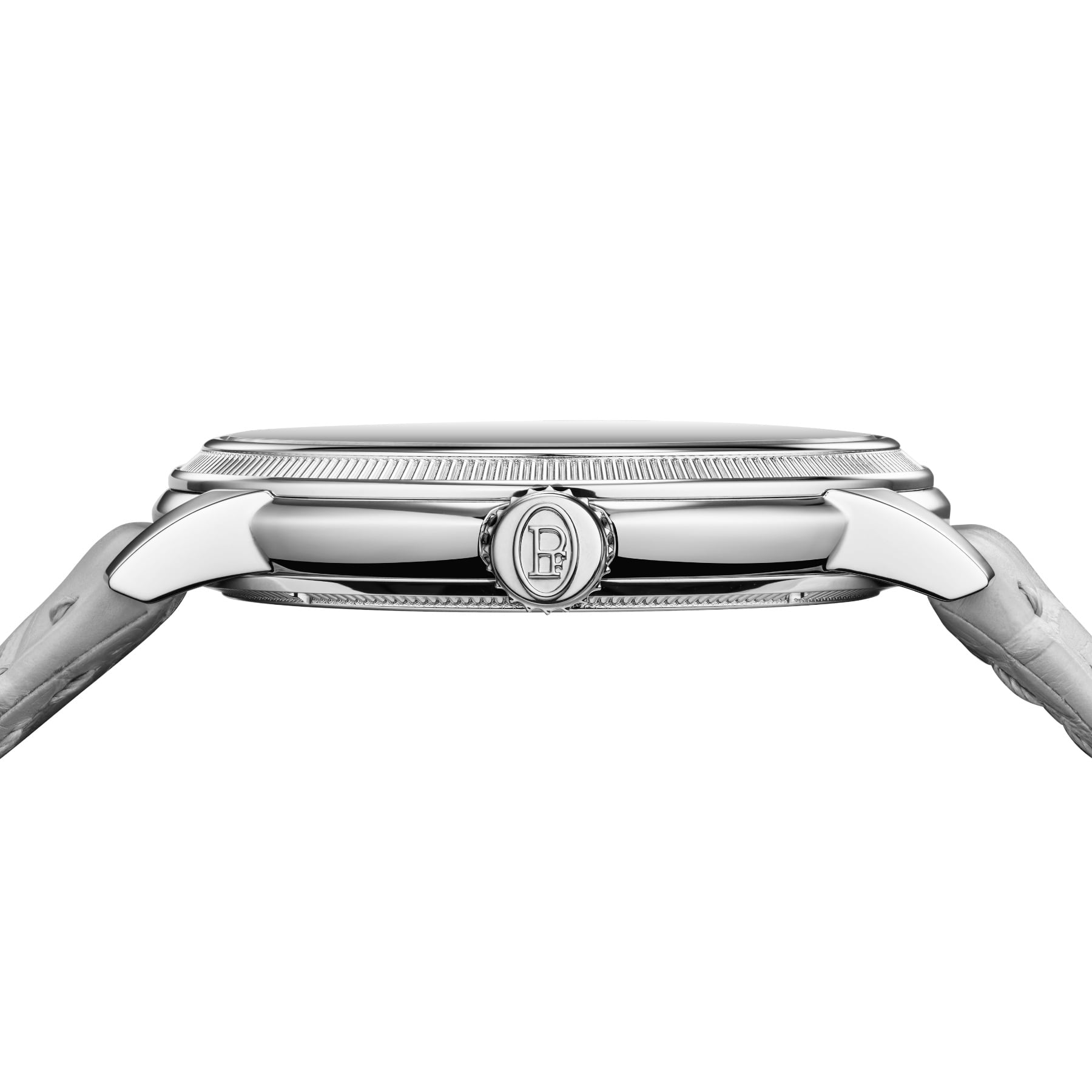 A distilled expression of Parmigiani Fleurier watchmaking. The Morning Blue dial, crafted in hand-hammered 18-carat white gold, reveals a living, tactile surface, where light is caught, softened and continuously transformed by the rhythm of each artisan’s gesture. The timepiece is housed in a platinum case with a finely knurled bezel, echoed by a similarly knurled case back, one of the most distinctive architectural signatures of the TORIC collection.