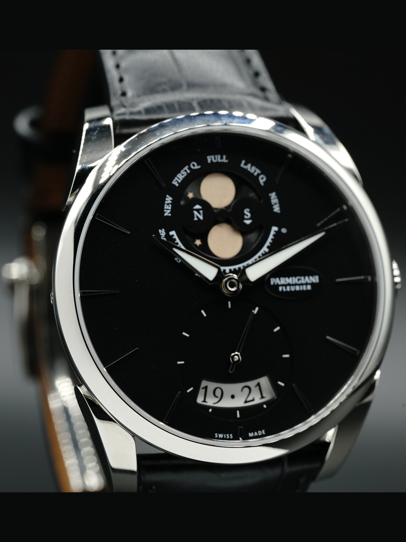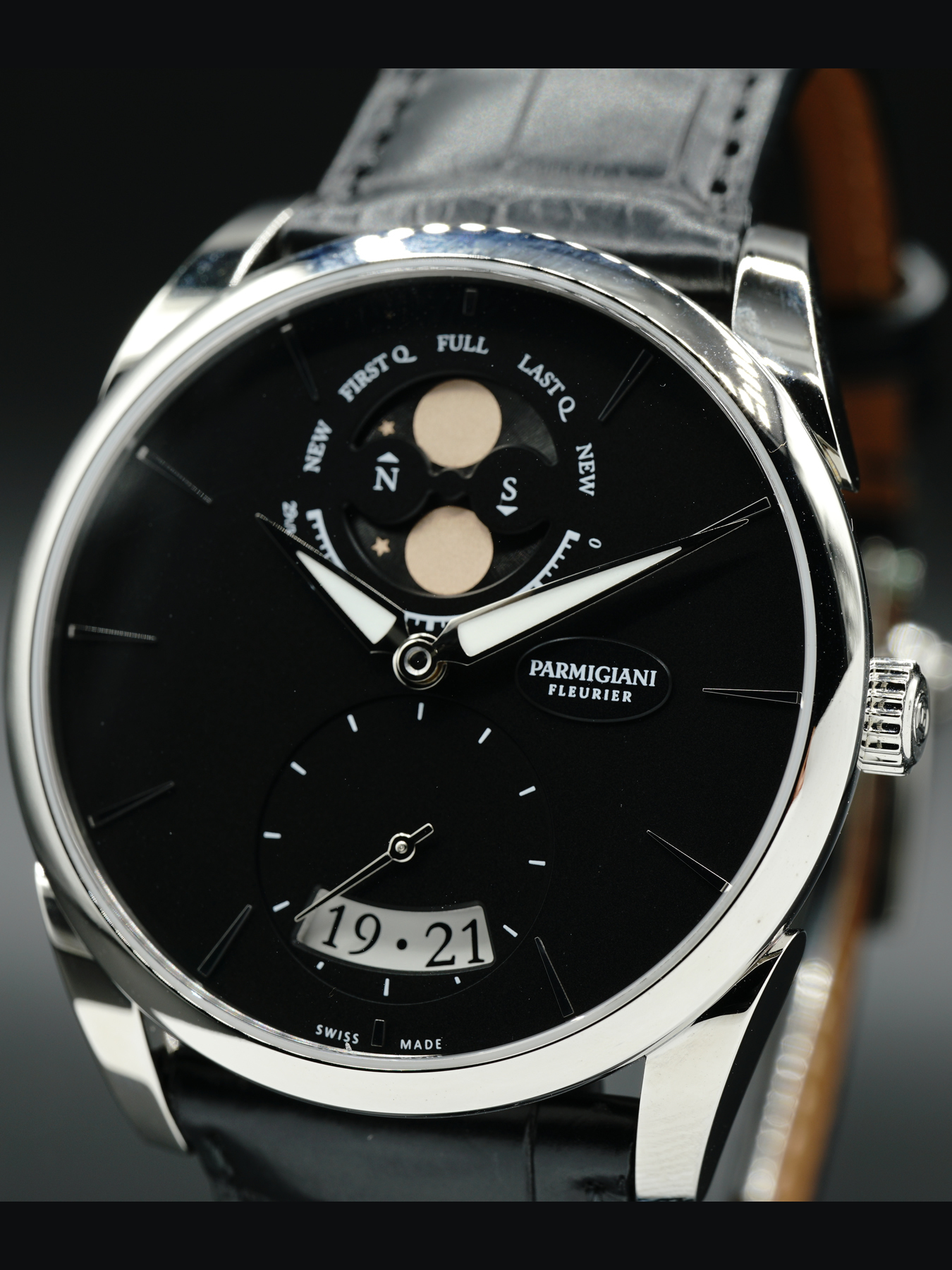 The dark of night. The atmosphere is electric. Emotions are heightened. The Tonda 1950 Lune comes into its own here, on the knife's edge. The latest opus in the Manufacture's bestselling Tonda 1950 collection, it boasts the signature streamlined aesthetic and ultra-thin movement with micro-rotor designed, developed and manufactured entirely within the Parmigiani Fleurier watchmaking centre.