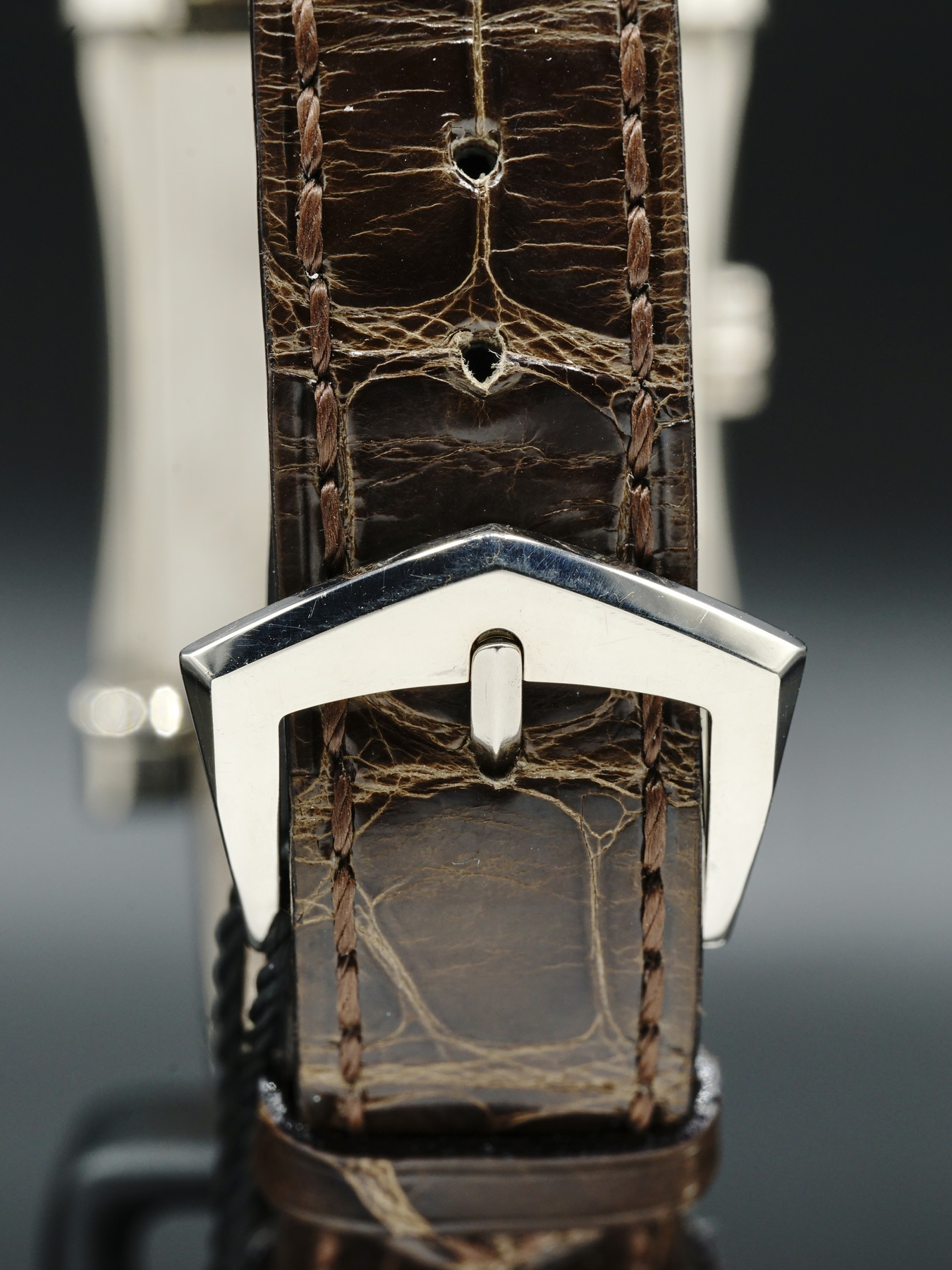 Very fine and rare, rectangular and flared, domed, 18K white gold Chronometer wristwatch with an 18K white gold Patek Philippe buckle.