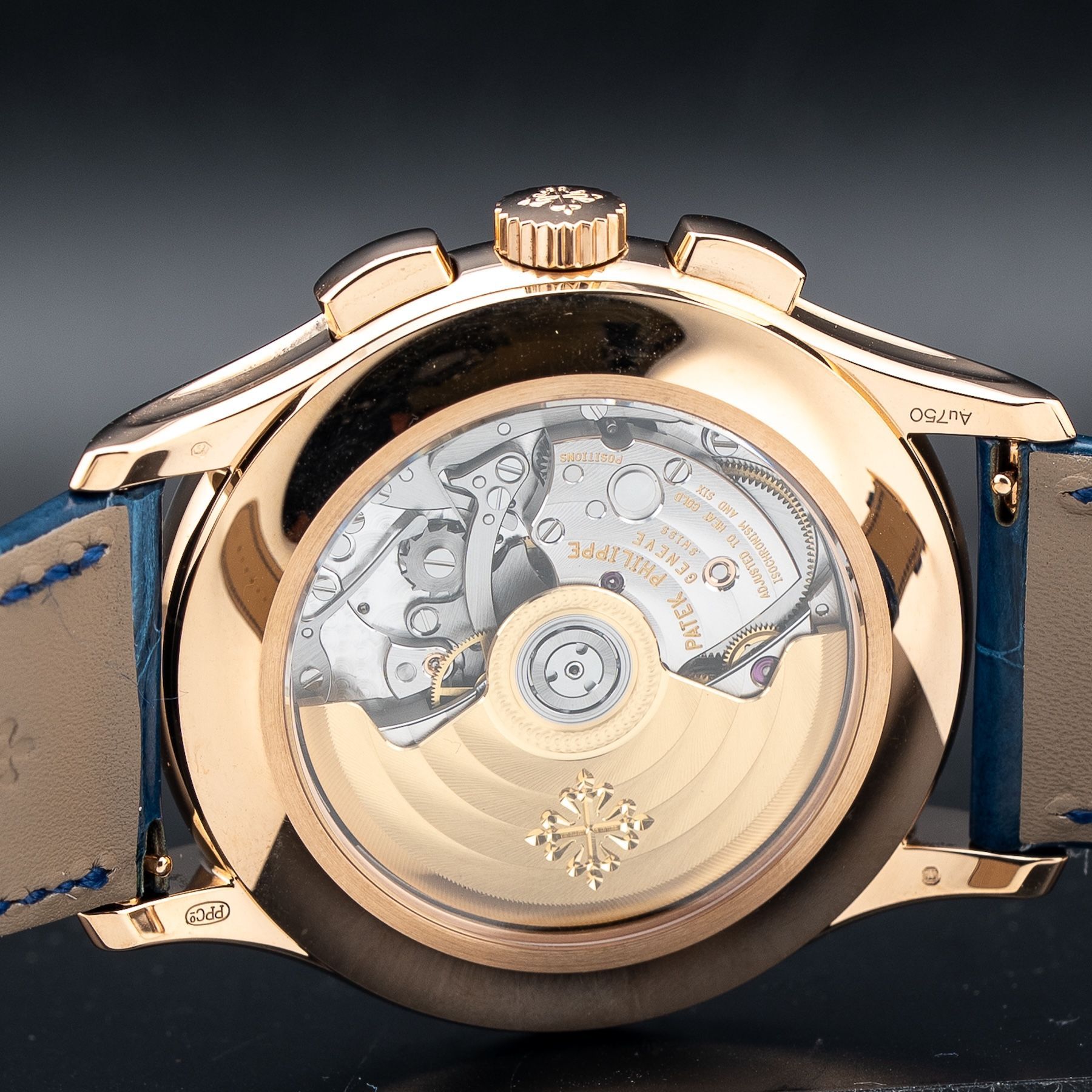 This Patek Philippe 5905R-010 Flyback Chronograph Annual Calendar Rose Gold Blue is in GREAT condition. This watch includes its Original Box, Original Papers. This watch has been fully authenticated and certified by Exquisite Timepieces. Please note, the photos shown are of the actual watch you will receive.