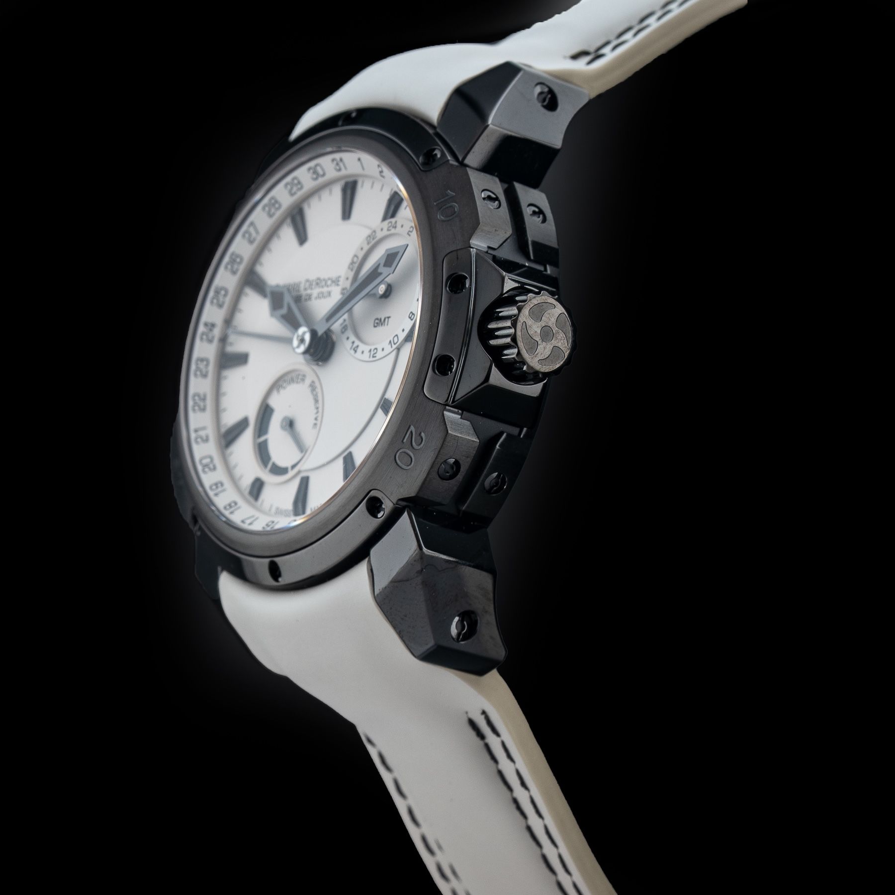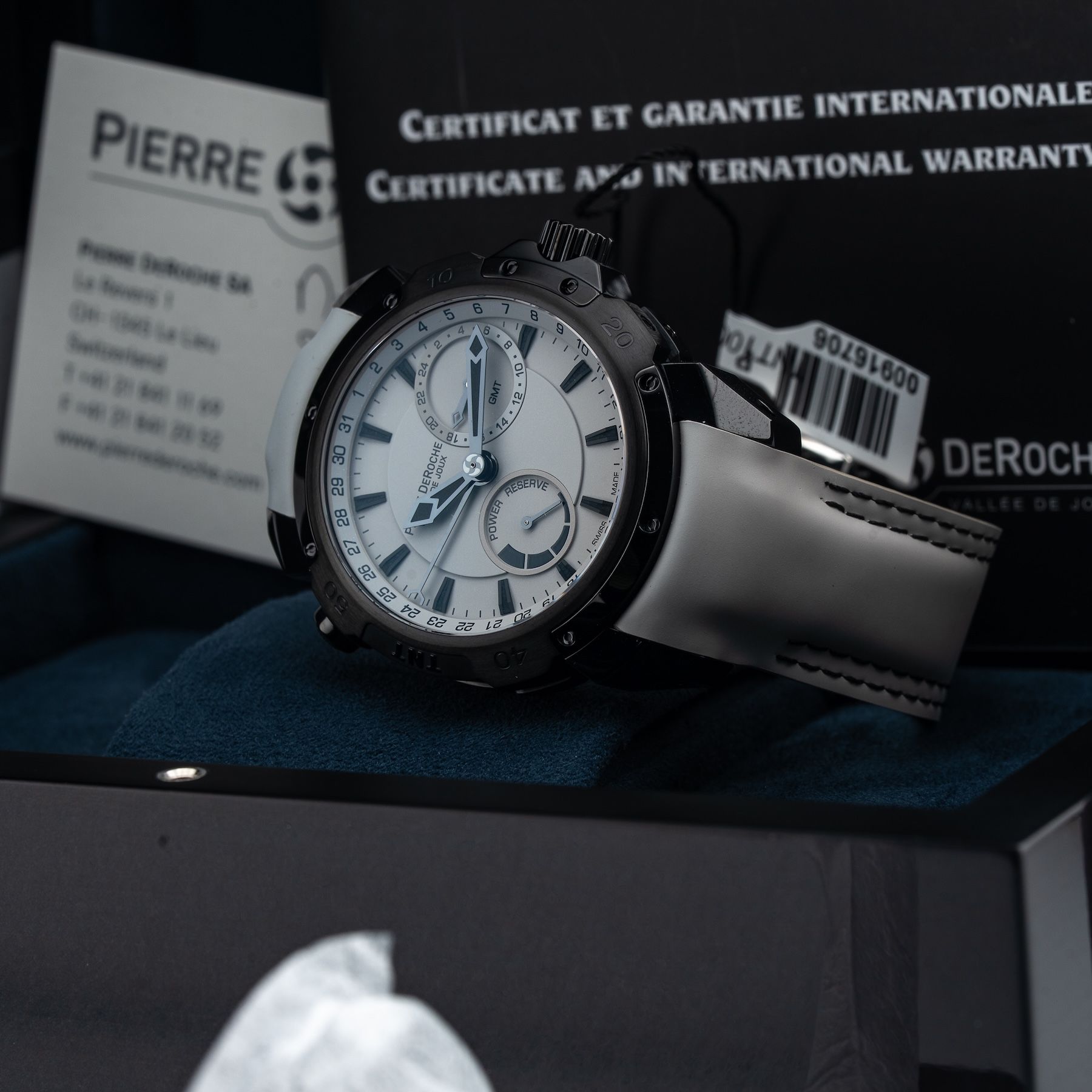 This Pierre DeRoche TNT GMT Power Reserve 43 is in GREAT condition. This watch includes its Original Box, Original Papers. This watch has been fully authenticated and certified by Exquisite Timepieces. Please note, the photos shown are of the actual watch you will receive.