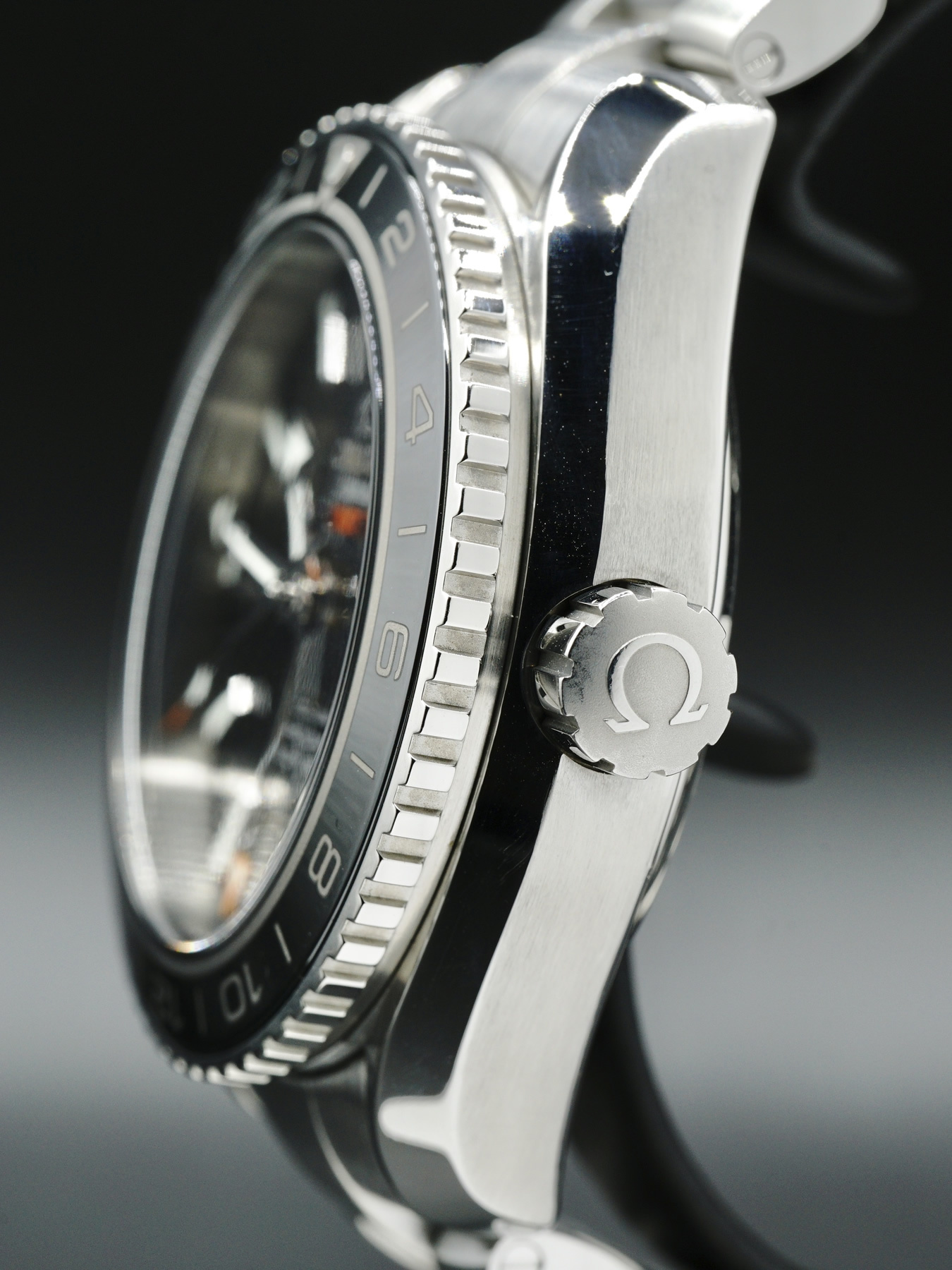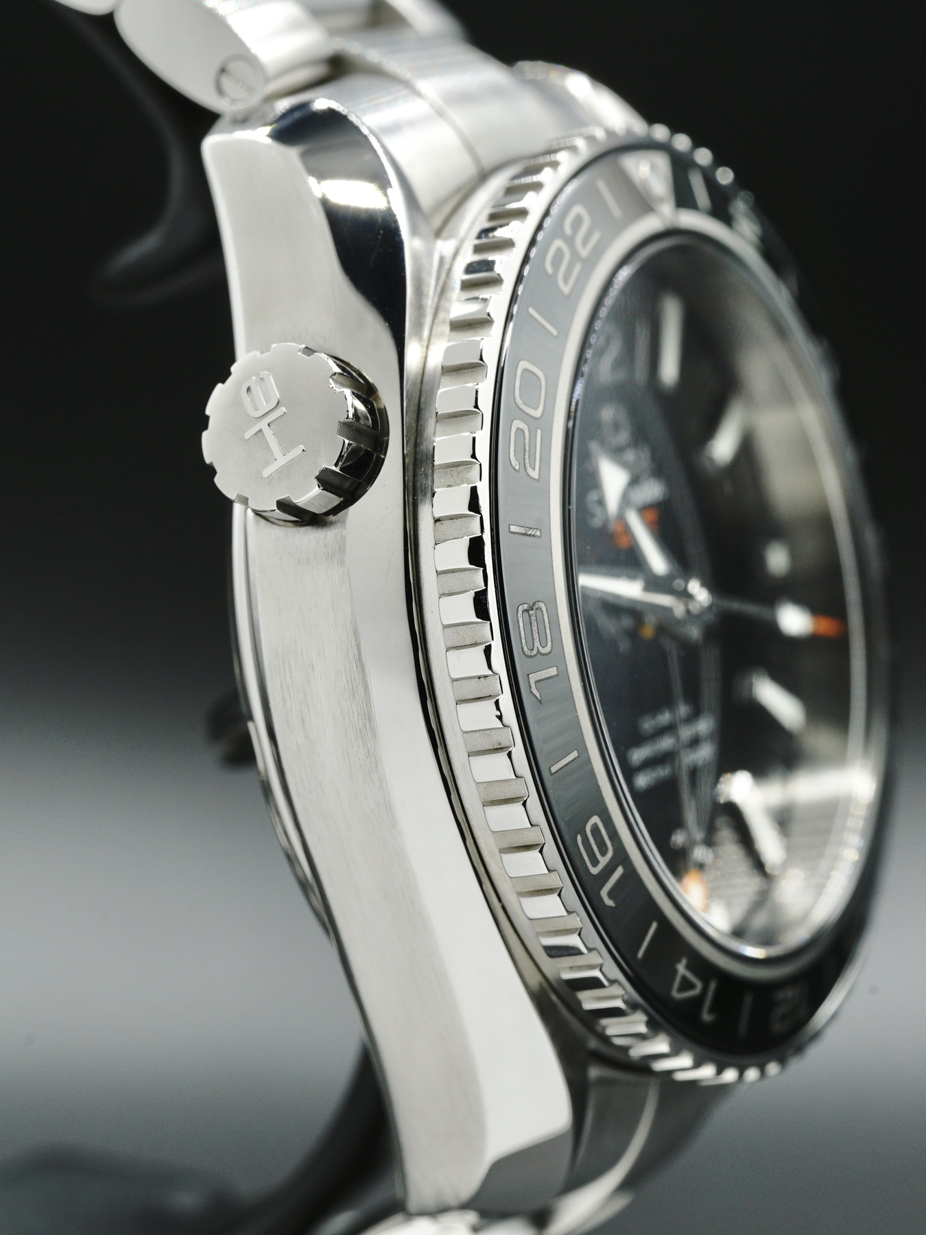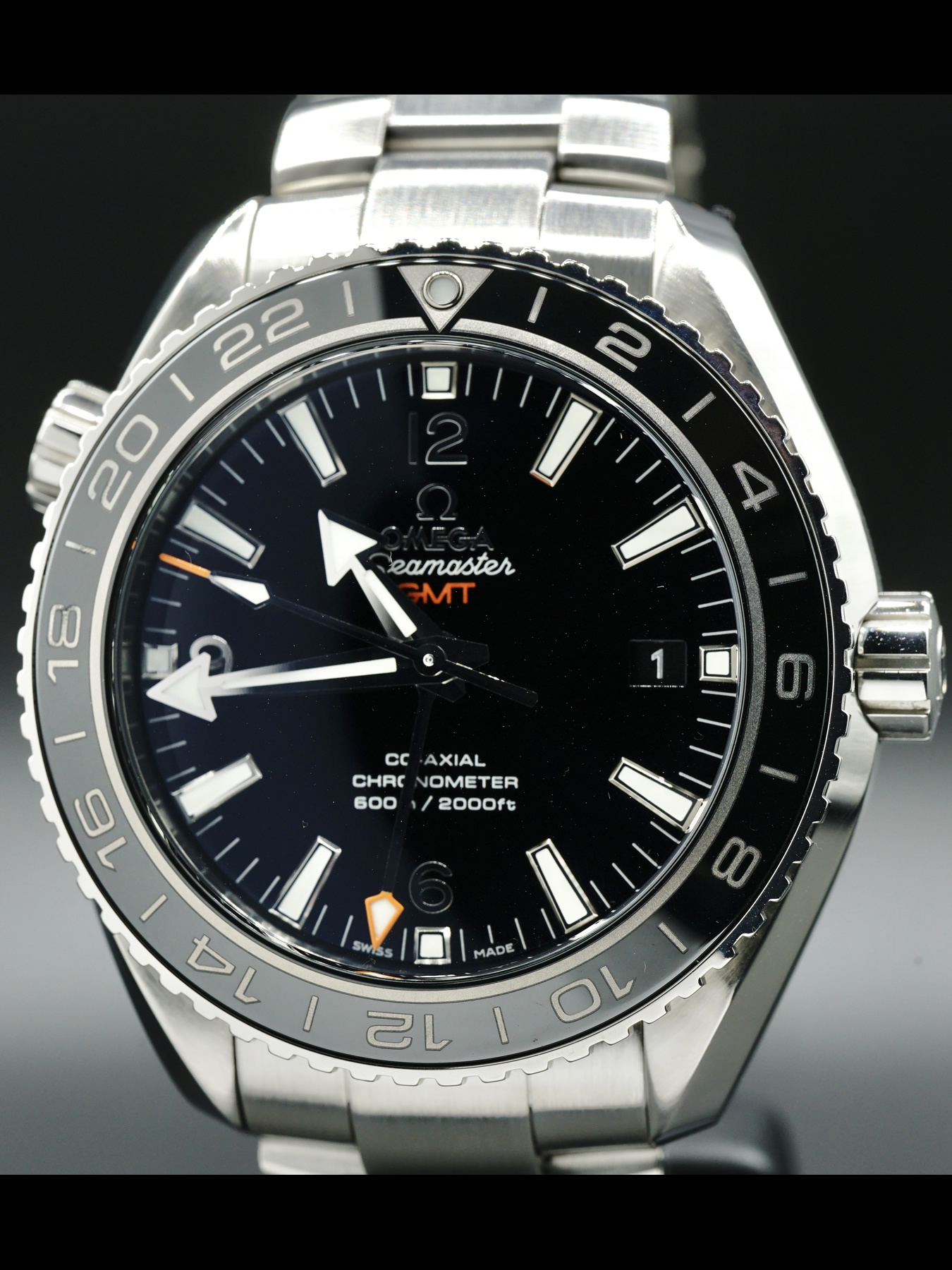 This Omega Seamaster Planet Ocean GMT features a 43.5mm stainless steel case with a black ceramic bezel. This watch sports a black dial covered by anti-reflective, scratch resistant sapphire crystal.