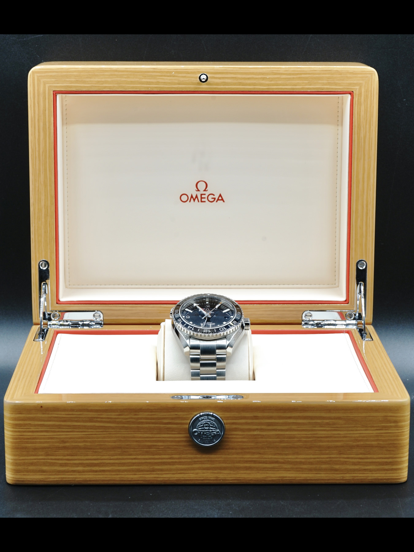 This Omega Seamaster Planet Ocean GMT is in EXCELLENT condition. This watch includes its original box, operating instructions, and international warranty dated for July 2020.