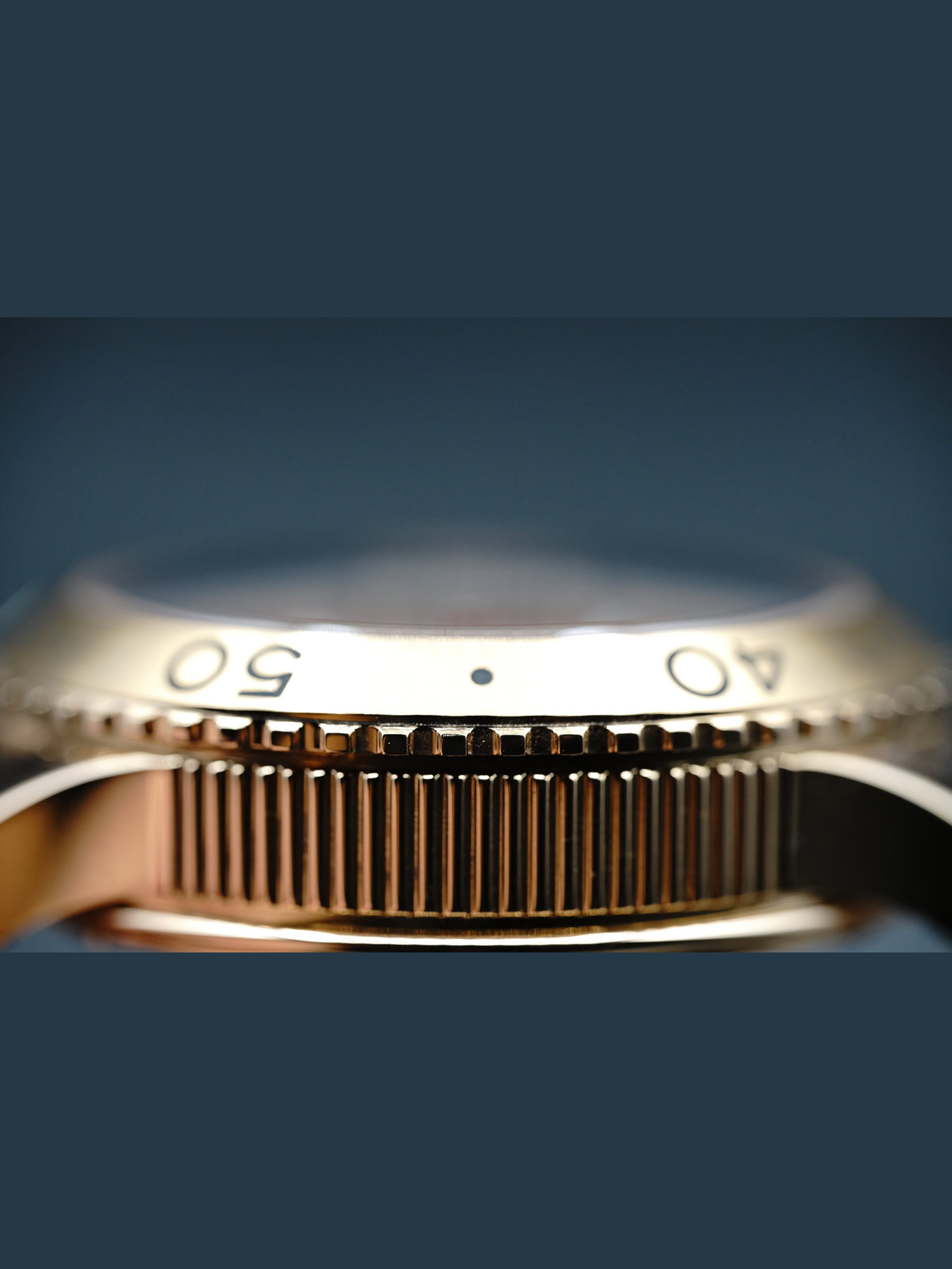 - This timepiece features a 44mm gold case paired with a high quality leather strap. It showcases a distinctive brown dial and is powered by a precise automatic winding movement. The watch is designed with a water resistance of up to 100m.