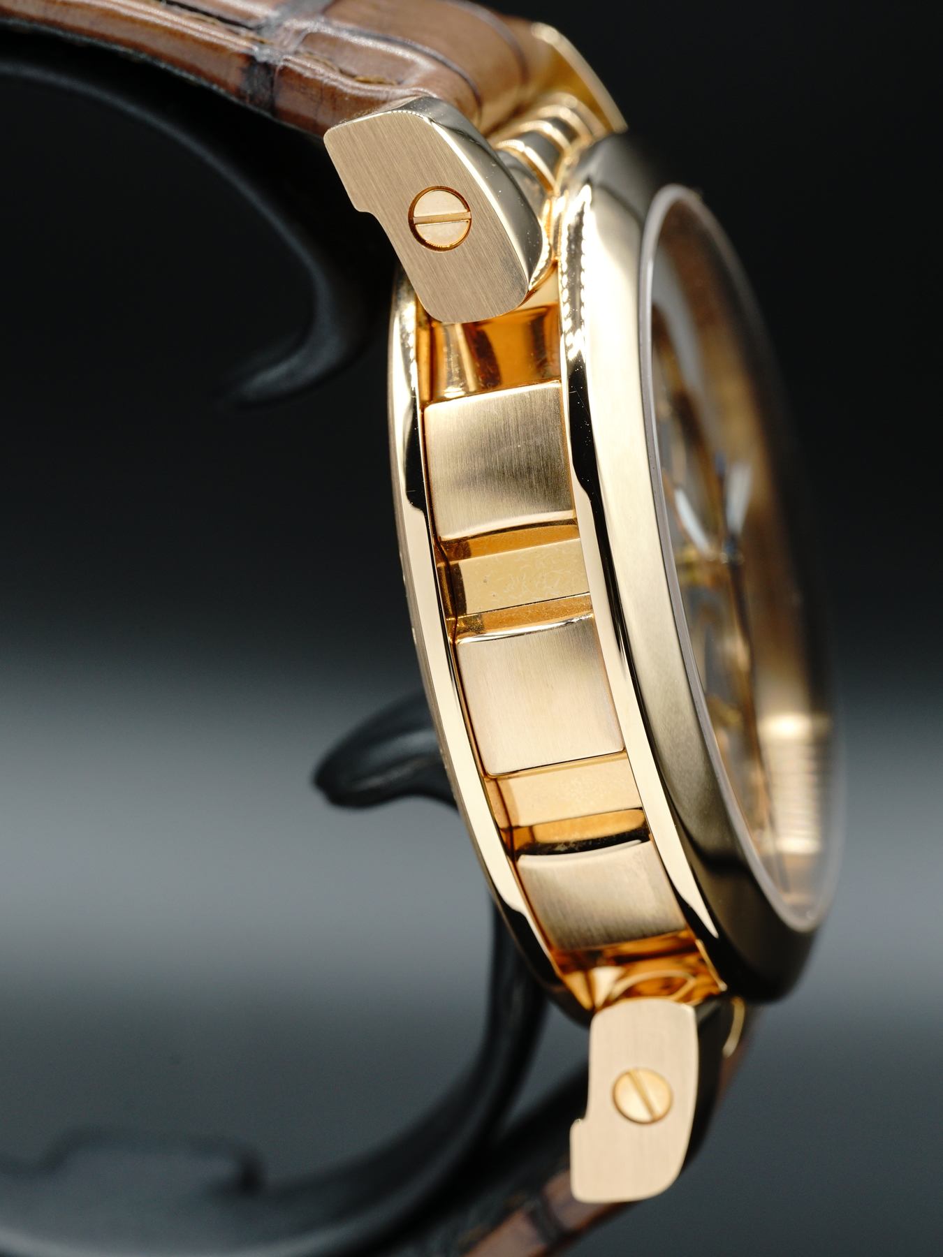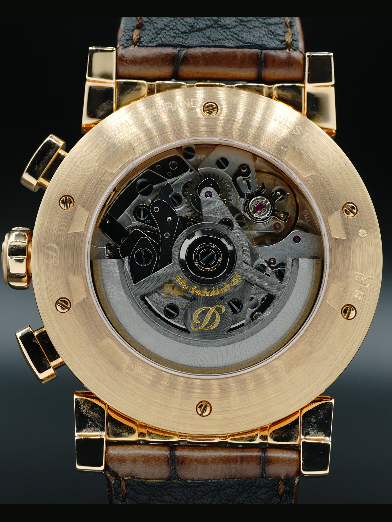 This Dubey is in EXCELLENT condition. This is a piece that is unique, as normally the watch only comes with a black dial, this silver /anthracite dial does not typically come on the Grand Shar in rose gold. This watch operates with a Valjoux 7750 worked and finished by Dubey in-house.