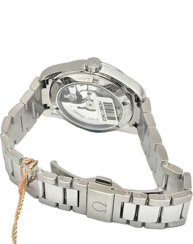 This classic yet robust timepiece represents a tribute to OMEGA's rich maritime heritage. The dramatic and easily-recognisable dial design of the OMEGA Seamaster Aqua Terra 150M collection recalls the wooden decks of luxury sailboats. This model features a sun-brushed and lacquered black dial decorated with the Teak Concept pattern and a date window at 3 o'clock. A scratch-resistant sapphire crystal protects this unique dial. The stainless steel 38.5 mm case is presented on a stainless steel bracelet. This certified chronometer is powered by the OMEGA Master Co-Axial calibre 8500 which is resistant to magnetic fields greater than 15,000 gauss and can be seen through the transparent caseback.