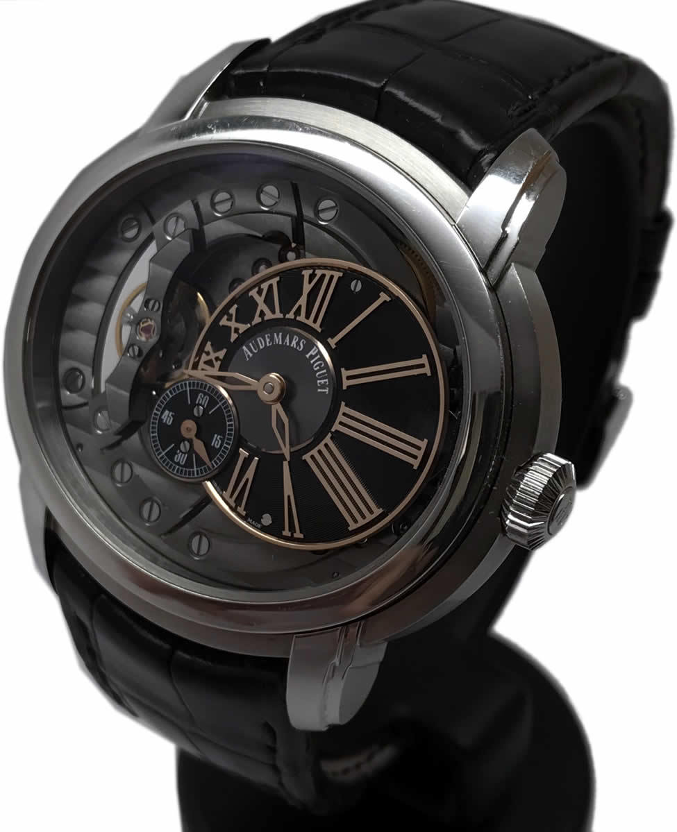 Black and anthracite dial, off-centred disc, black small seconds counter, pink gold applied Roman numerals and hands