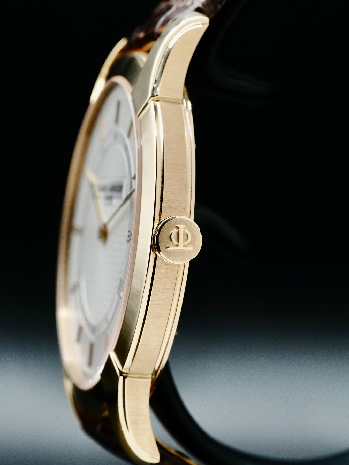 This Baume & Mercier features a 41mm 18k rose gold case & bezel with a solid case back on a brown leather strap. This watch also sports a silvered dial with rose gold-tone hands and index dial markers covered by scratch resistant sapphire crystal.