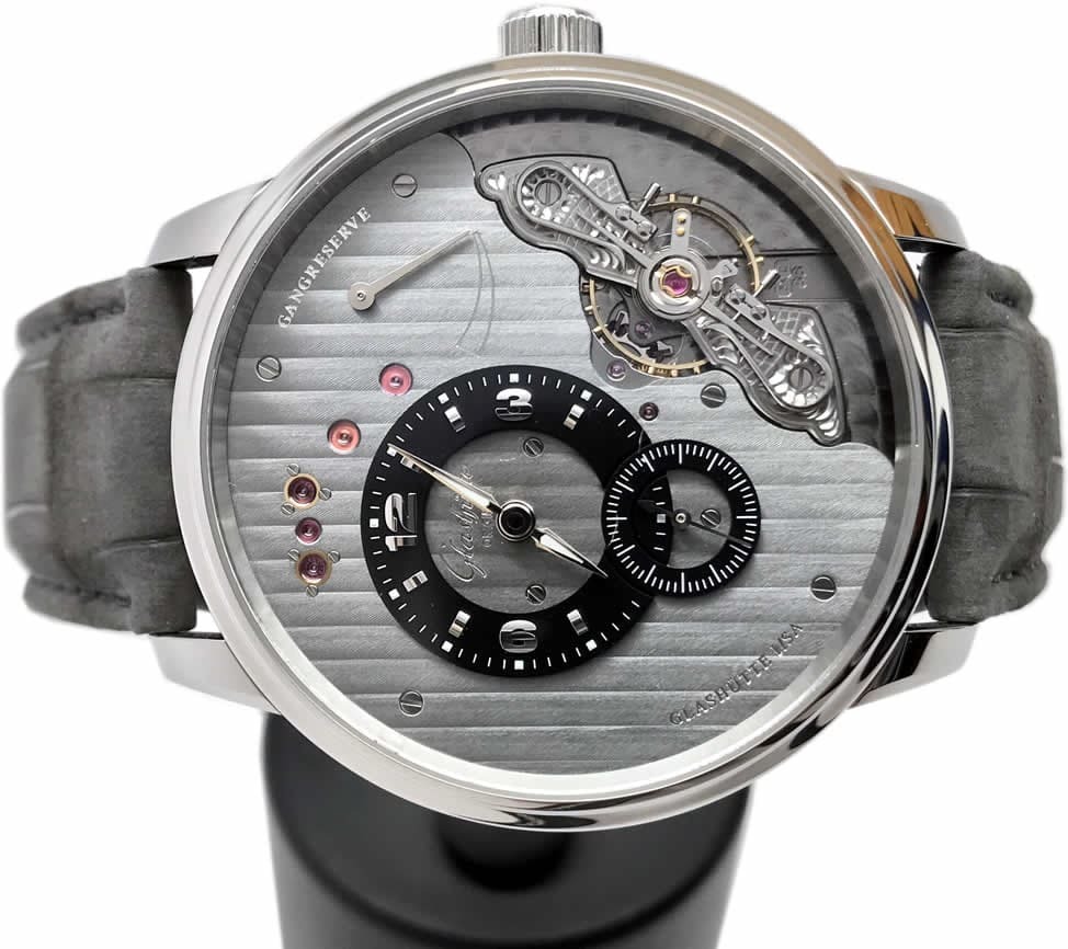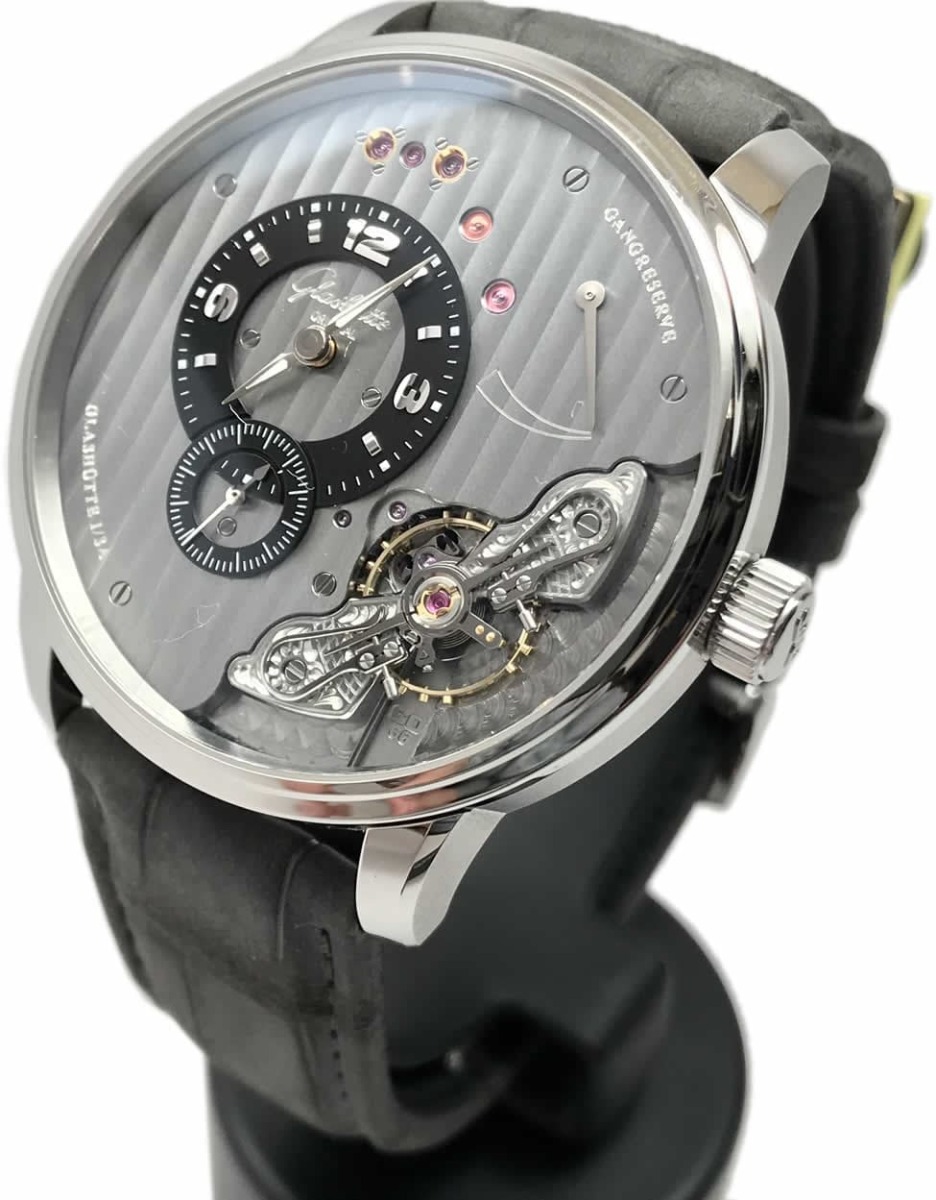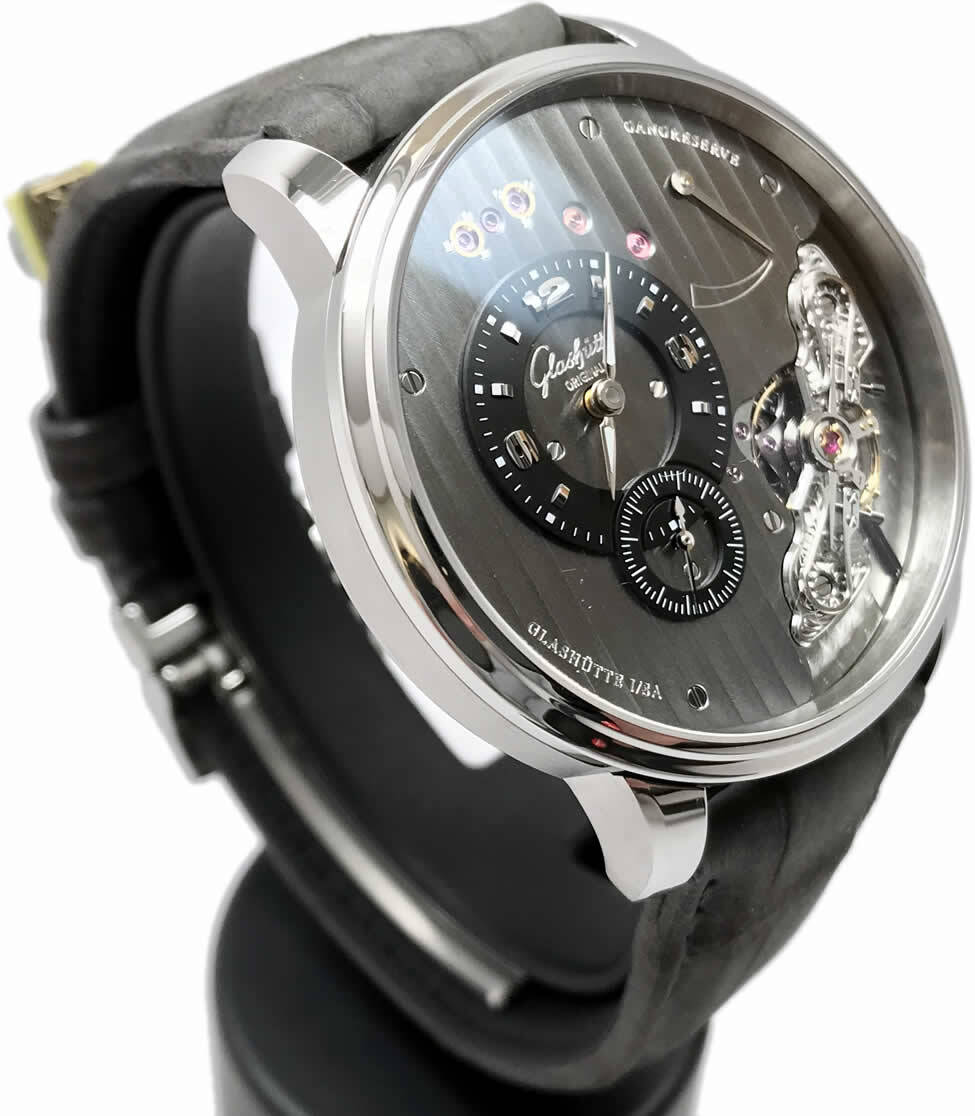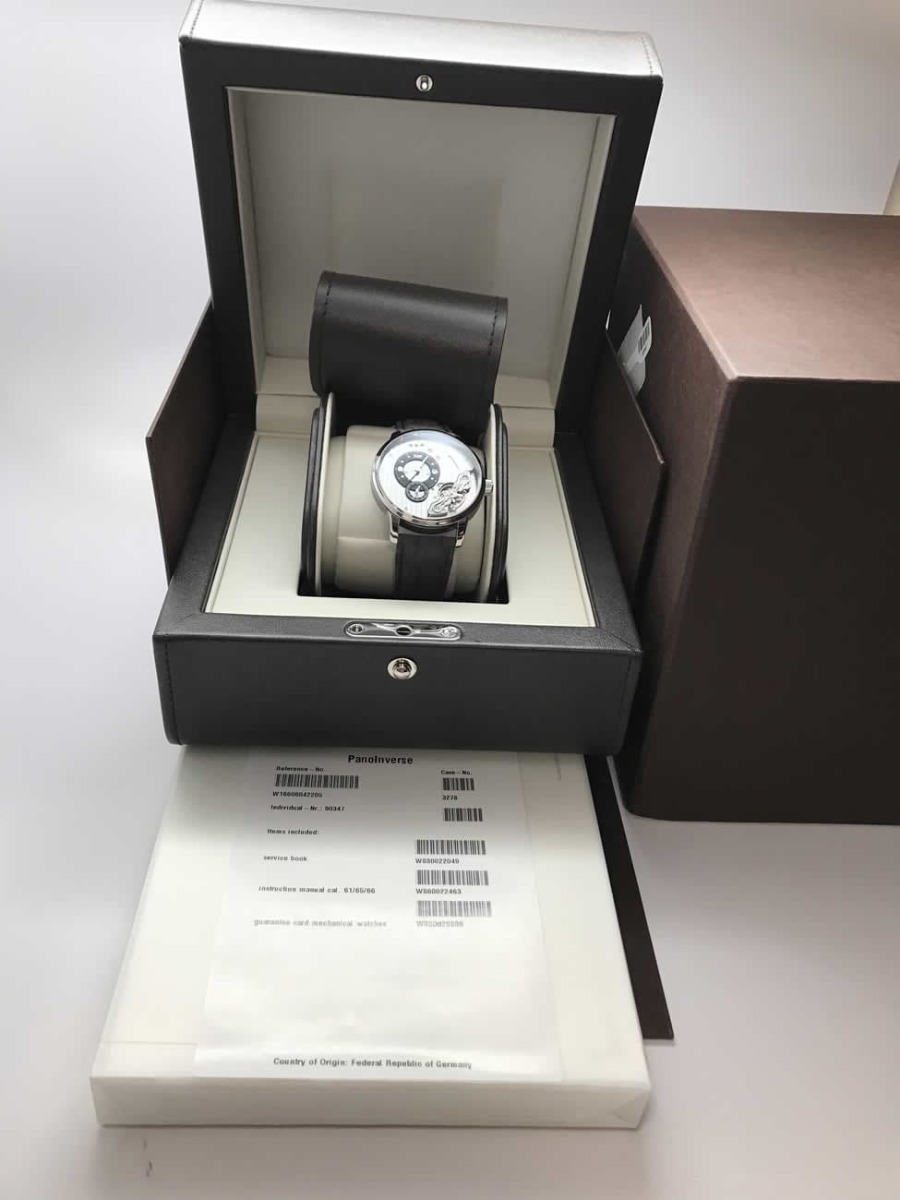 Excellent condition, it has all boxes and papers. Introduced with great success in the year 2008, the PanoInverse from Glashütte Original was the first timekeeper from the Saxon manufactory to reveal its inner beauty by bringing an extraordinary element from the interior to the visible surface of the watch.