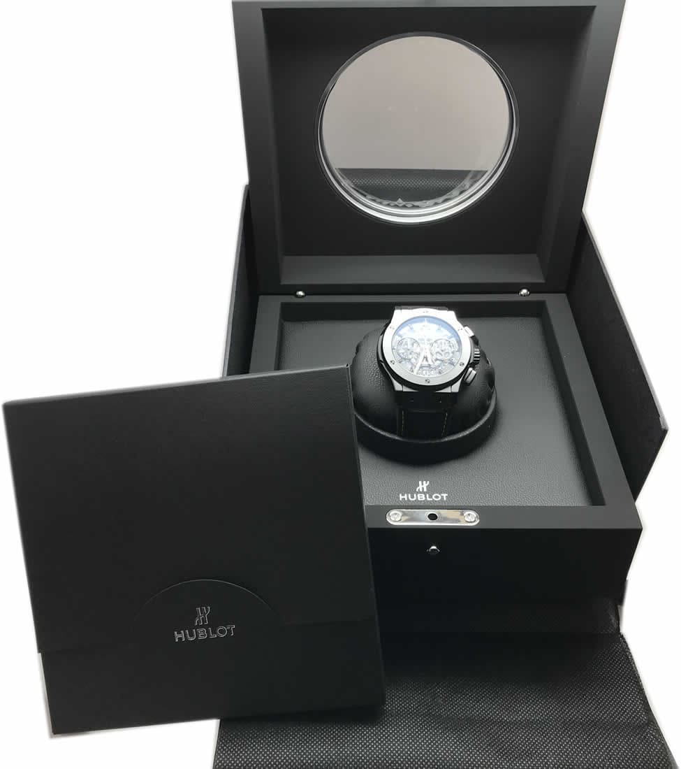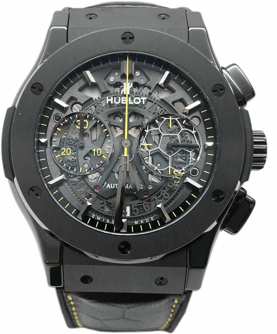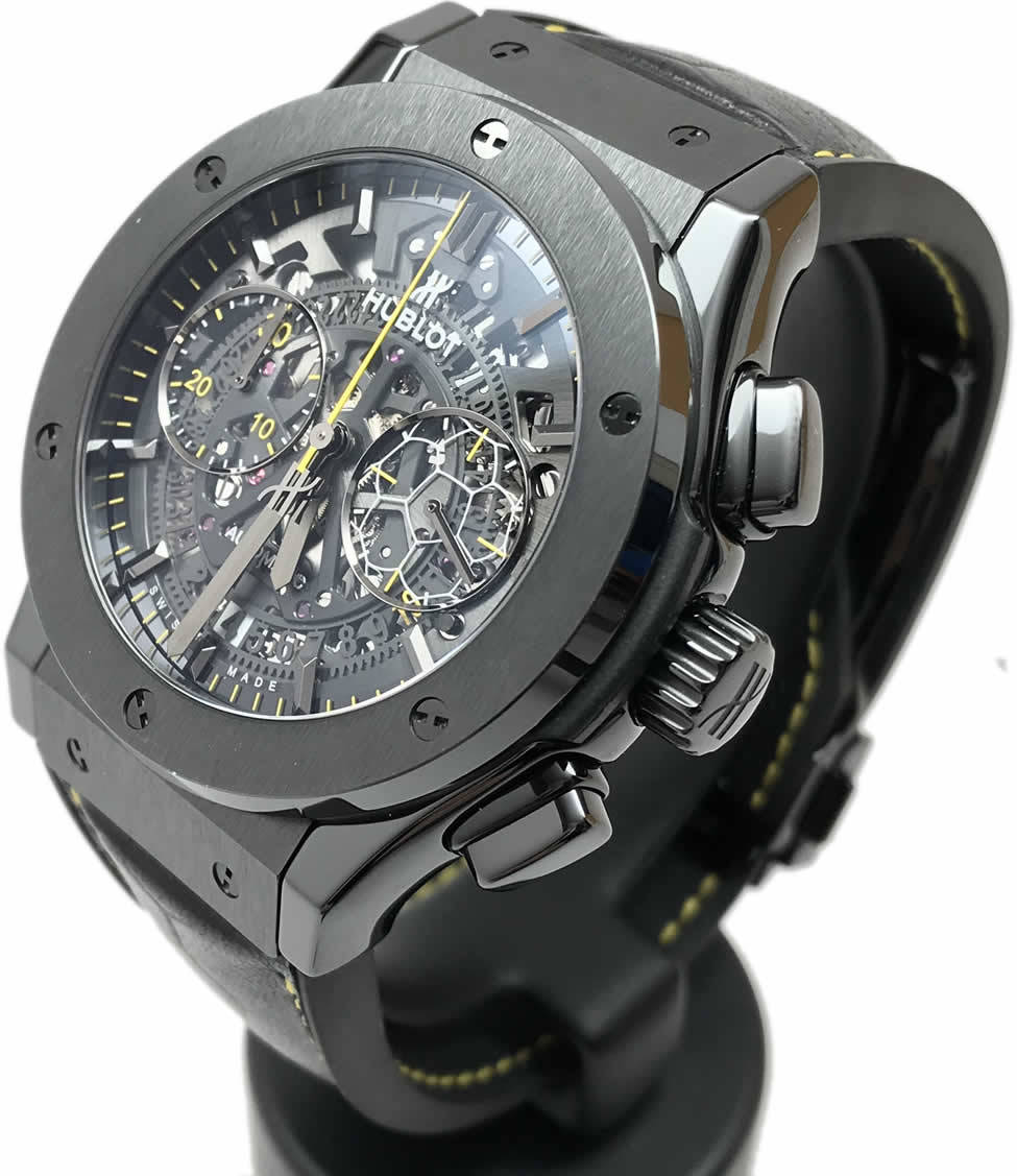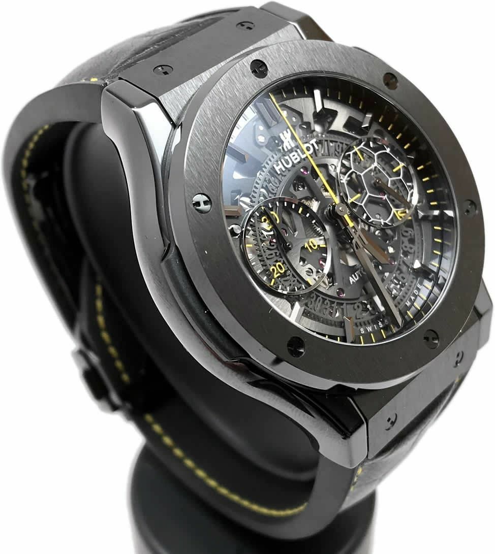 - This timepiece features a 45mm ceramic case paired with a high quality leather strap. It showcases a distinctive black dial and is powered by a precise automatic winding movement. The watch is designed with a water resistance of up to 100M.