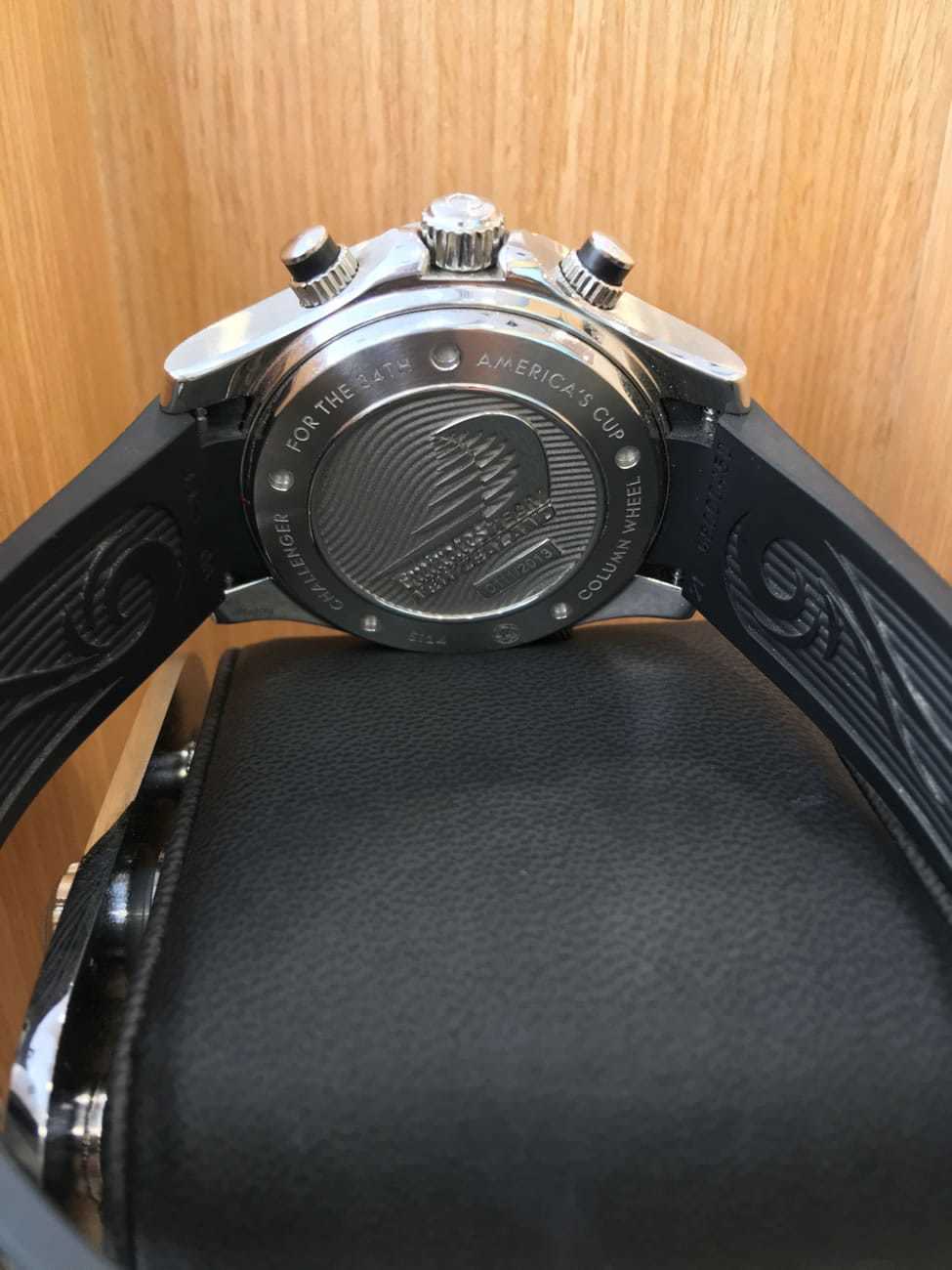 Self-winding chronograph with column-wheel mechanism and Co-Axial escapement. Free sprung-balance equipped with Si14 silicon balance spring. Officially certified chronometer.