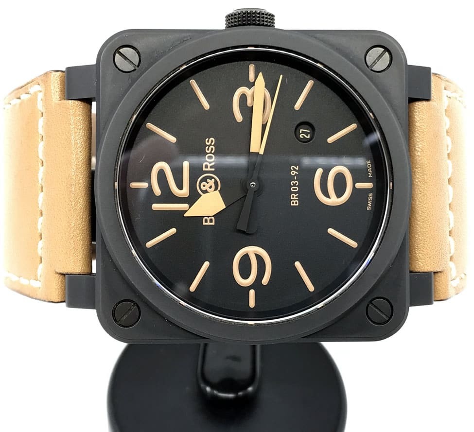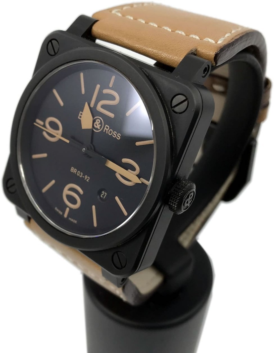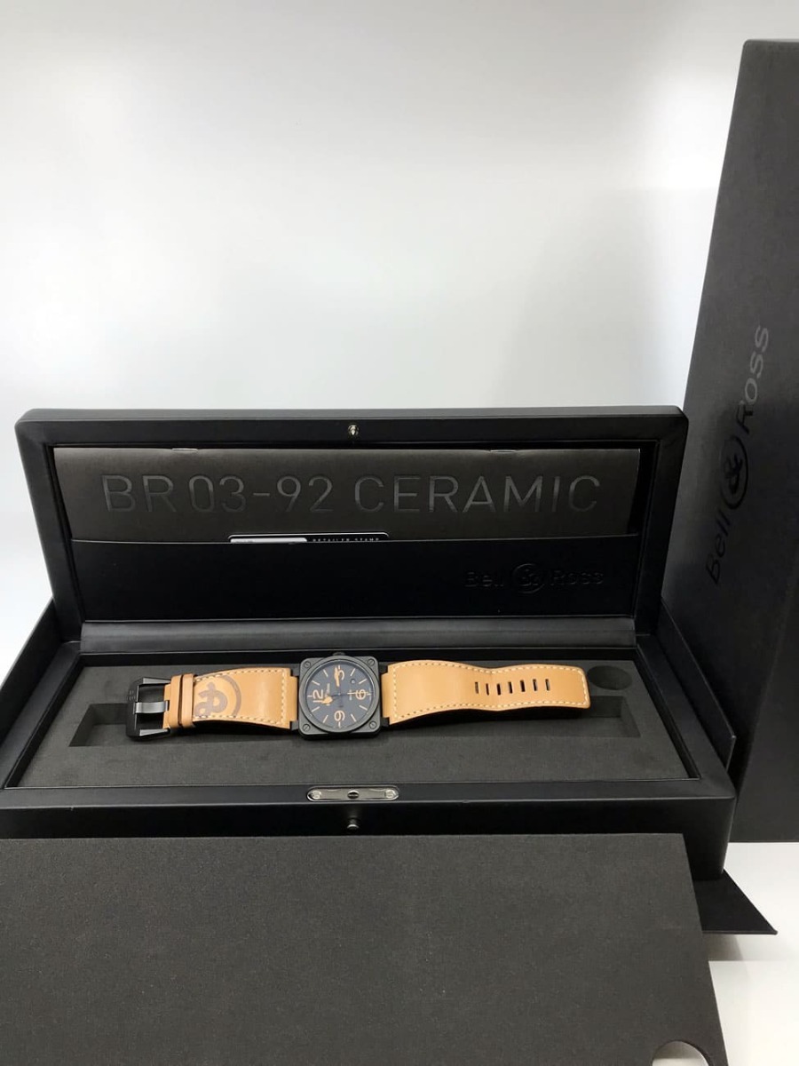 - This timepiece features a 42mm ceramic case paired with a high quality leather strap. It showcases a distinctive black dial and is powered by a precise automatic winding movement.