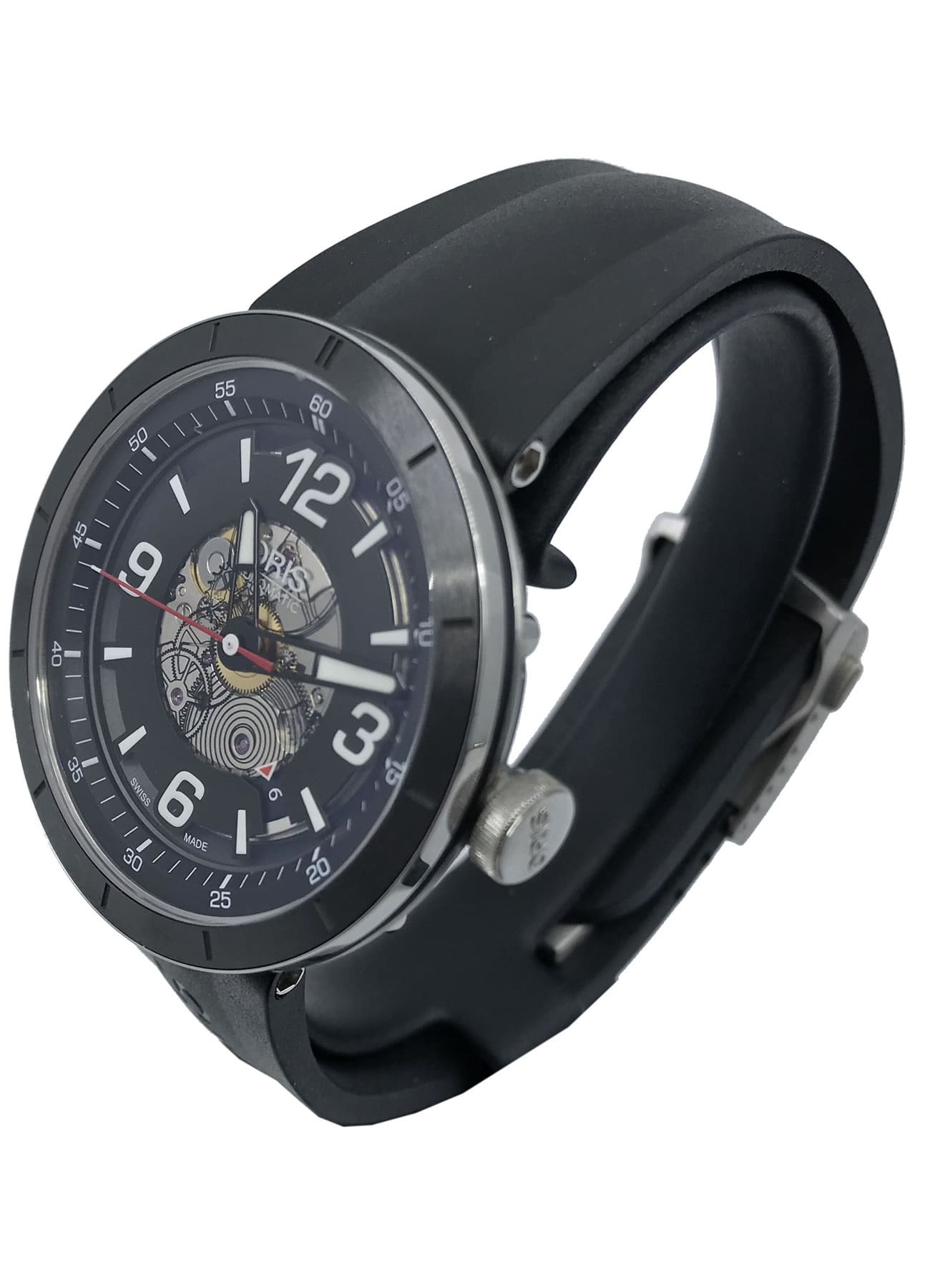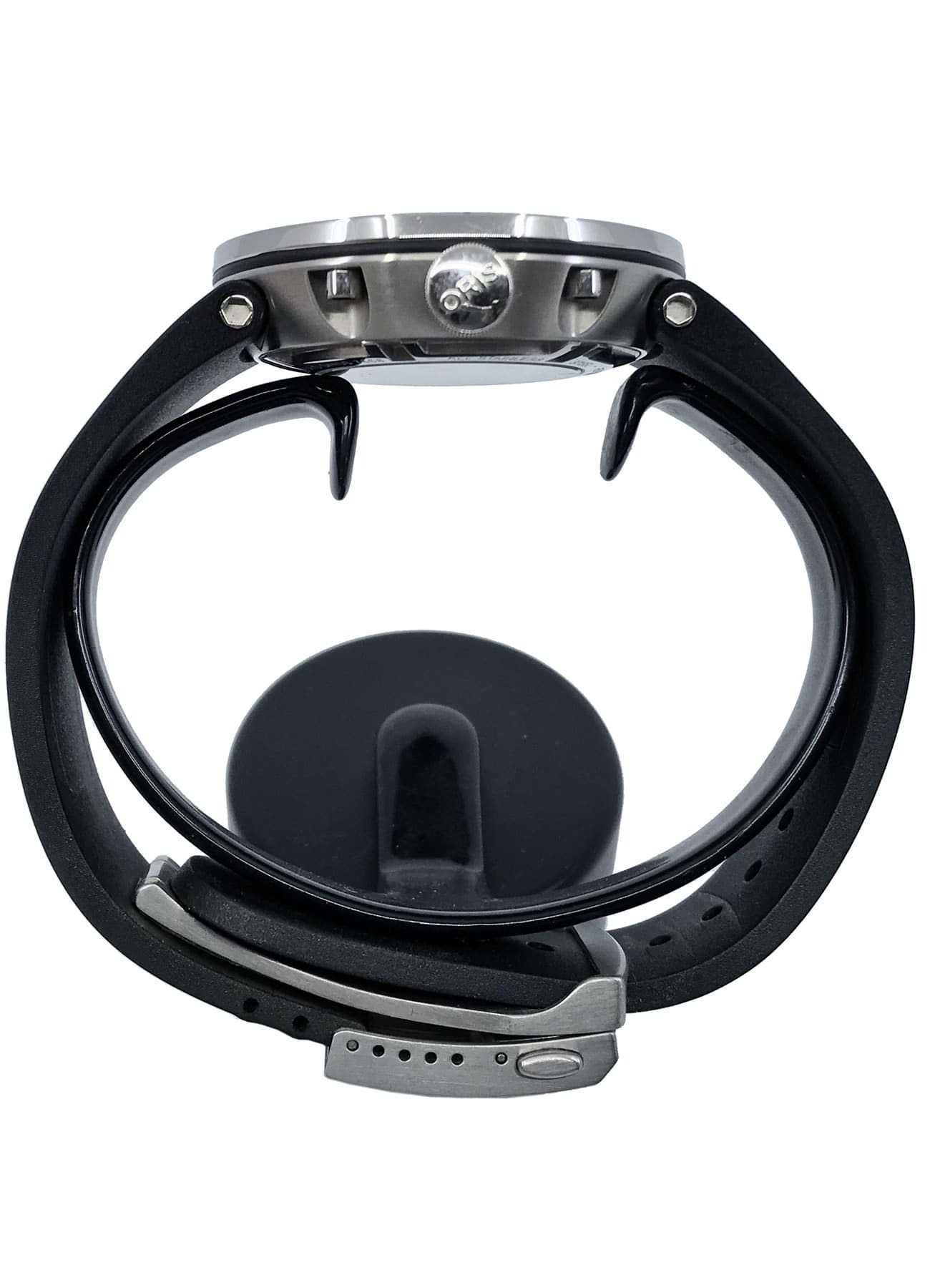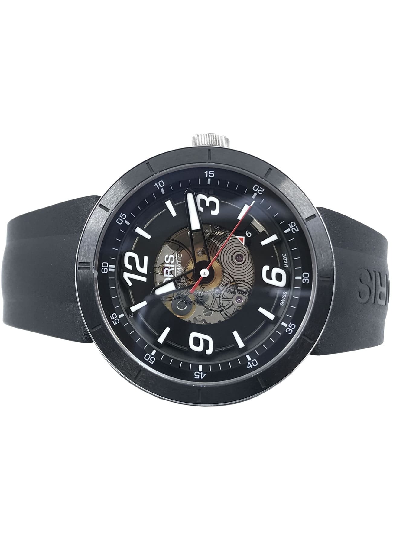 - This timepiece features a 43mm steel case paired with a high quality rubber strap. It showcases a distinctive black dial and is powered by a precise automatic winding movement. The watch is designed with a water resistance of up to 100m.