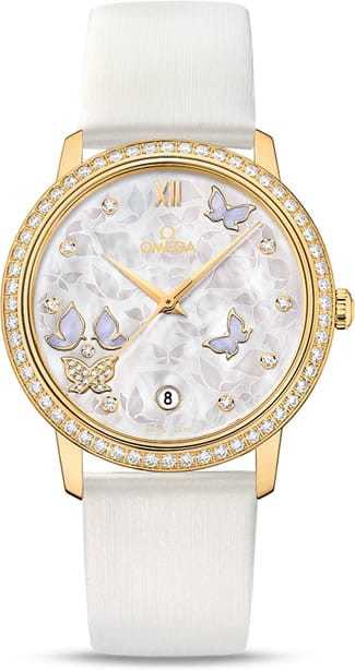 A scratch-resistant sapphire crystal protects this striking dial. The diamond-set bezel is mounted on a 36.8 mm 18K yellow gold case and is presented on a white satin-brushed leather strap with a mother-of-pearl effect. At the heart of this timepiece is the Co-Axial calibre 2500.