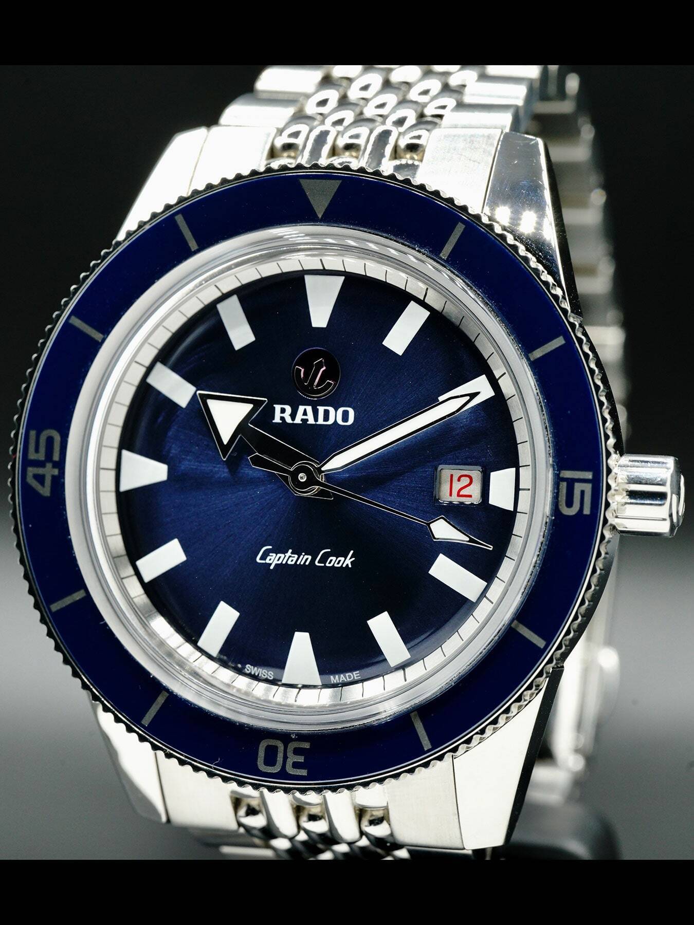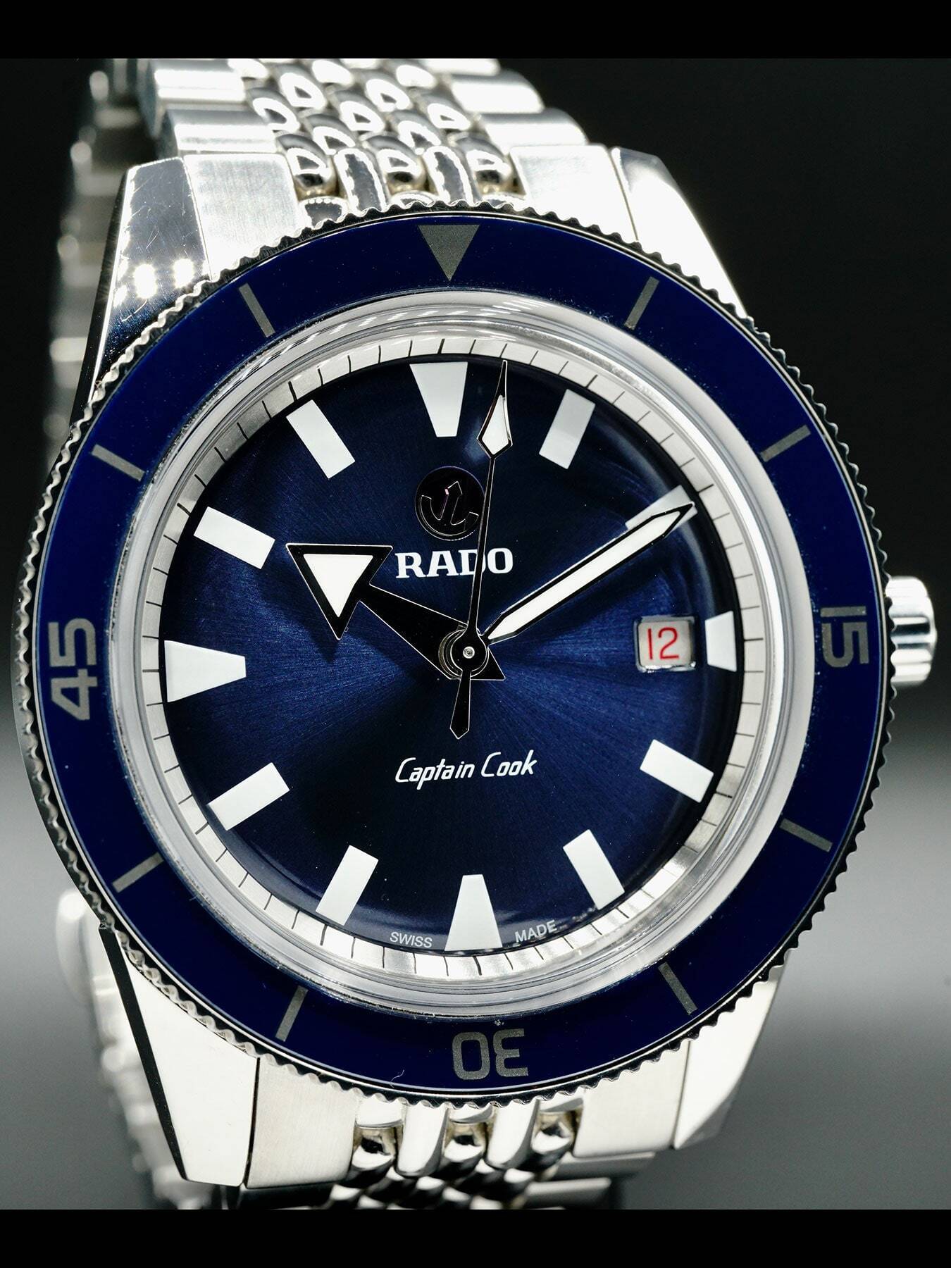 This Rado Captain Cook features a 42mm stainless steel case and a solid case back on a stainless steel bracelet. This watch also showcases a blue dial with luminous hands and dial markers covered by sapphire crystal.
