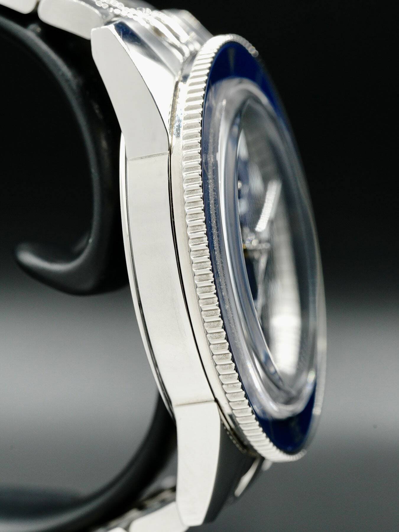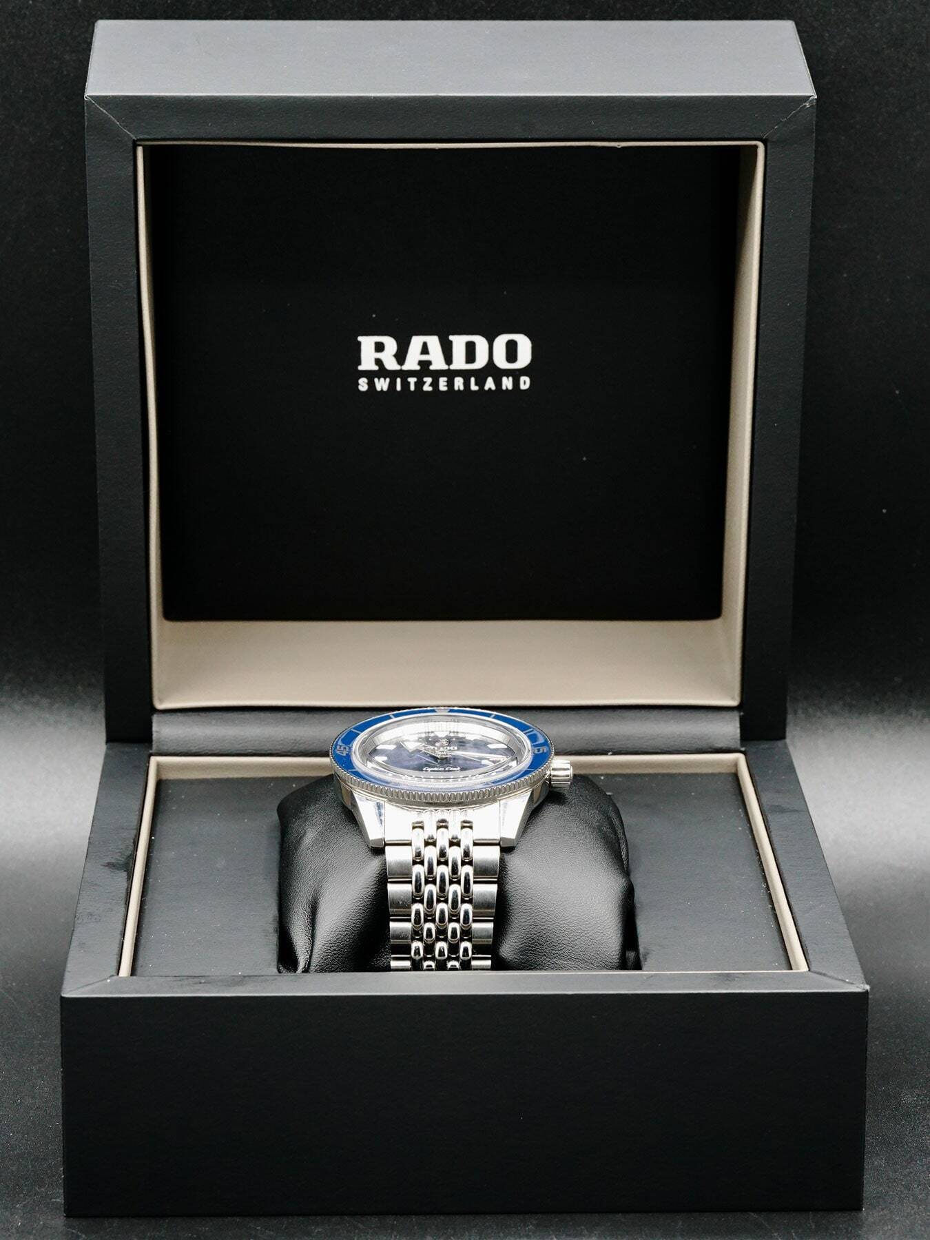 This Rado Captain Cook 763.0505.3 is in EXCELLENT condition. This watch includes its original box, user manual, and customer service booklet. Two extra blue leather straps and stainless steel bracelet links.